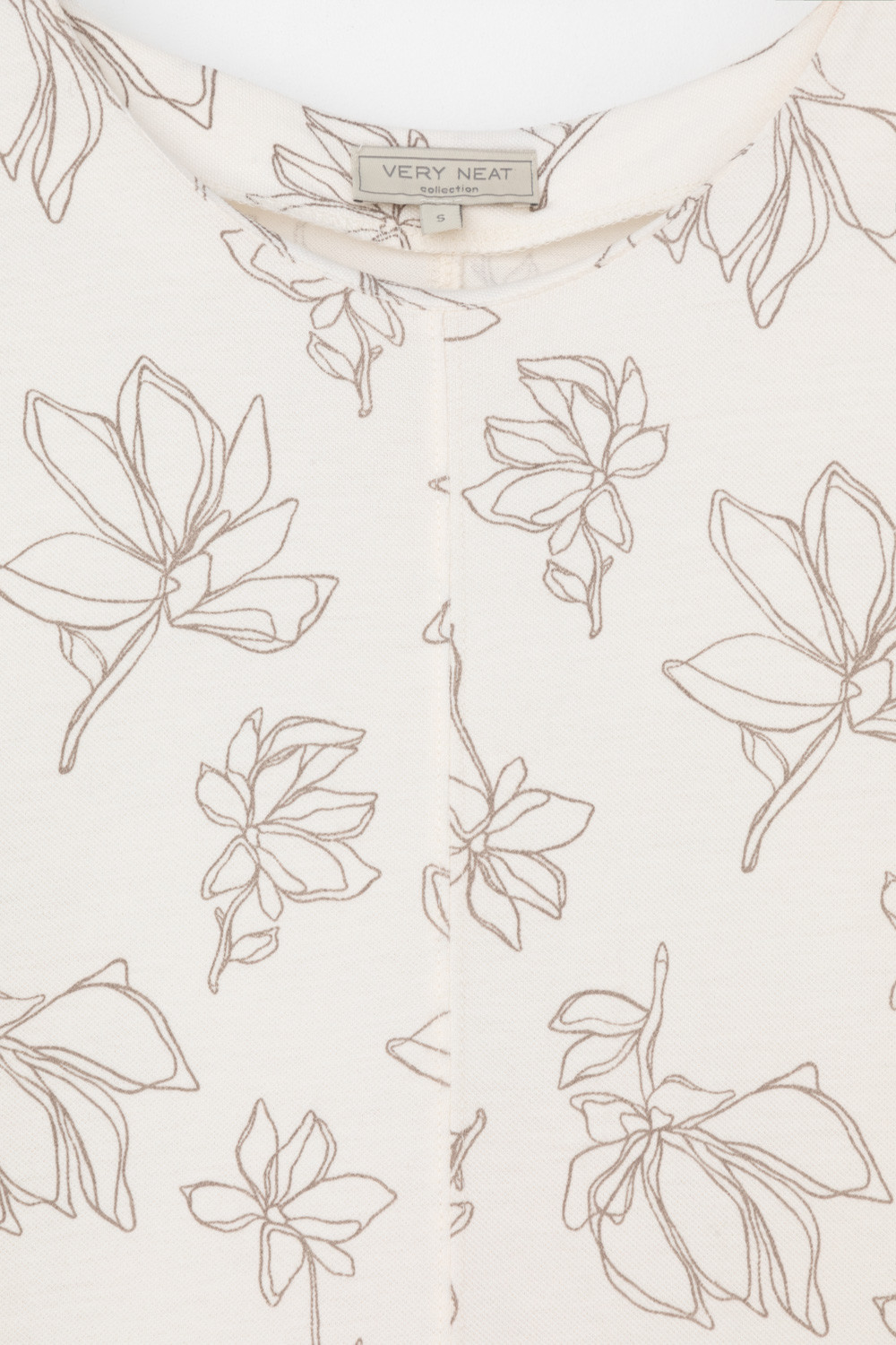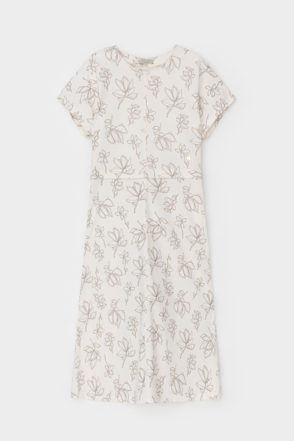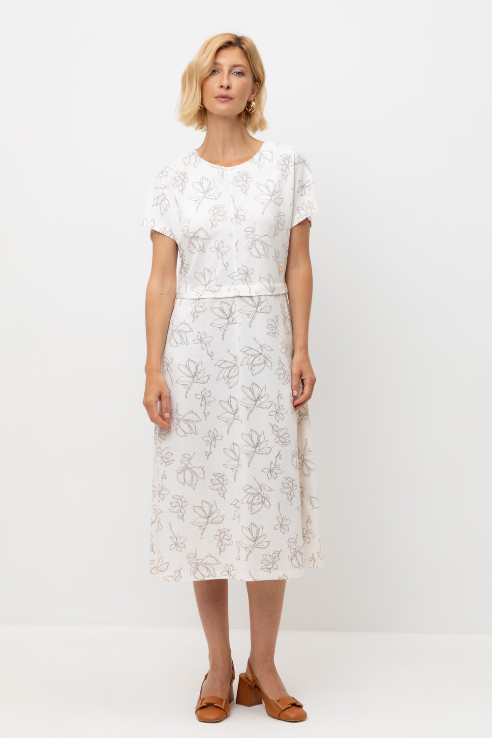 Летнее трикотажное платье, изготовленное из 100% хлопка дарит невероятное ощущение комфорта и легкости. Спущенный цельнокроеный рукав в сочетании с нежными магнолиями придает изделию романтический образ.