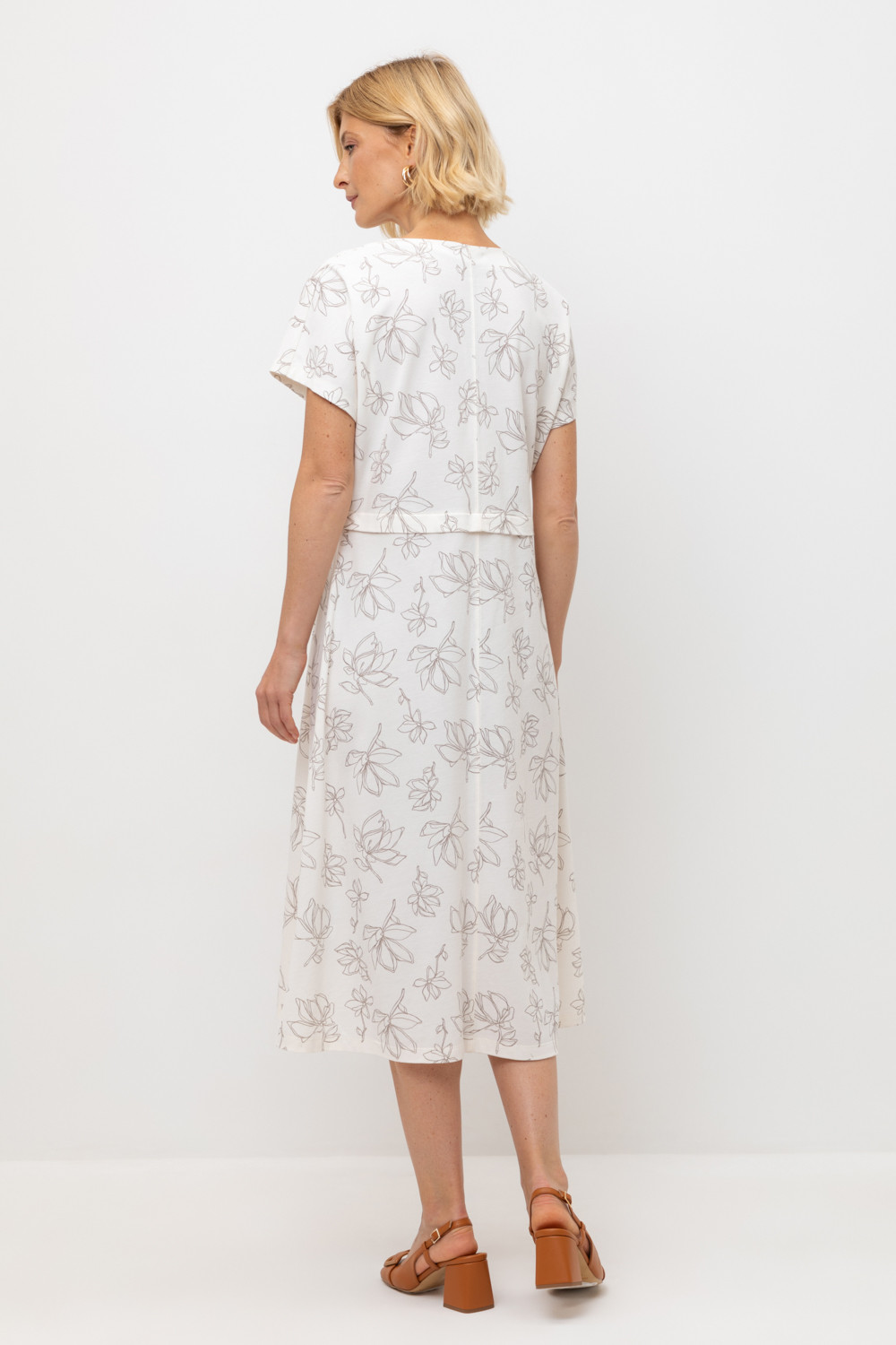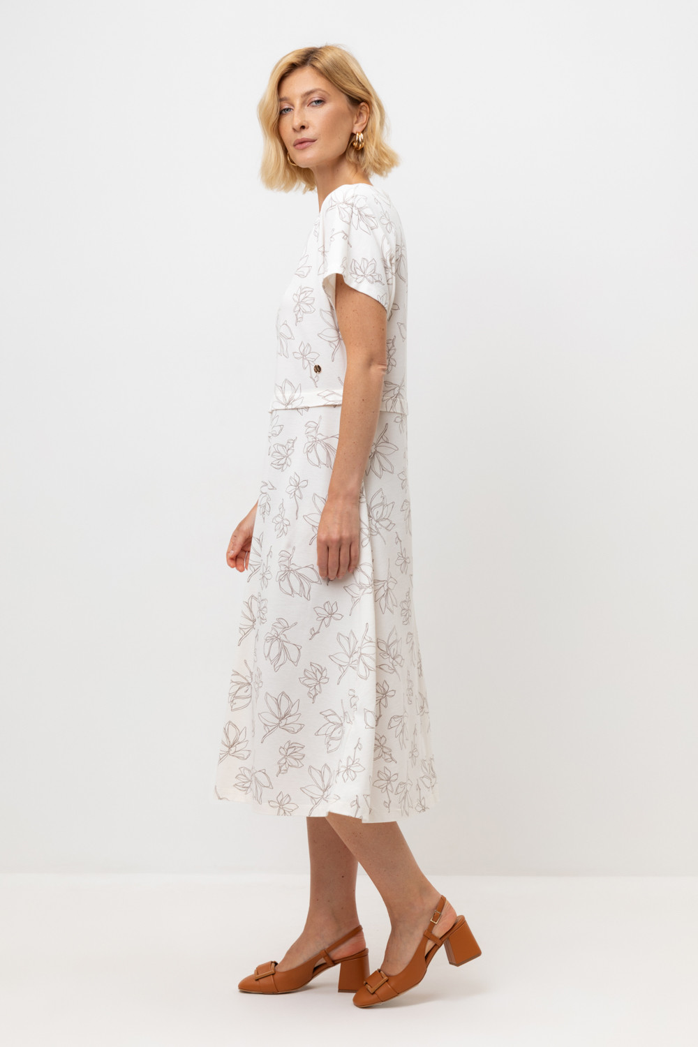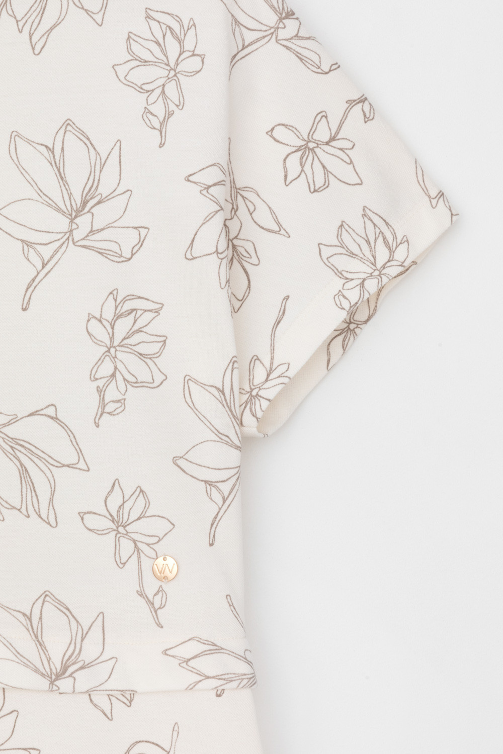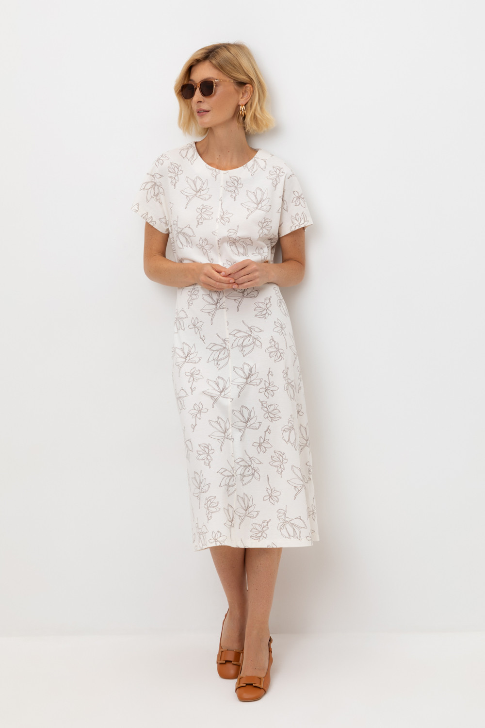 Летнее трикотажное платье, изготовленное из 100% хлопка дарит невероятное ощущение комфорта и легкости. Спущенный цельнокроеный рукав в сочетании с нежными магнолиями придает изделию романтический образ.