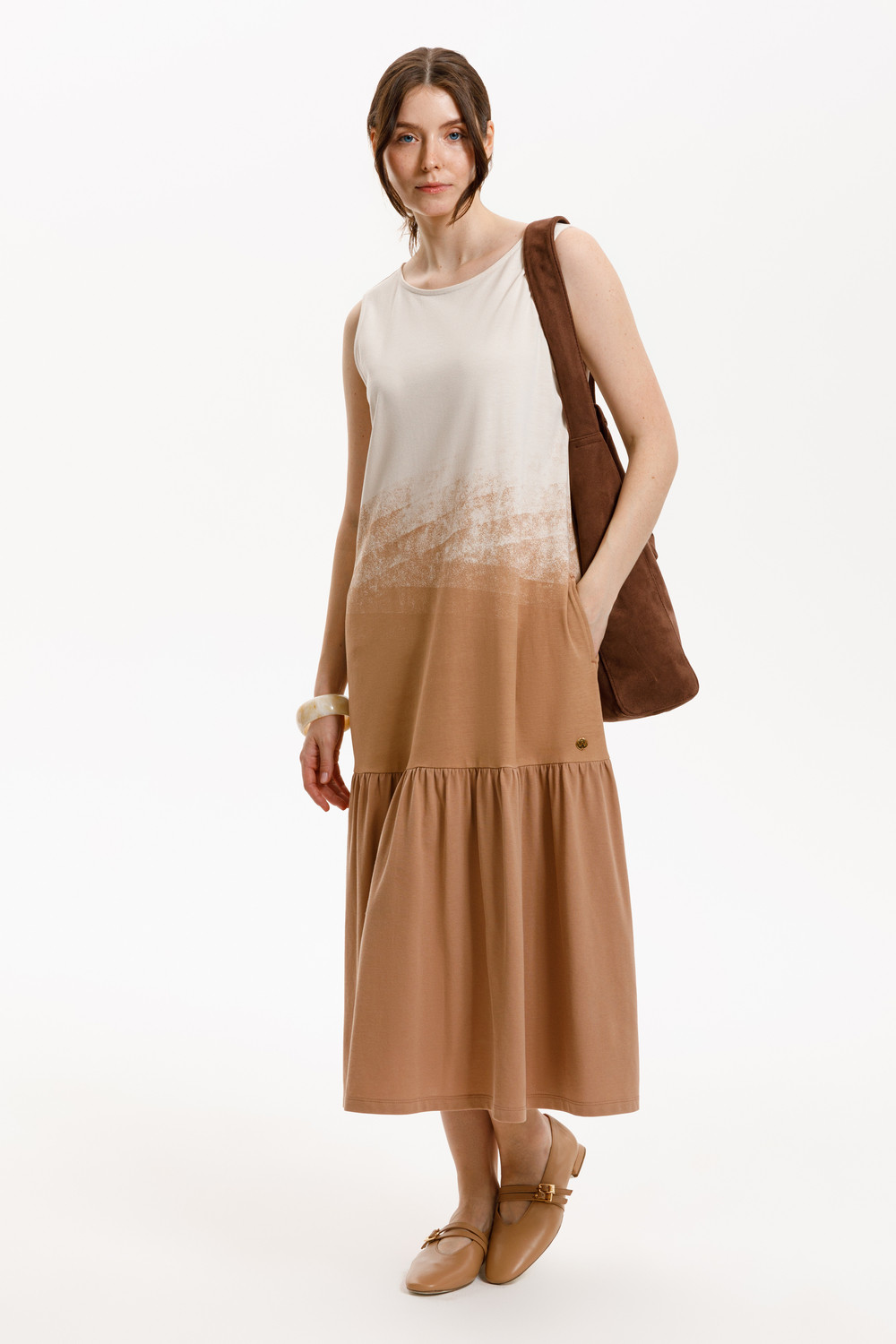 Стильный летний сарафан в трендовом оттенке выполнен из трикотажа с легкой рельефной фактурой, а 100% хлопок в составе дарит ощущение комфорта. Боковые карманы добавляют изделию функциональности.