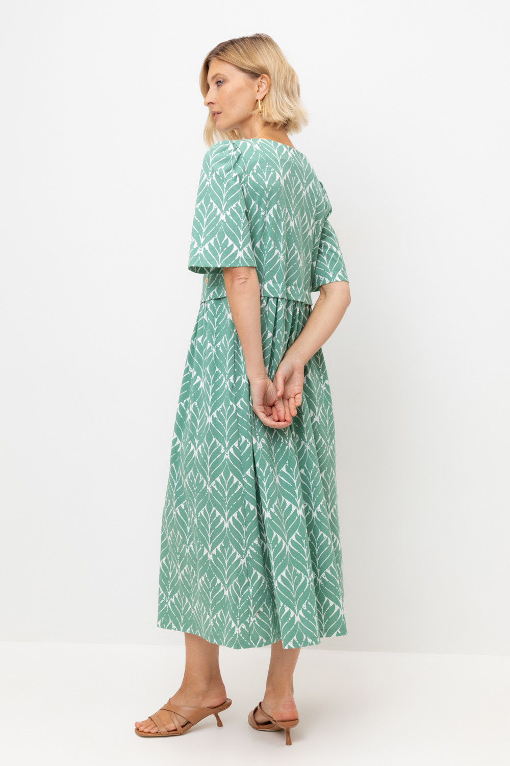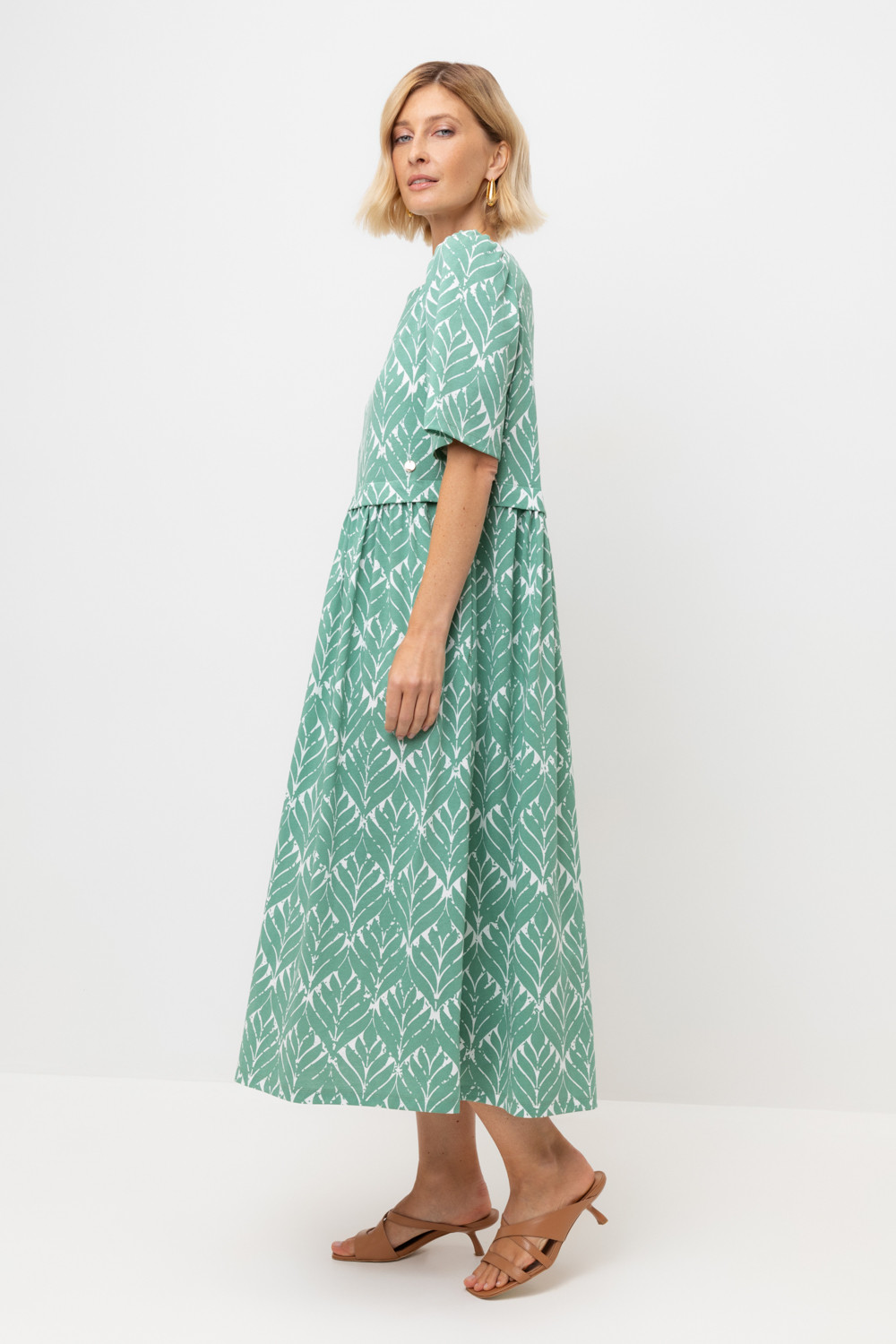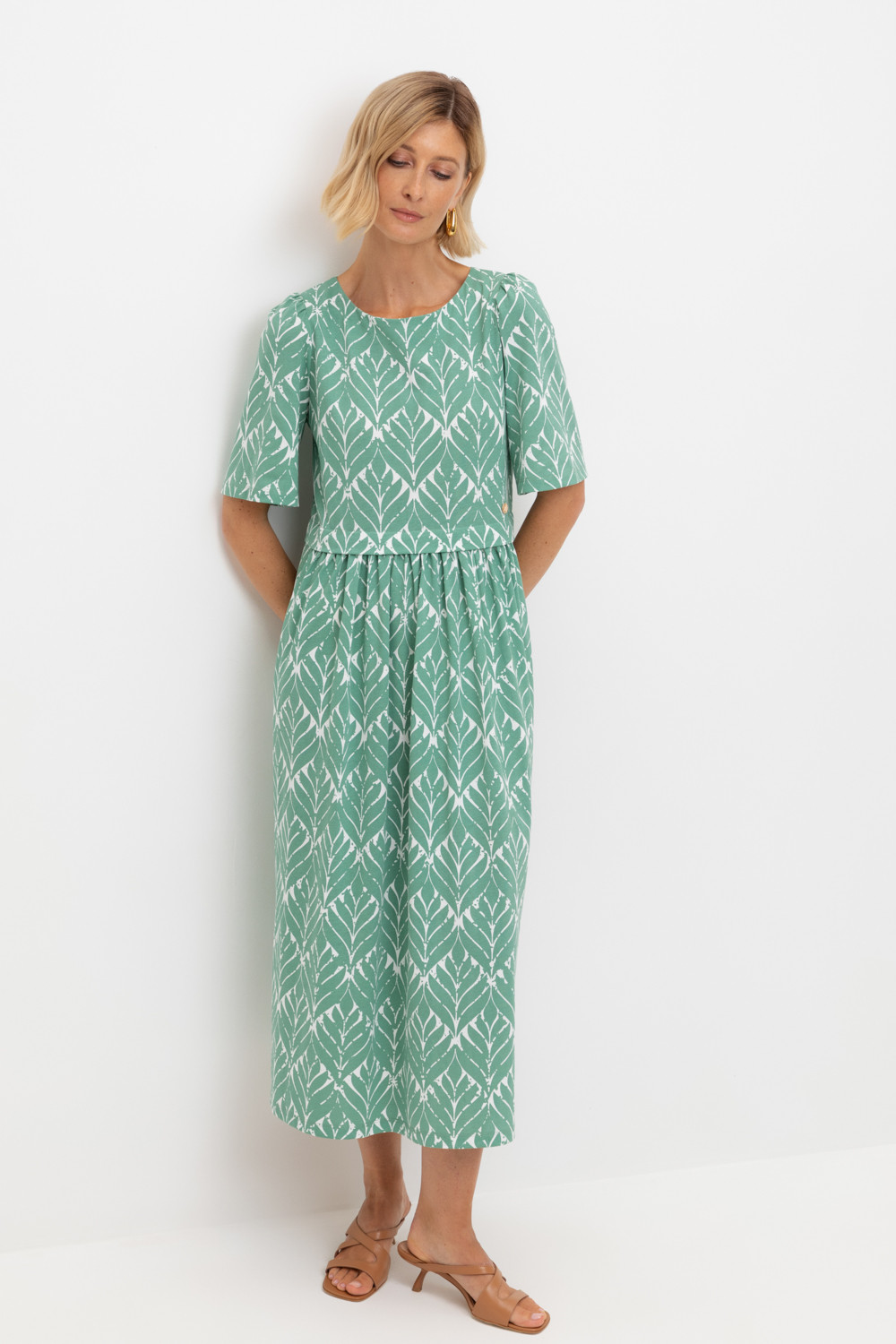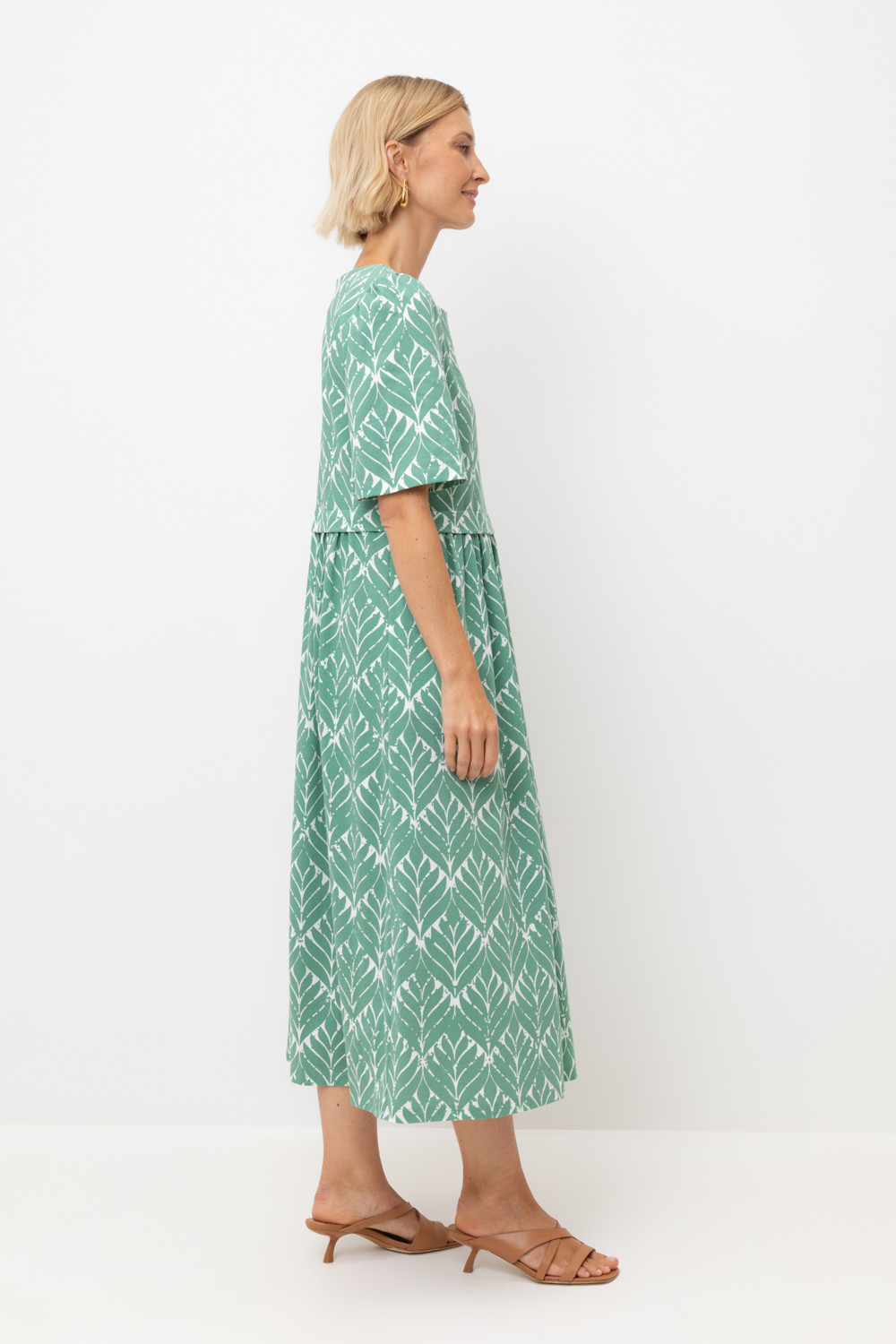 Легкое трикотажное платье из высококачественного гребенного хлопка, который обеспечивает комфорт в жаркую погоду. Свободу движения придает силуэт, сборка по рукаву и поясу романтичности, а наличие боковых карманов - функциональности.