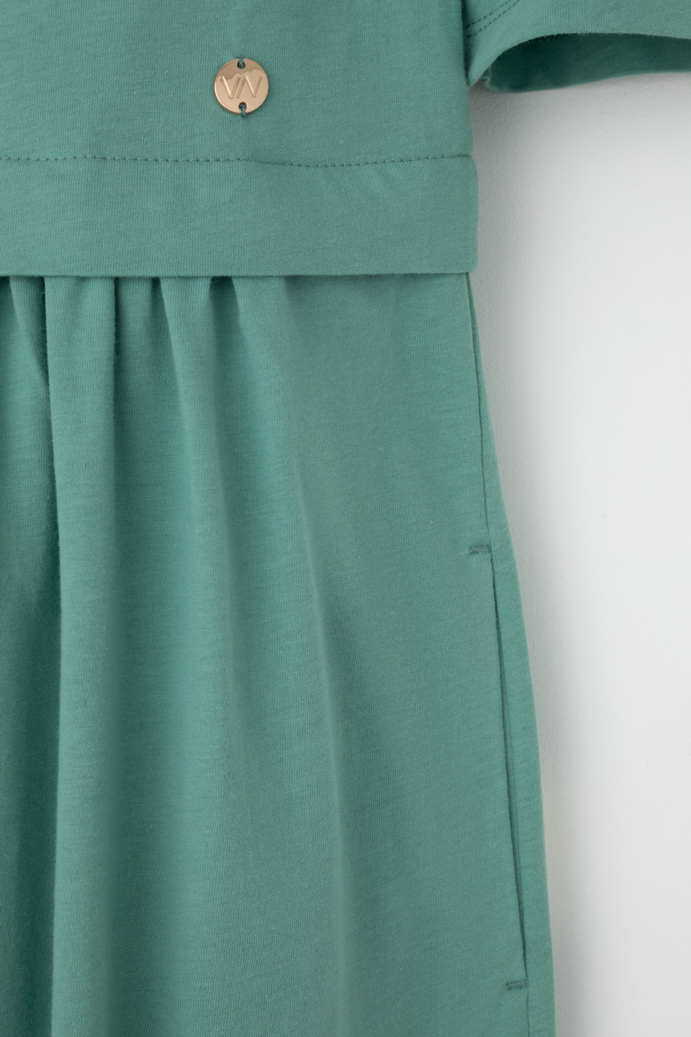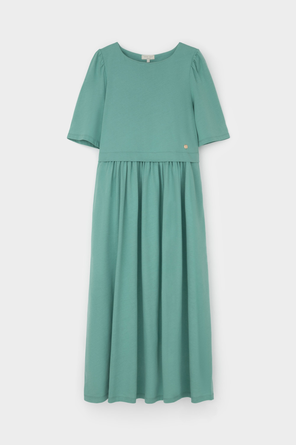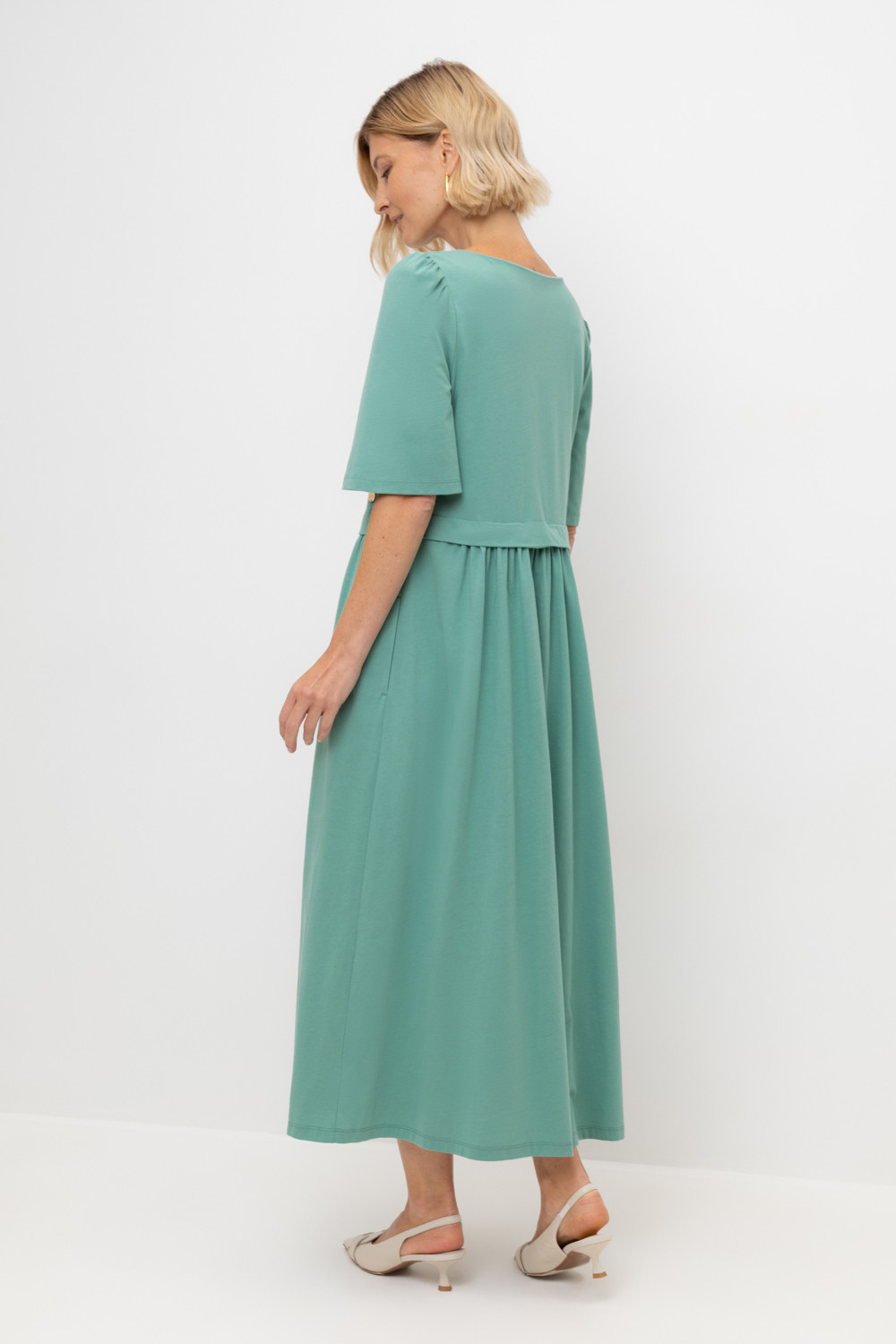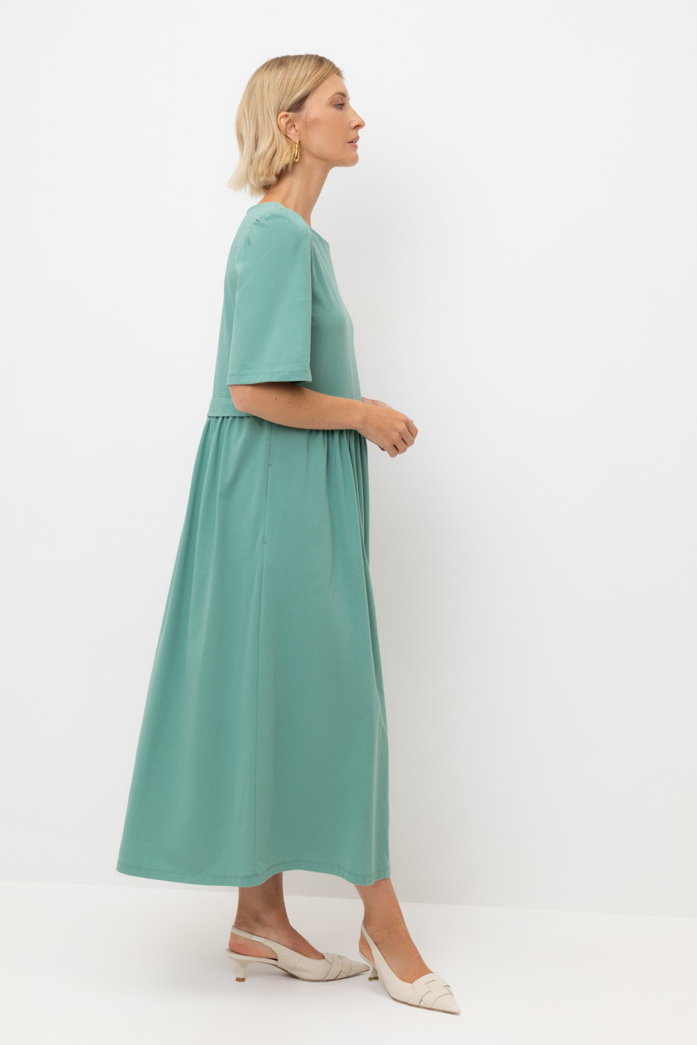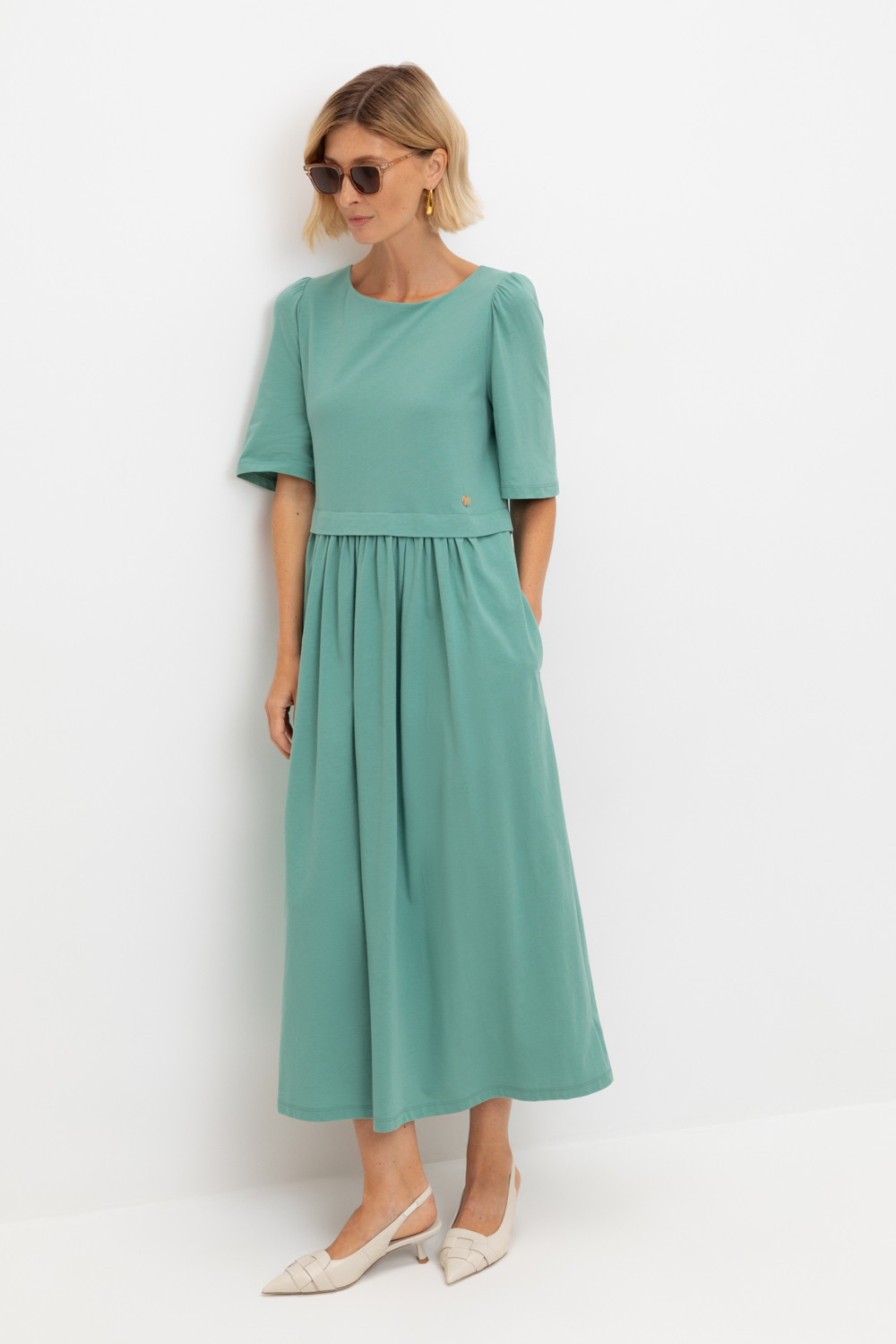 Легкое трикотажное платье из высококачественного гребенного хлопка, который обеспечивает комфорт в жаркую погоду. Свободу движения придает силуэт, сборка по рукаву и поясу романтичности, а наличие боковых карманов - функциональности.