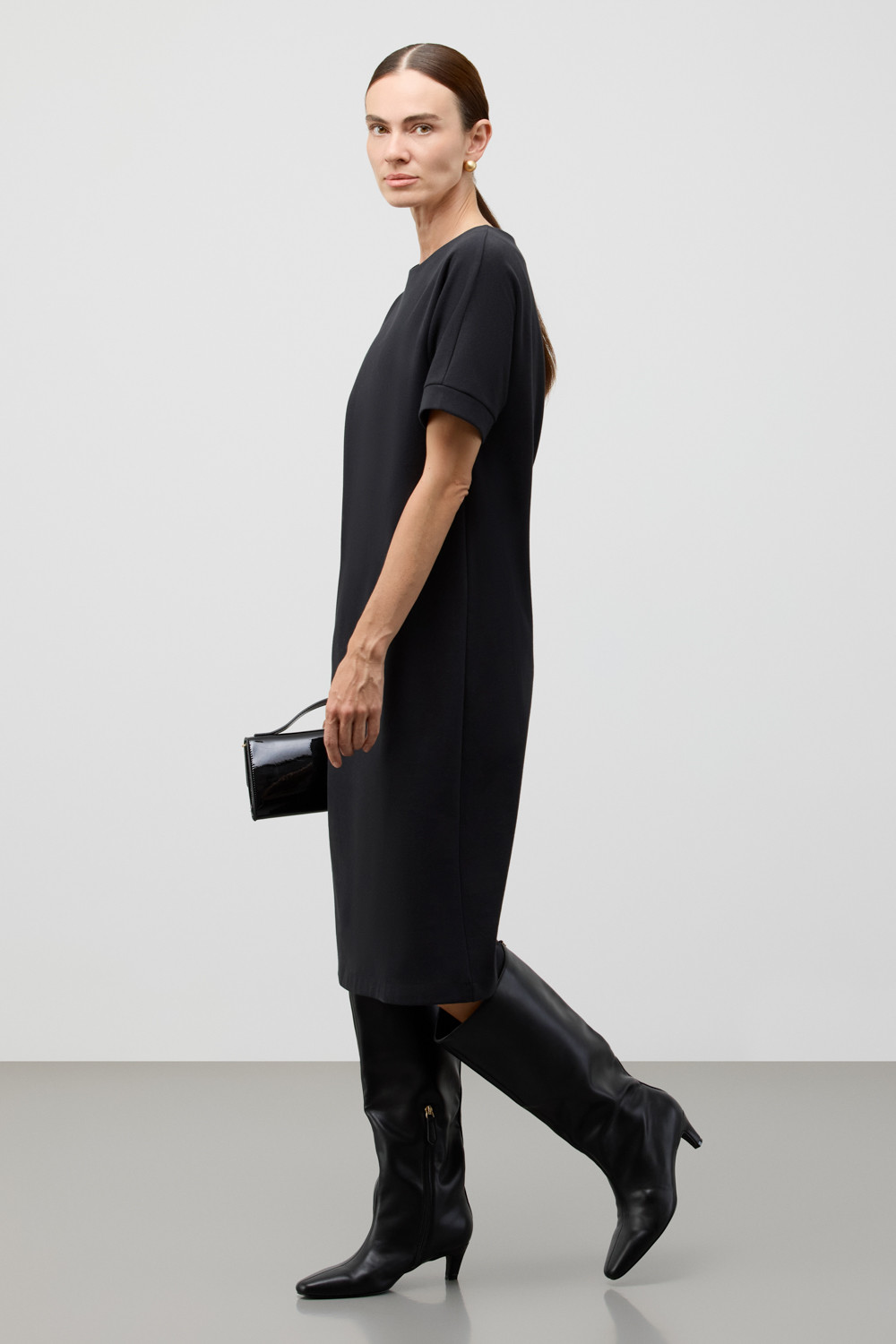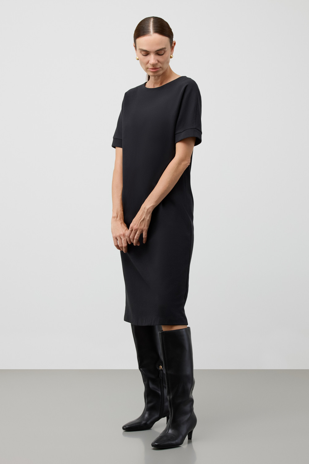 Платье прямого силуэта, выполненное из высококачественного трикотажного полотна DOUBLE FACE с добавлением спандекса. Прямой крой акцентирует внимание на фигуре, формируя элегантный классический стиль.