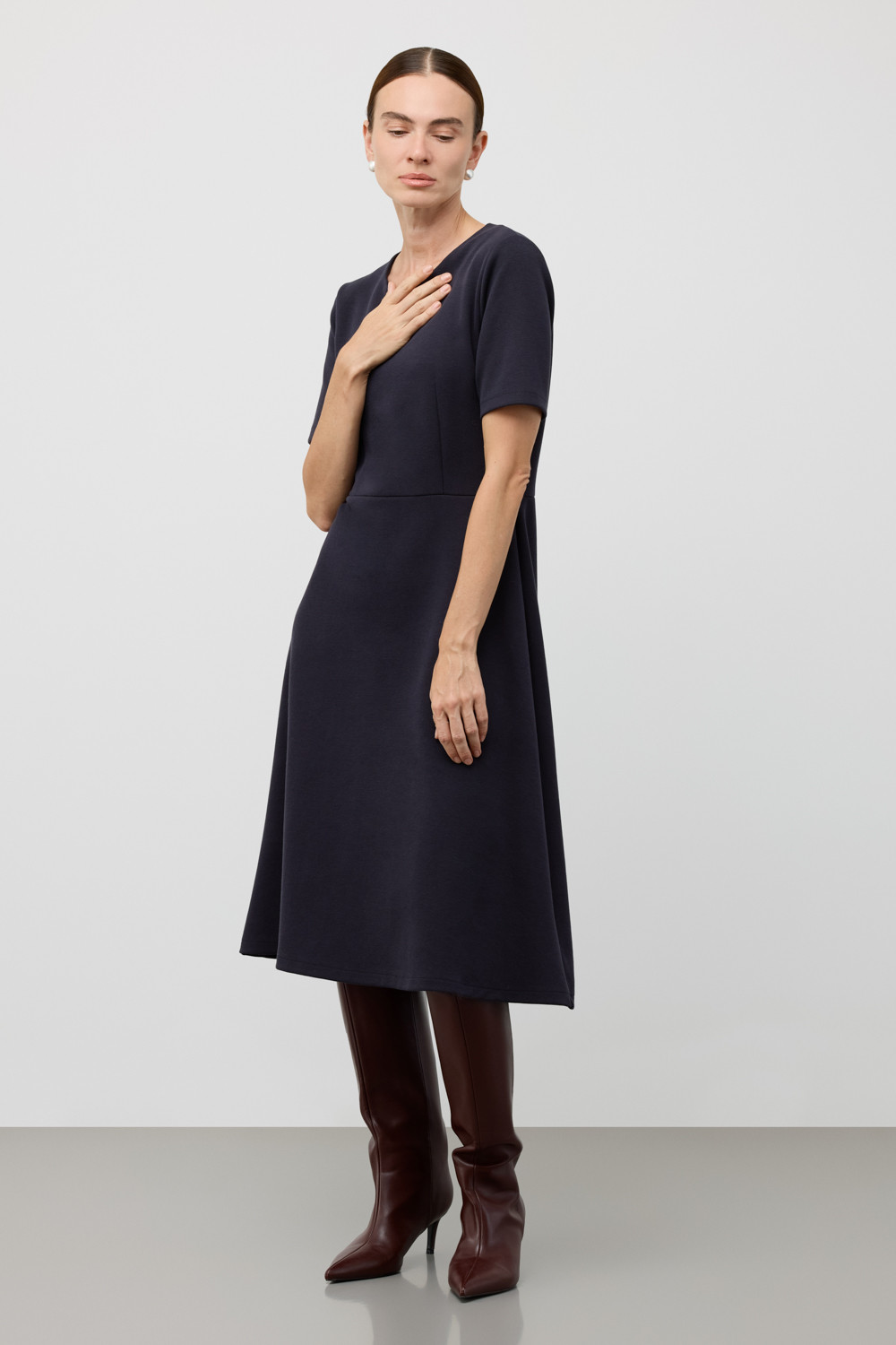 Платье выполнено из инновационного трикотажного материала, называемого рибана DOUBLE FACE. Этот вид полотна отличается особой вязкой, что обеспечивает ему превосходную эластичность и мягкость.