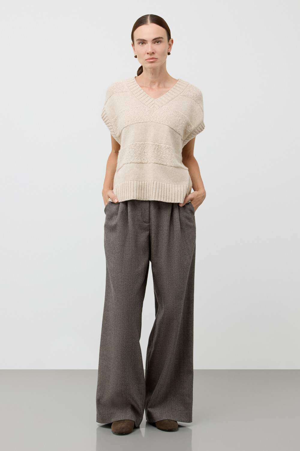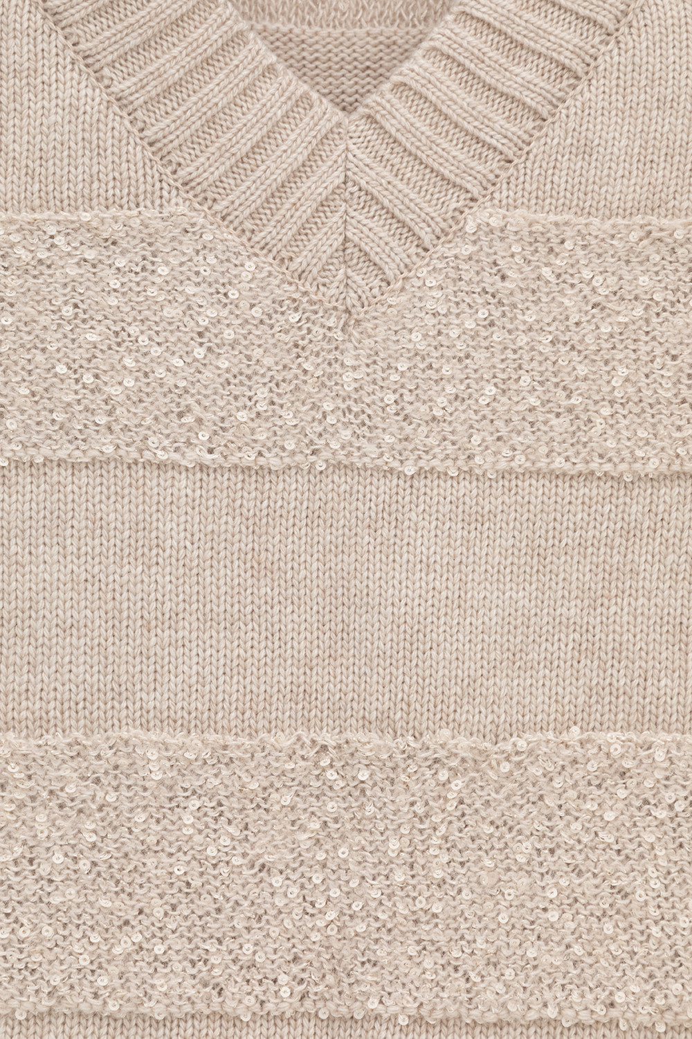 Жилет из изысканной пряжи с пайетками. Уникальное сочетание натуральных волокон обеспечивает непревзойденную мягкость. Меринос отлично удерживает тепло, альпака дарит легкость и воздушность, кашемир придает шелковистость, а вискоза приятный блеск. Нежные пайетки ненавязчиво мерцают при каждом движении, добавляя Вашему образу утонченную элегантность.