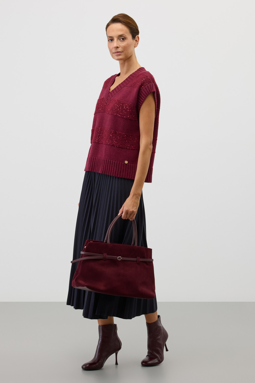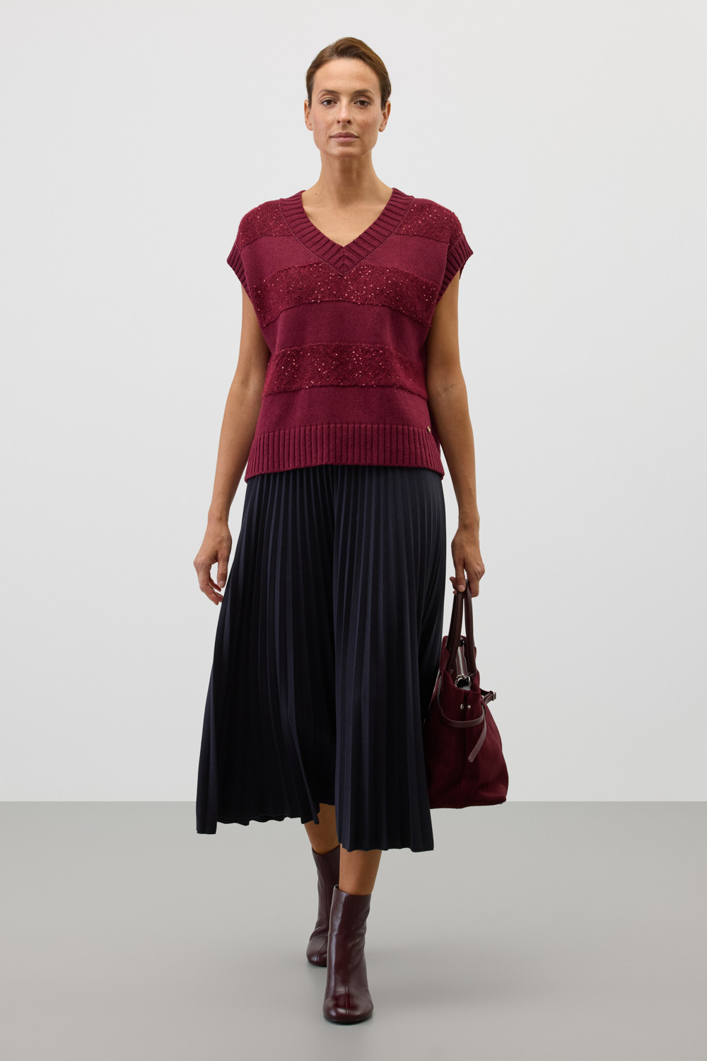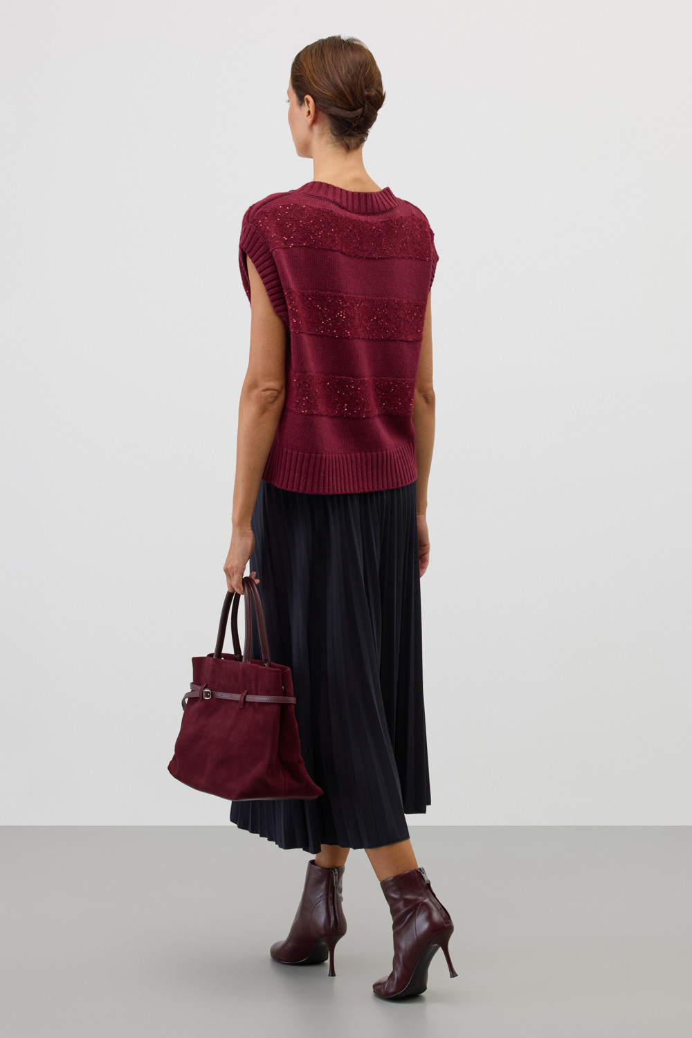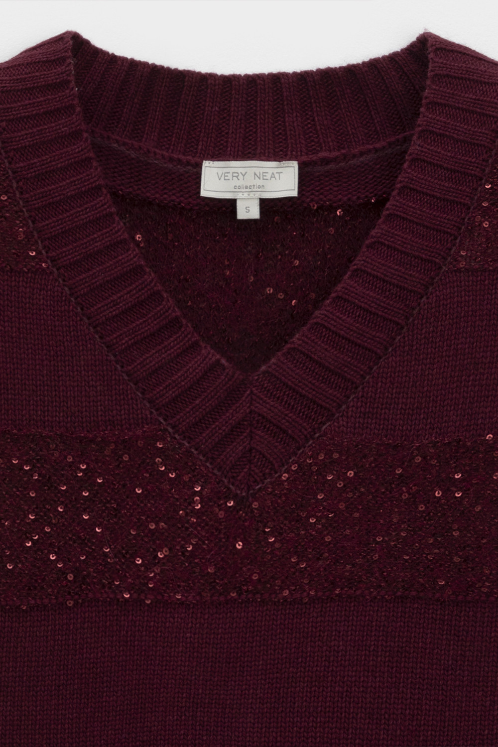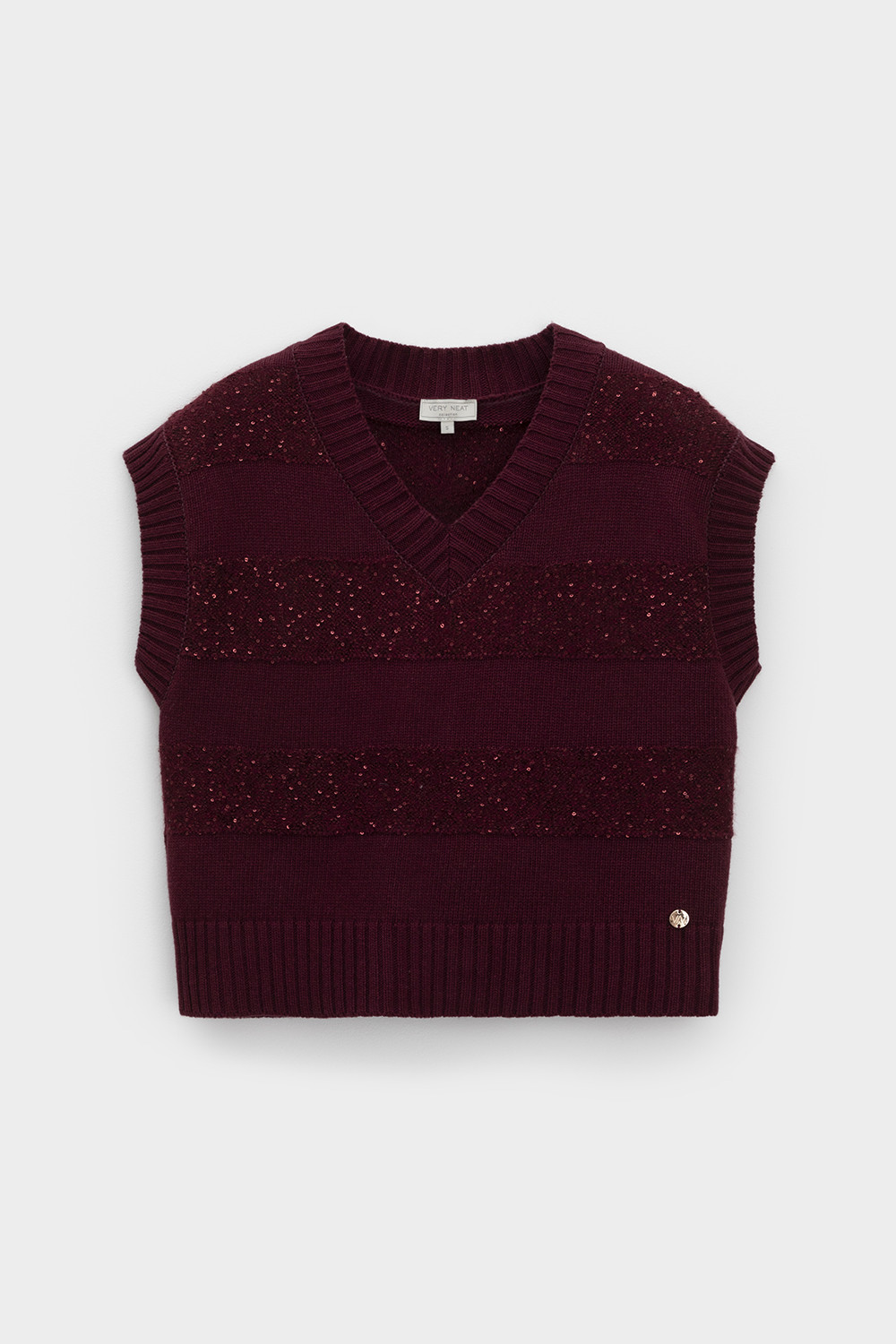 Жилет из изысканной пряжи с пайетками. Уникальное сочетание натуральных волокон обеспечивает непревзойденную мягкость. Меринос отлично удерживает тепло, альпака дарит легкость и воздушность, кашемир придает шелковистость, а вискоза приятный блеск. Нежные пайетки ненавязчиво мерцают при каждом движении, добавляя Вашему образу утонченную элегантность.