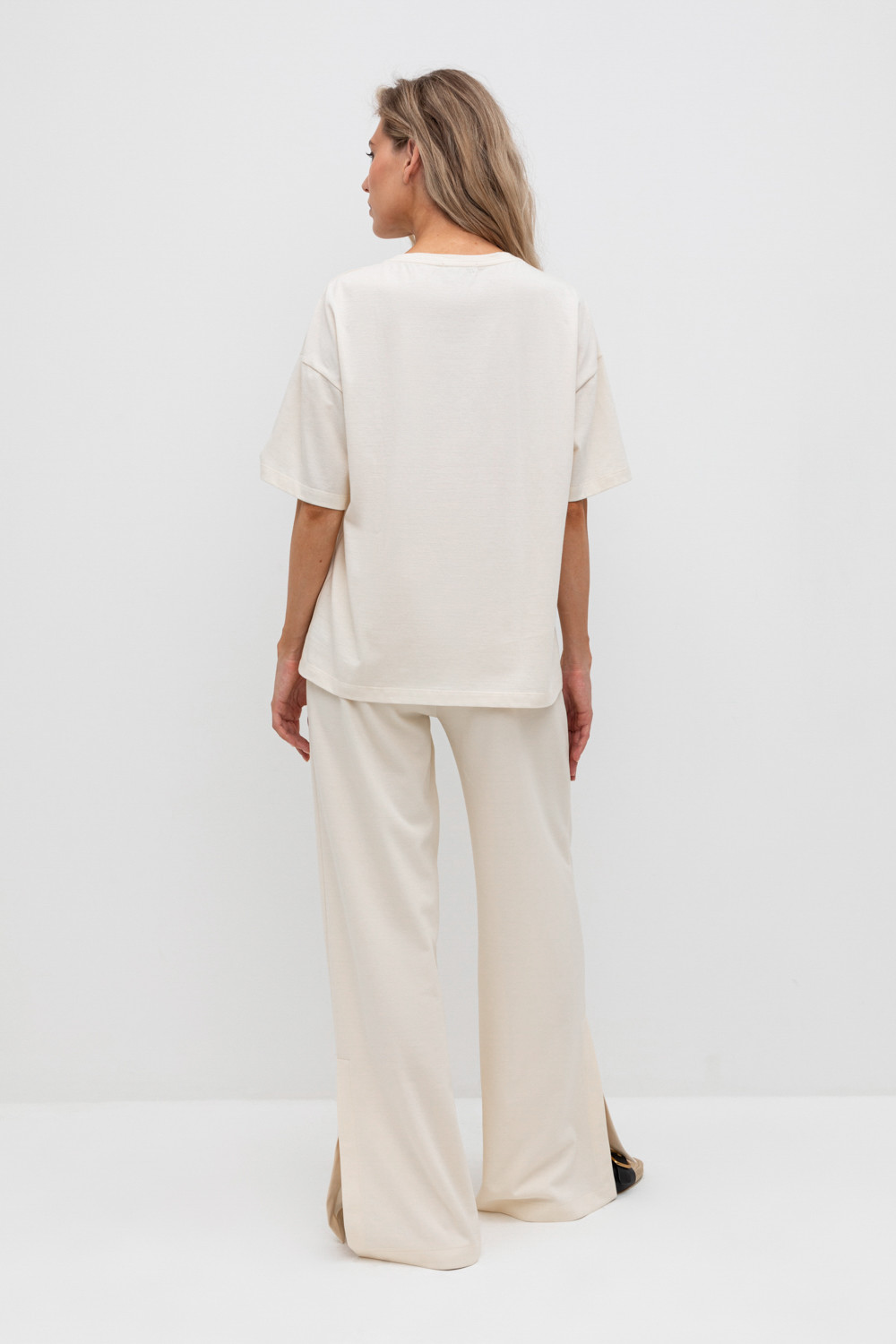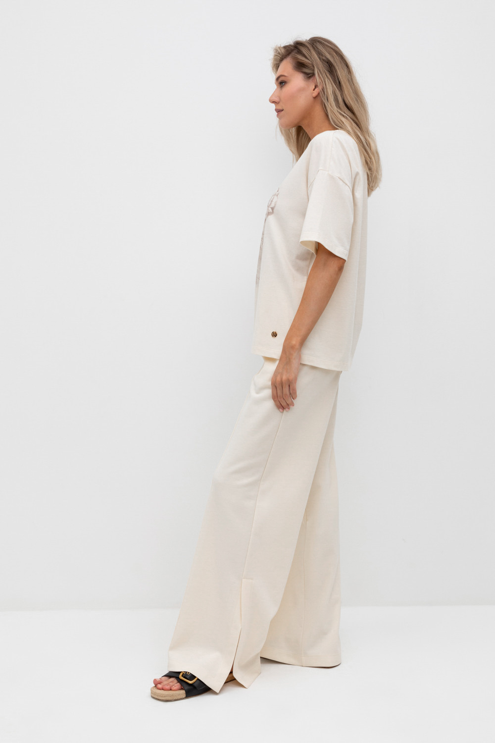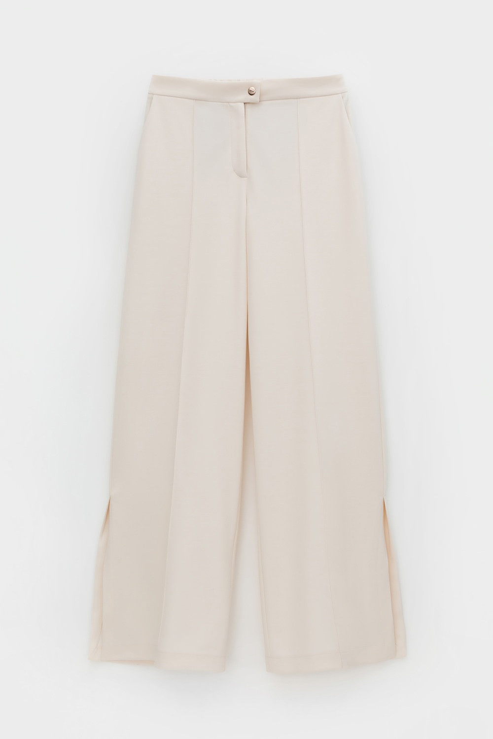 Свободные женские брюки с разрезами и боковыми карманами из плотного гладкого трикотажа интерлок. Низ обработан плоскими швами.