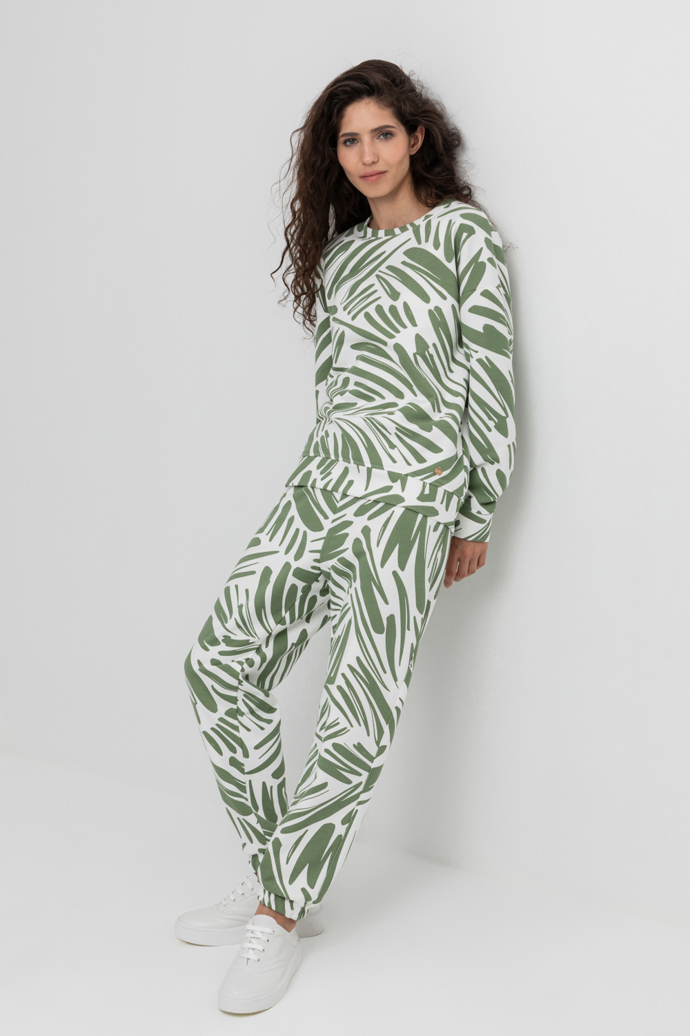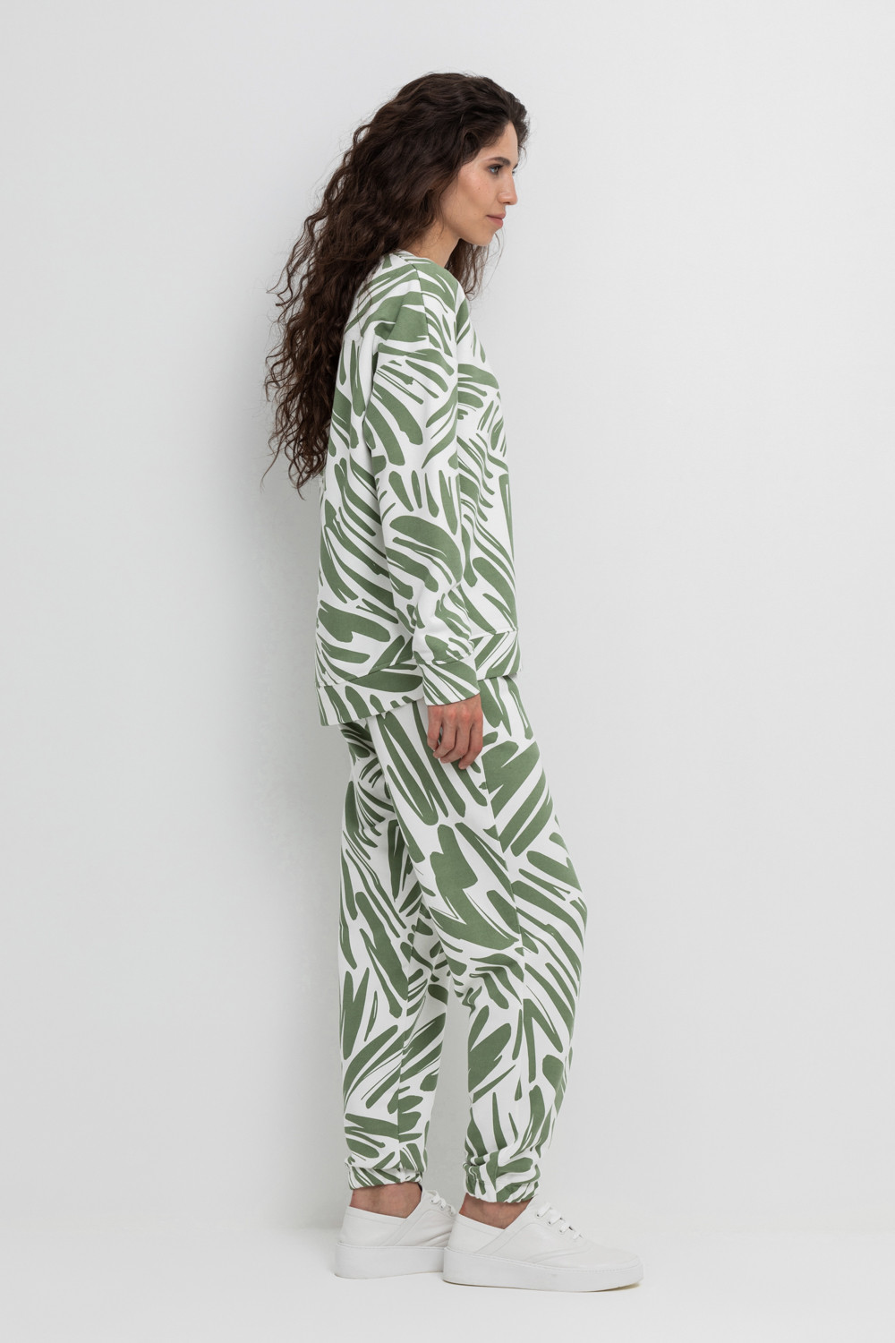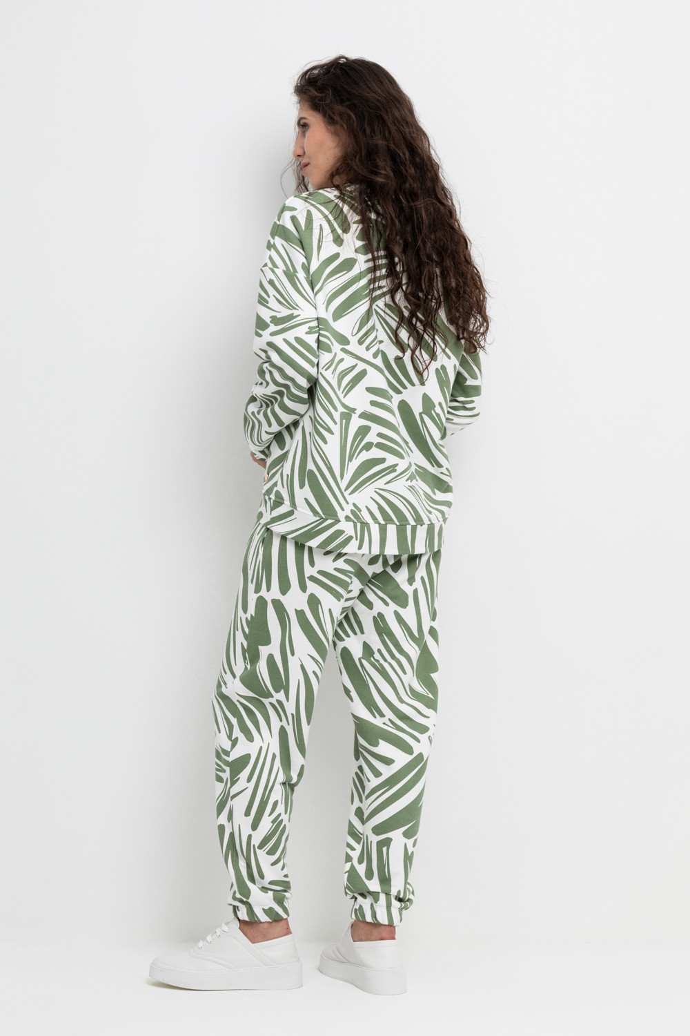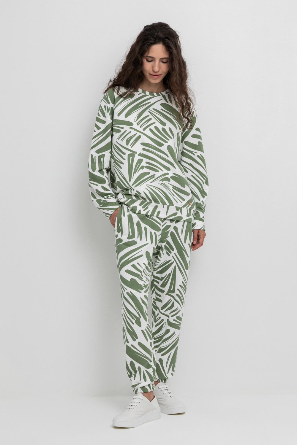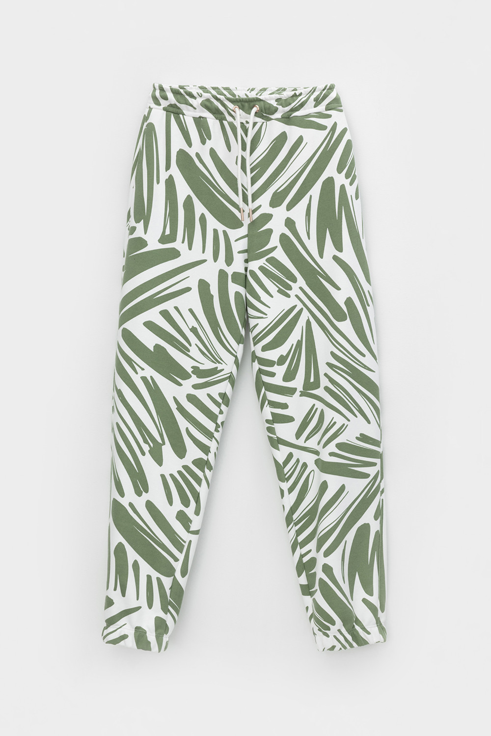 Теплые брюки с манжетами на резинке и боковыми карманами из мягкого набивного трикотажного футера трёхнитки. Пояс со шнурком позволяет регулировать посадку.