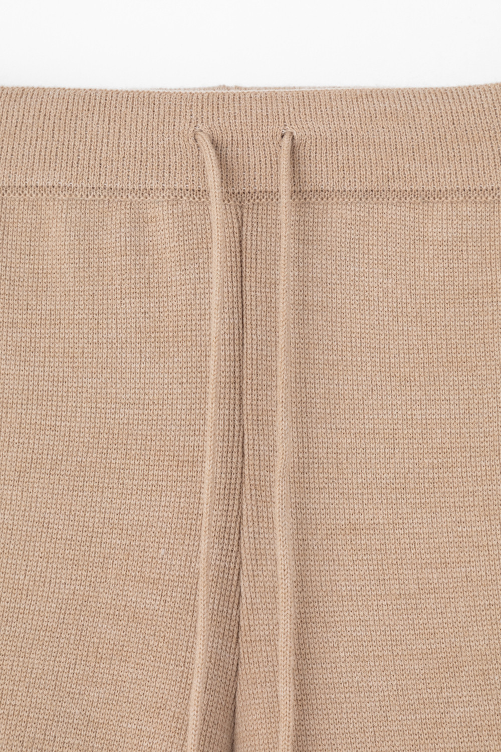 Пояс регулируется вязаным шнуром в тон брюк. Плотная фактура вязания согревает и сохраняет форму во время носки.