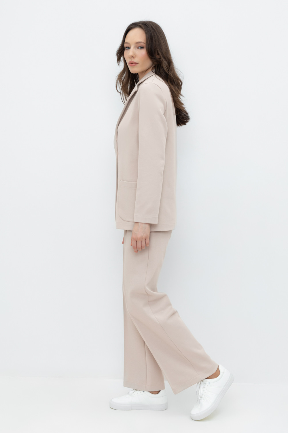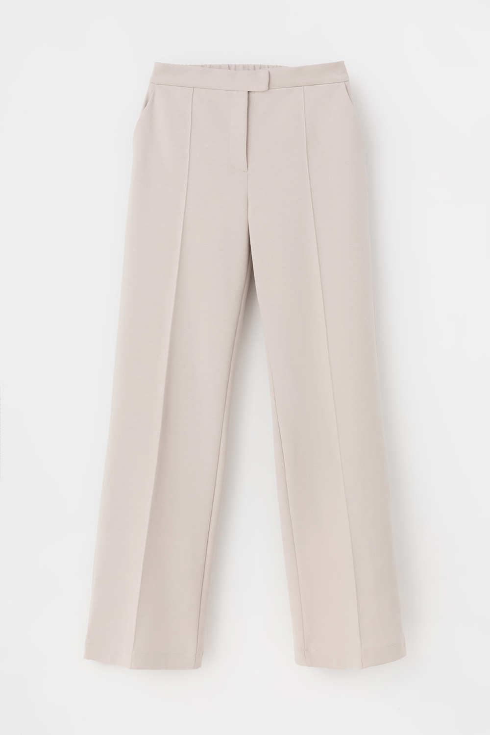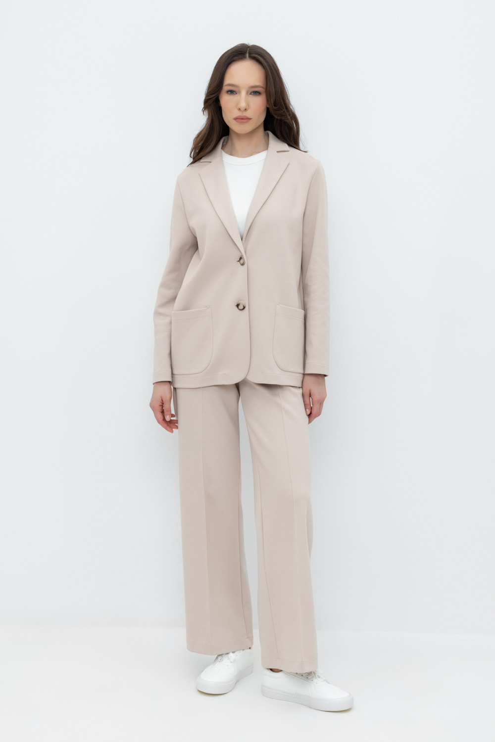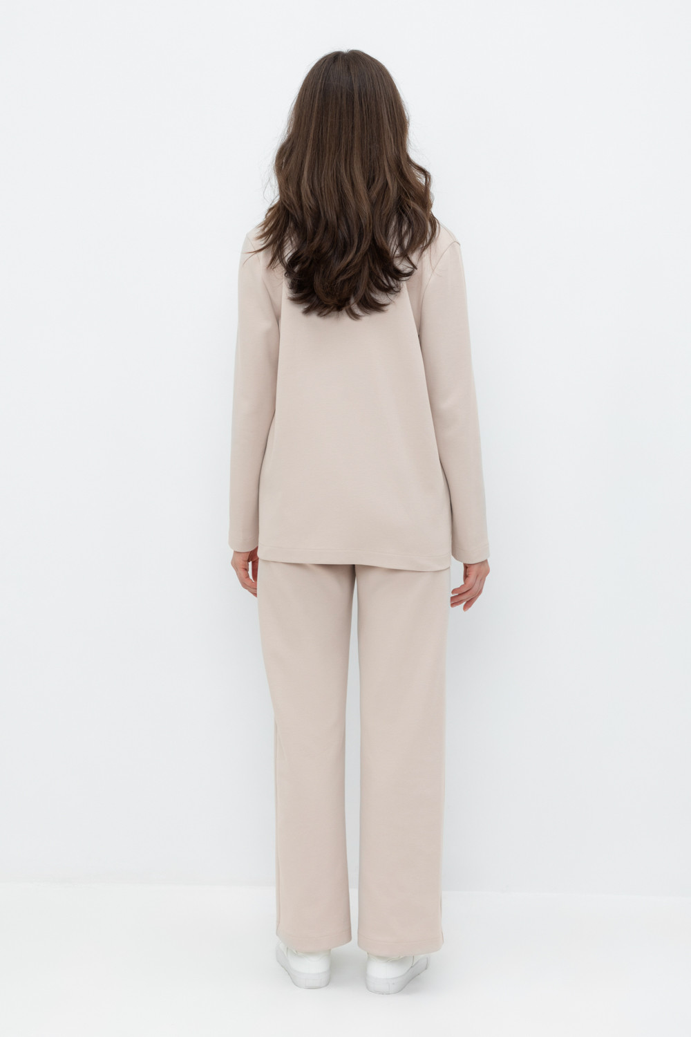 Свободные женские брюки со стрелкой и боковыми карманами из плотного гладкого трикотажа интерлок. Застежка на кнопку. Низ обработан плоскими швами.