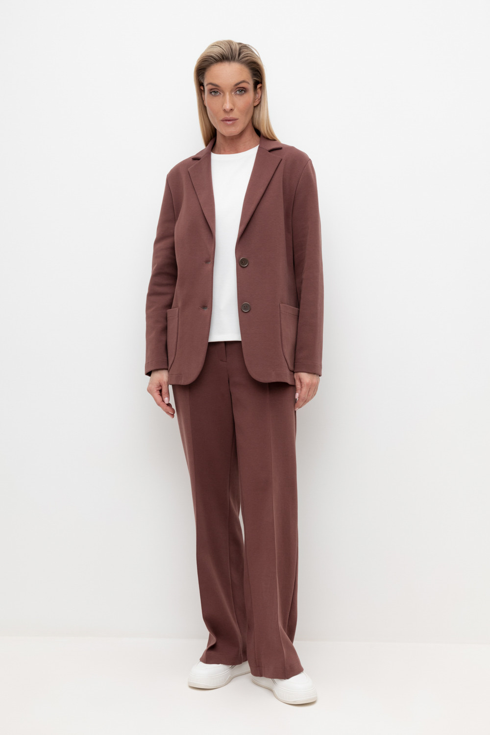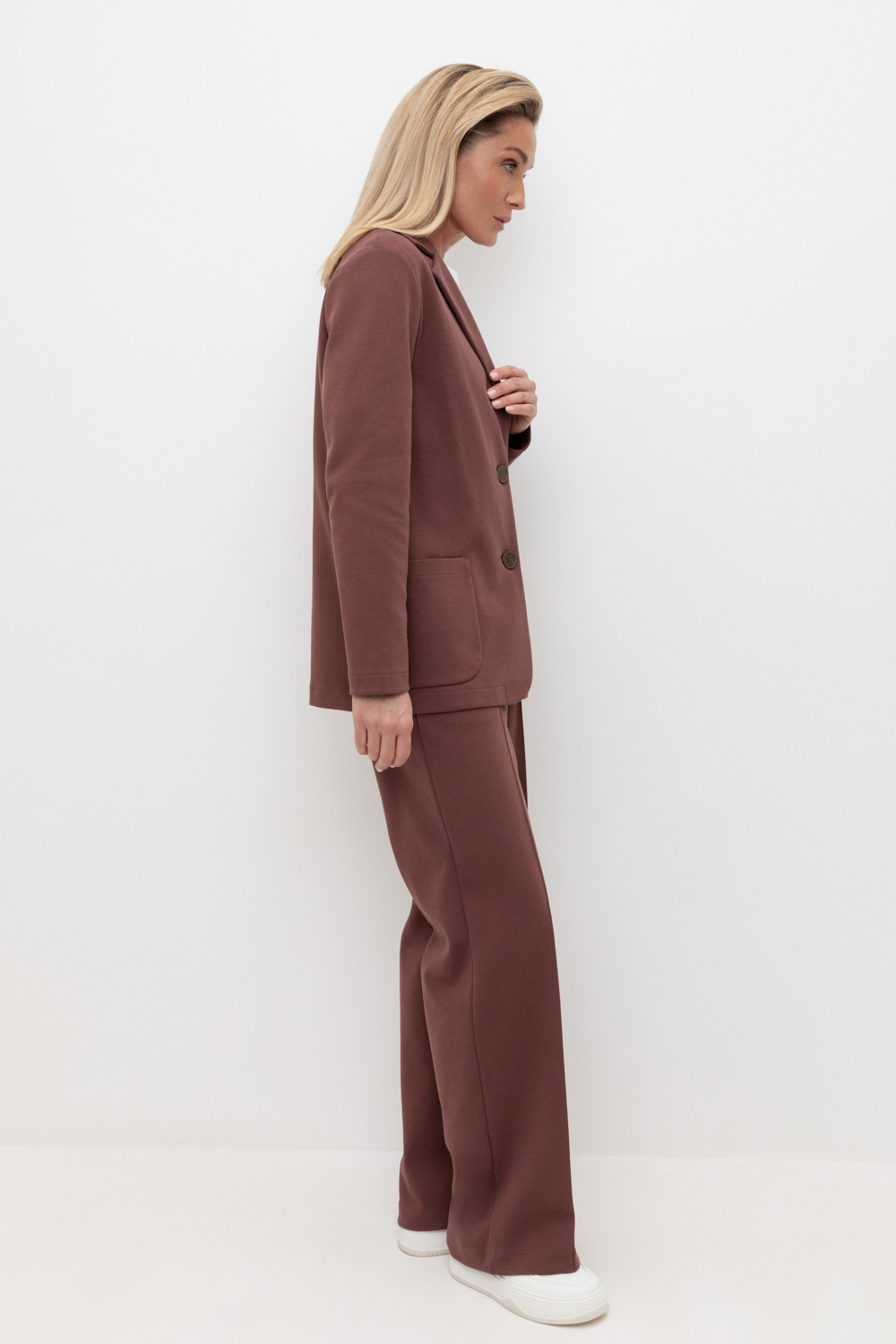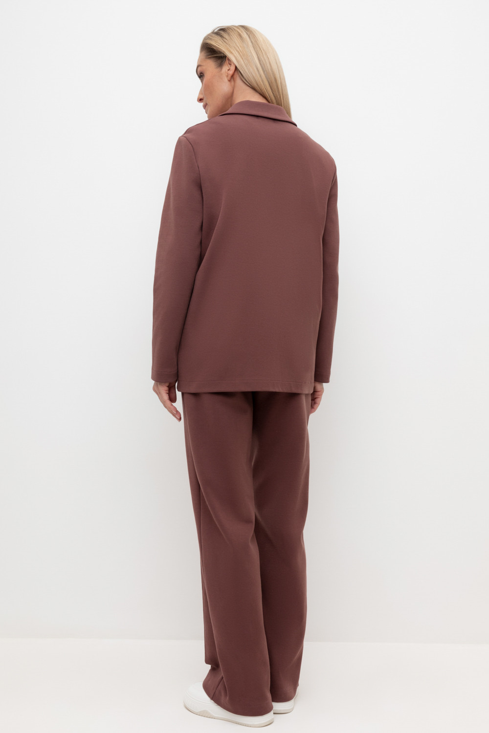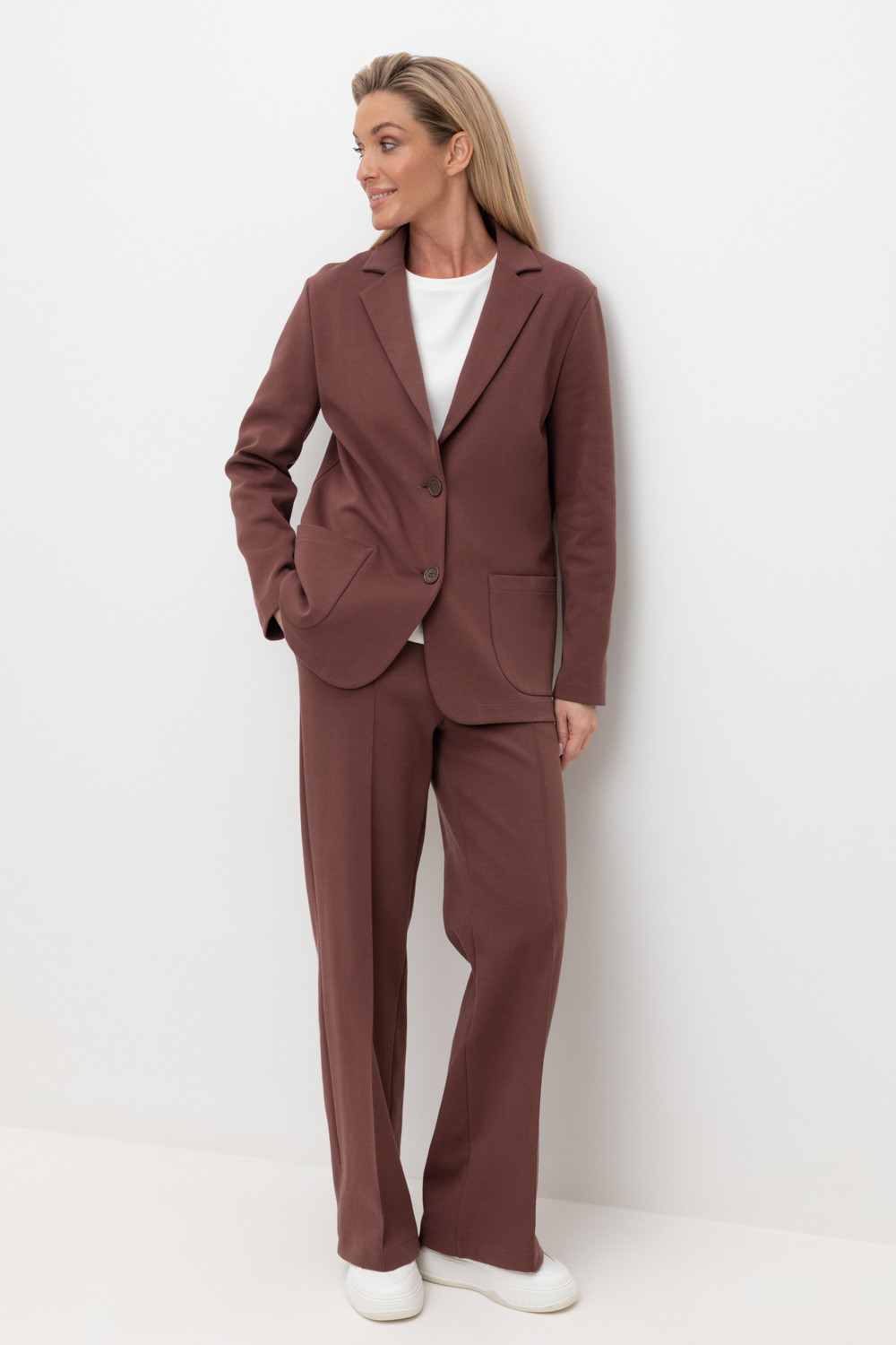 Свободные женские брюки со стрелками и боковыми карманами из плотного гладкого трикотажа интерлок. Застегиваются на молнию и кнопку. Низ обработан плоскими швами.
