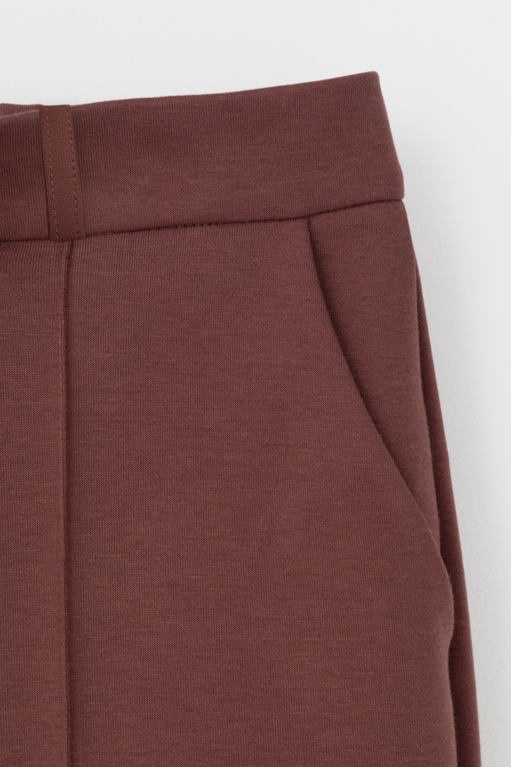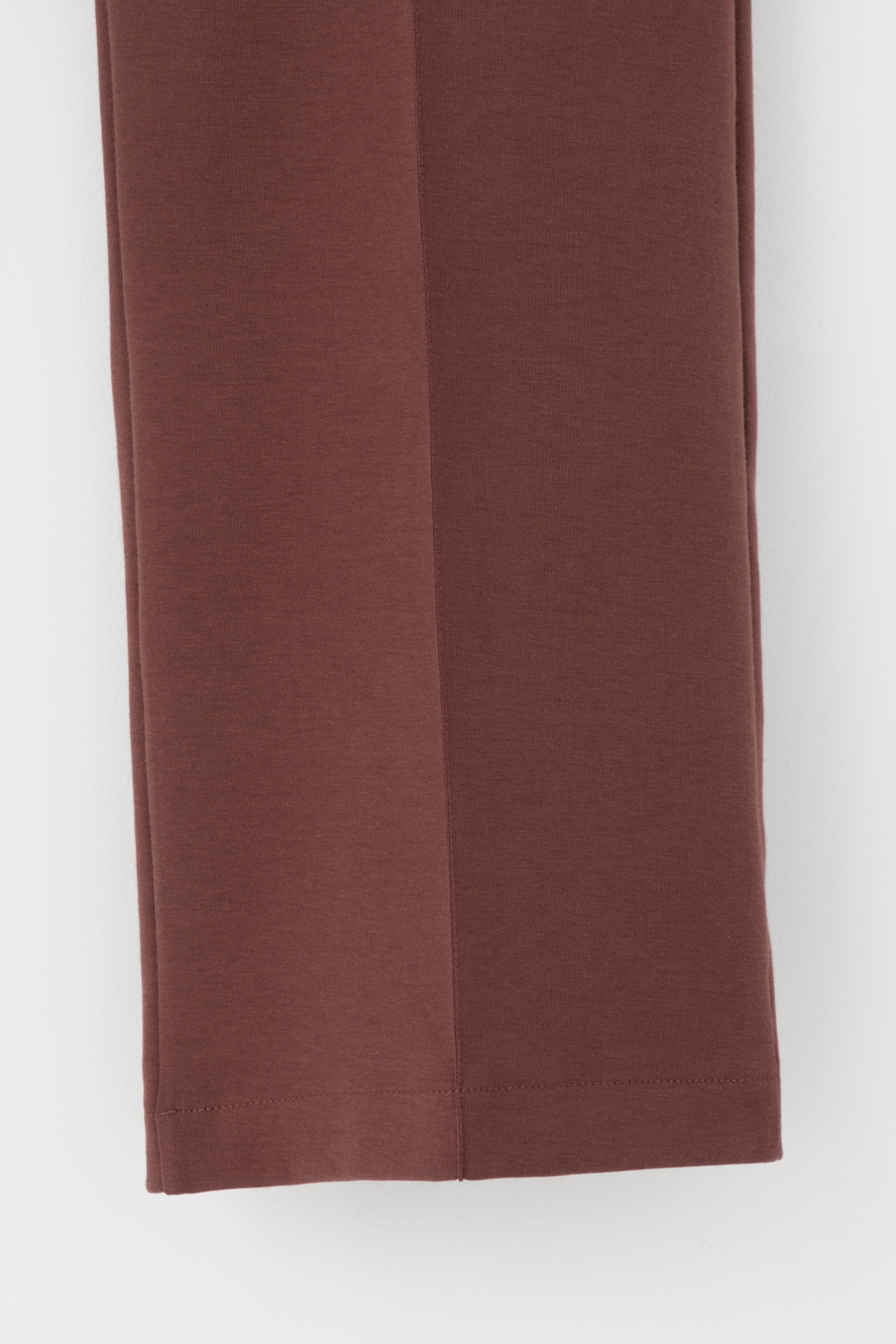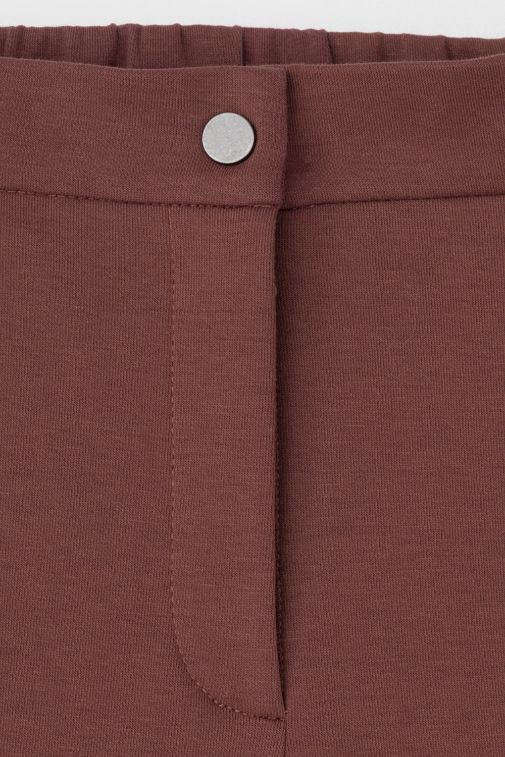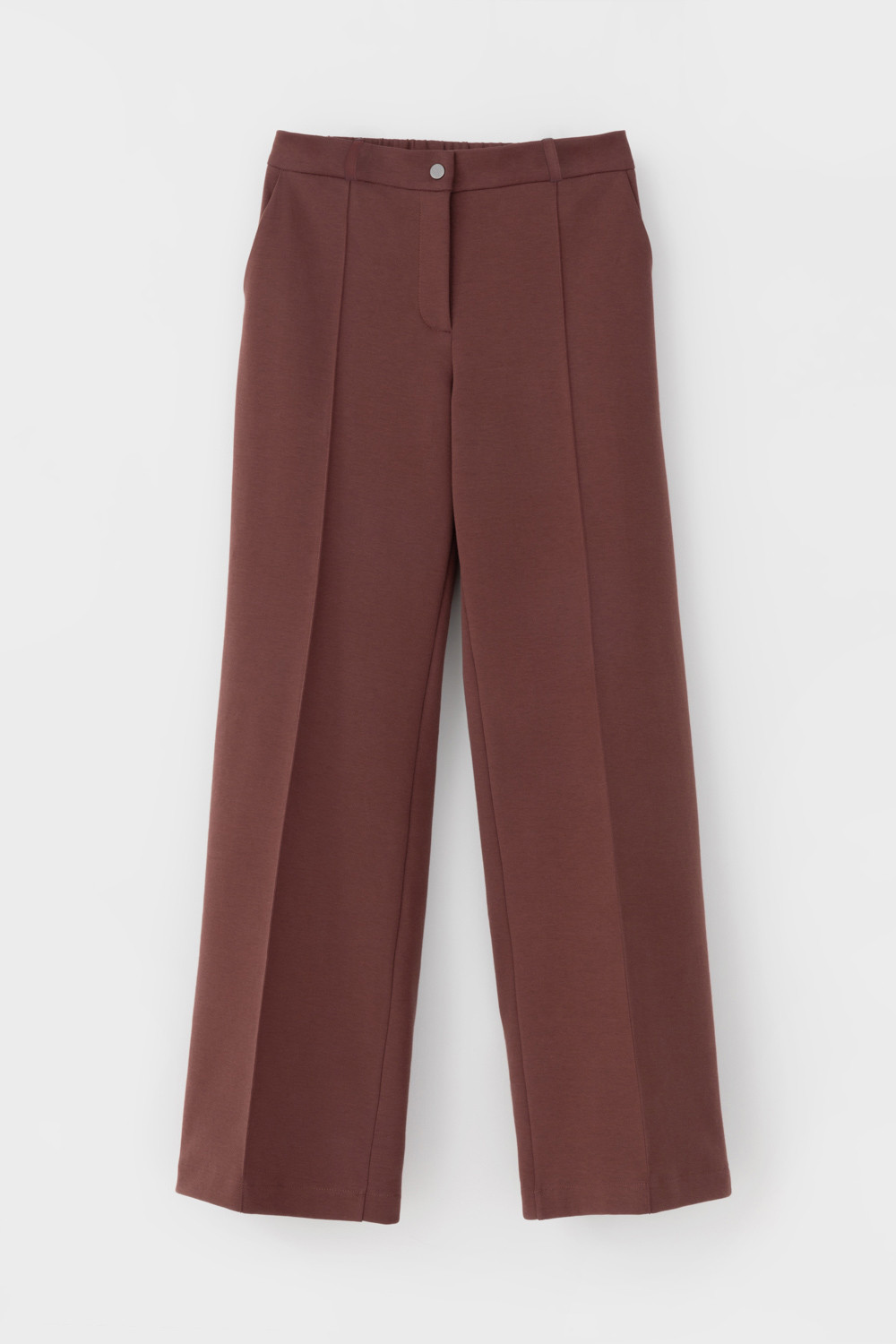 Свободные женские брюки со стрелками и боковыми карманами из плотного гладкого трикотажа интерлок. Застегиваются на молнию и кнопку. Низ обработан плоскими швами.