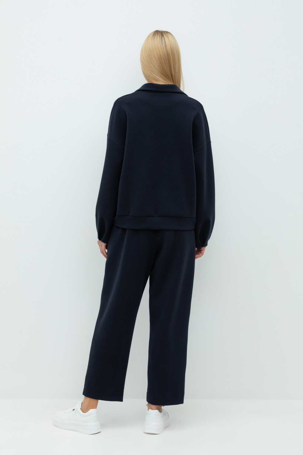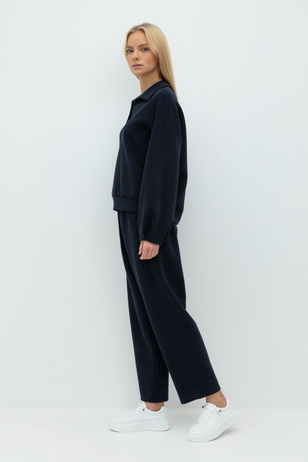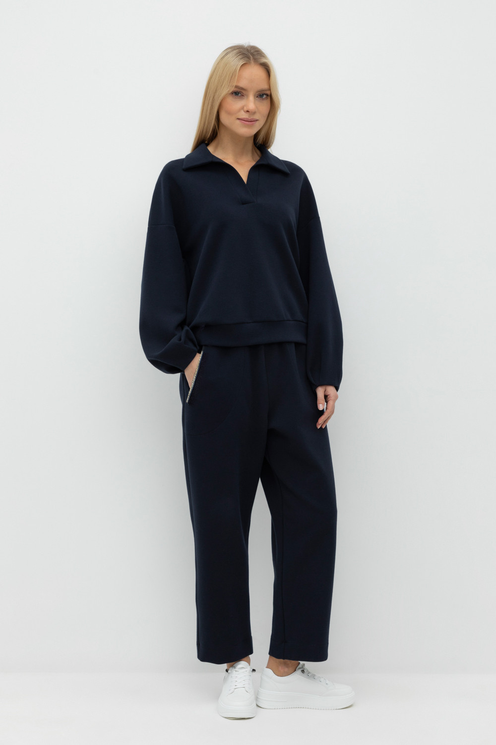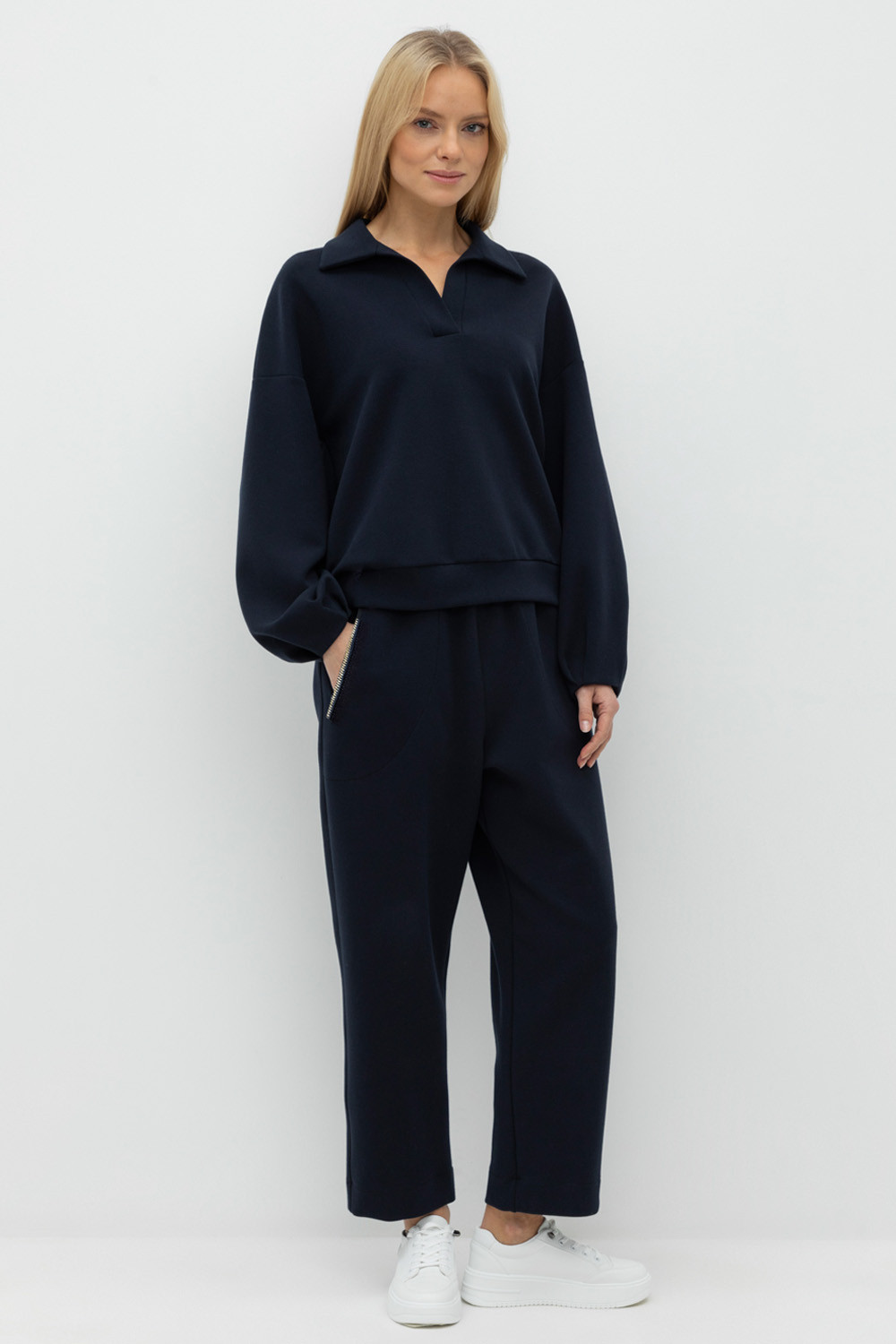 Брюки с боковыми карманами на молнии из плотного гладкого трикотажа интерлок. Пояс на резинке.