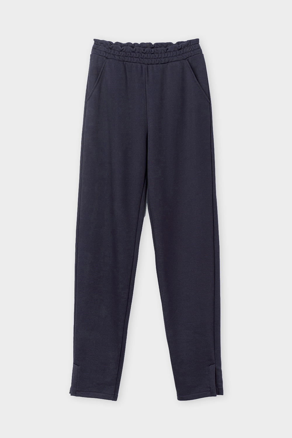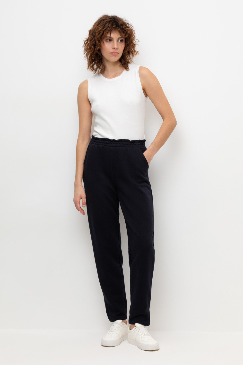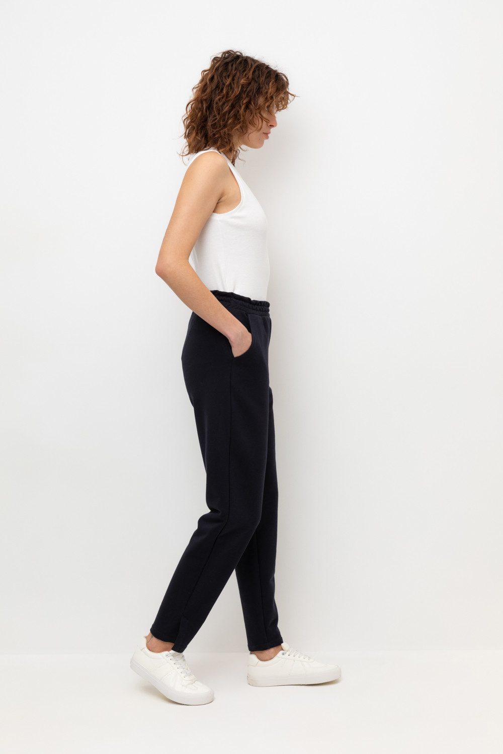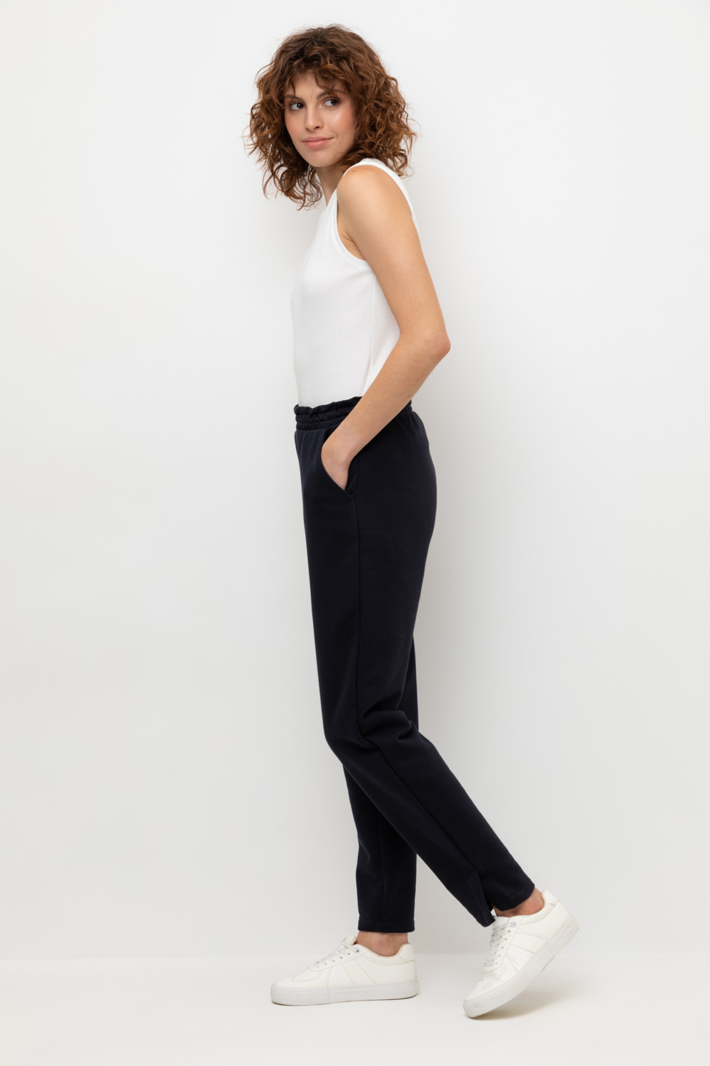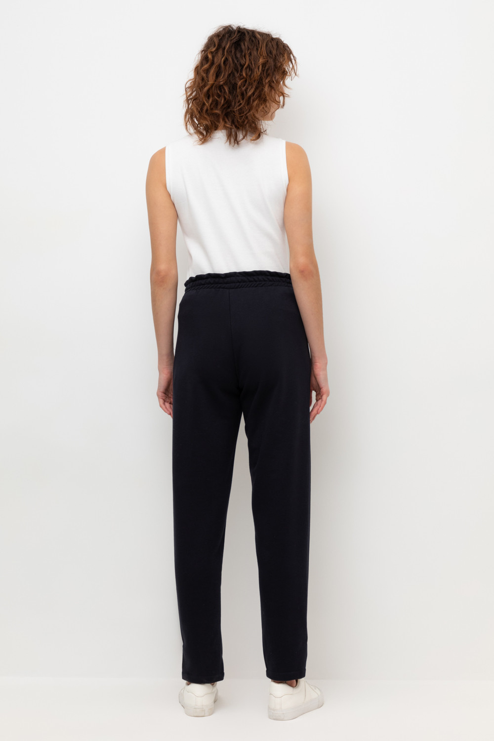 Брюки прямого кроя с боковыми карманами из петельчатого футера трехнитки. Гладкий и плотный материал на основе хлопка сохраняет форму.