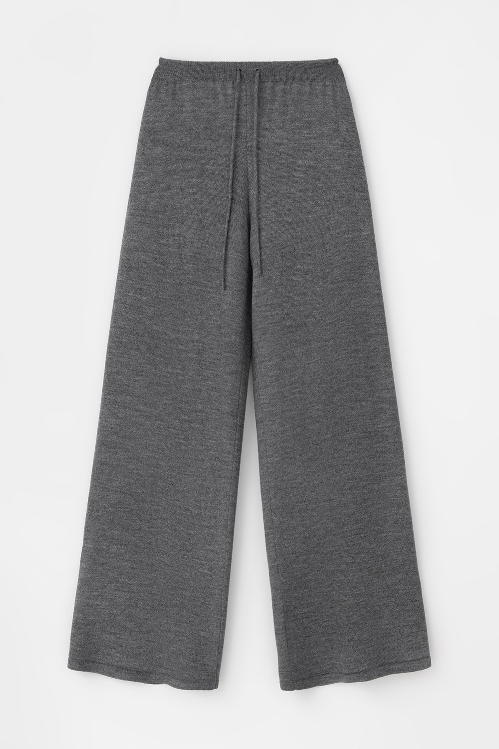 Пояс регулируется вязаным шнуром в тон брюк. Плотная фактура вязания согревает и сохраняет форму во время носки.