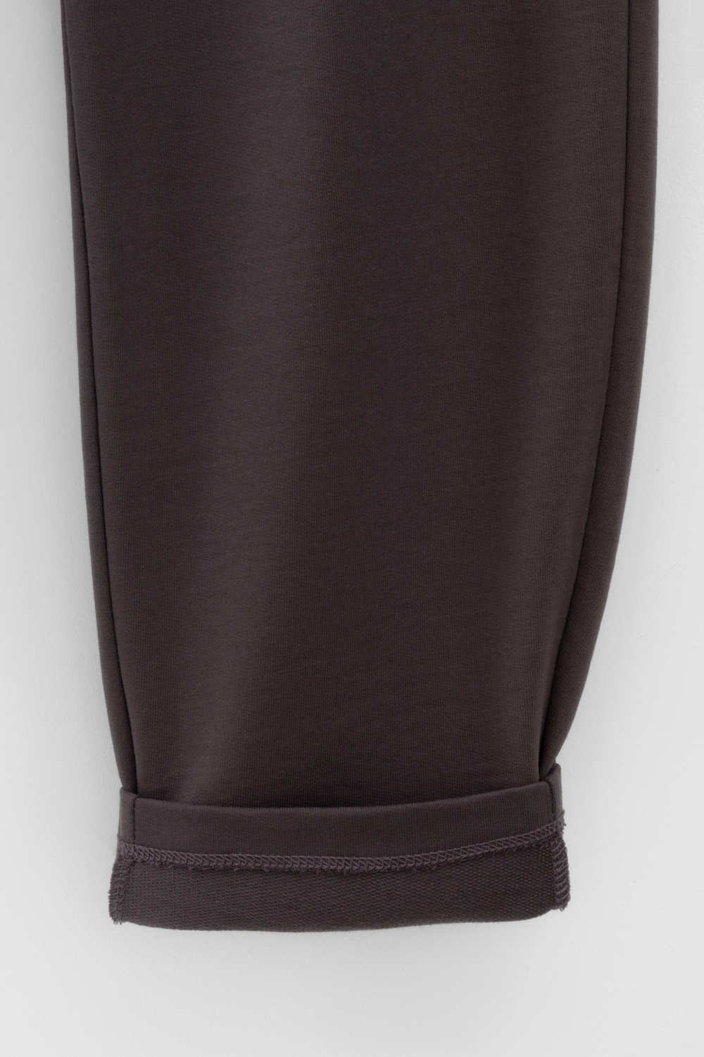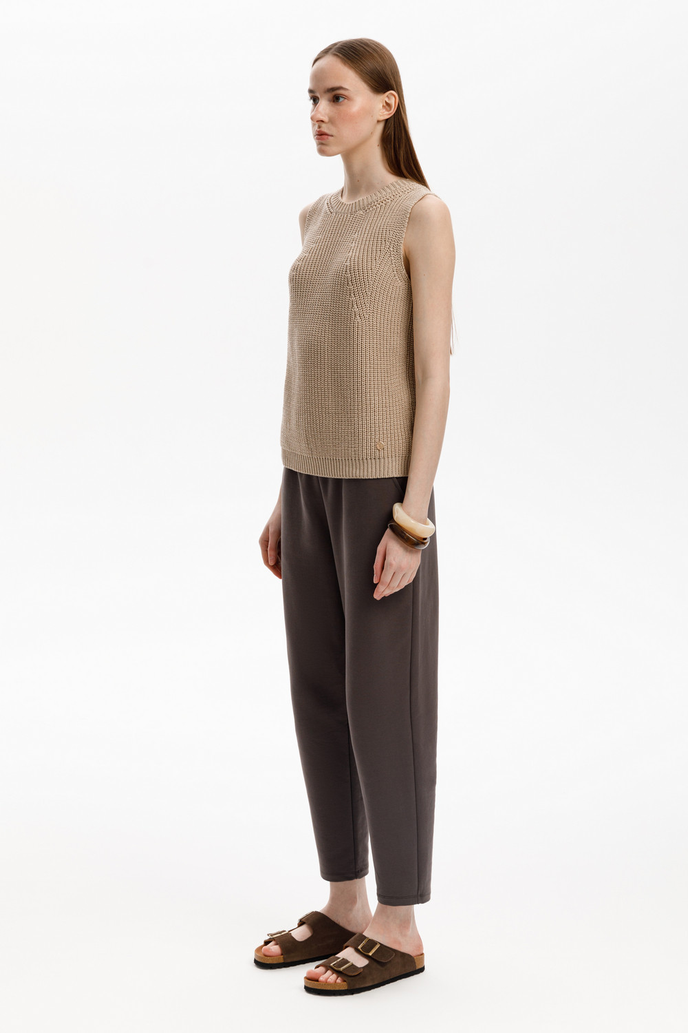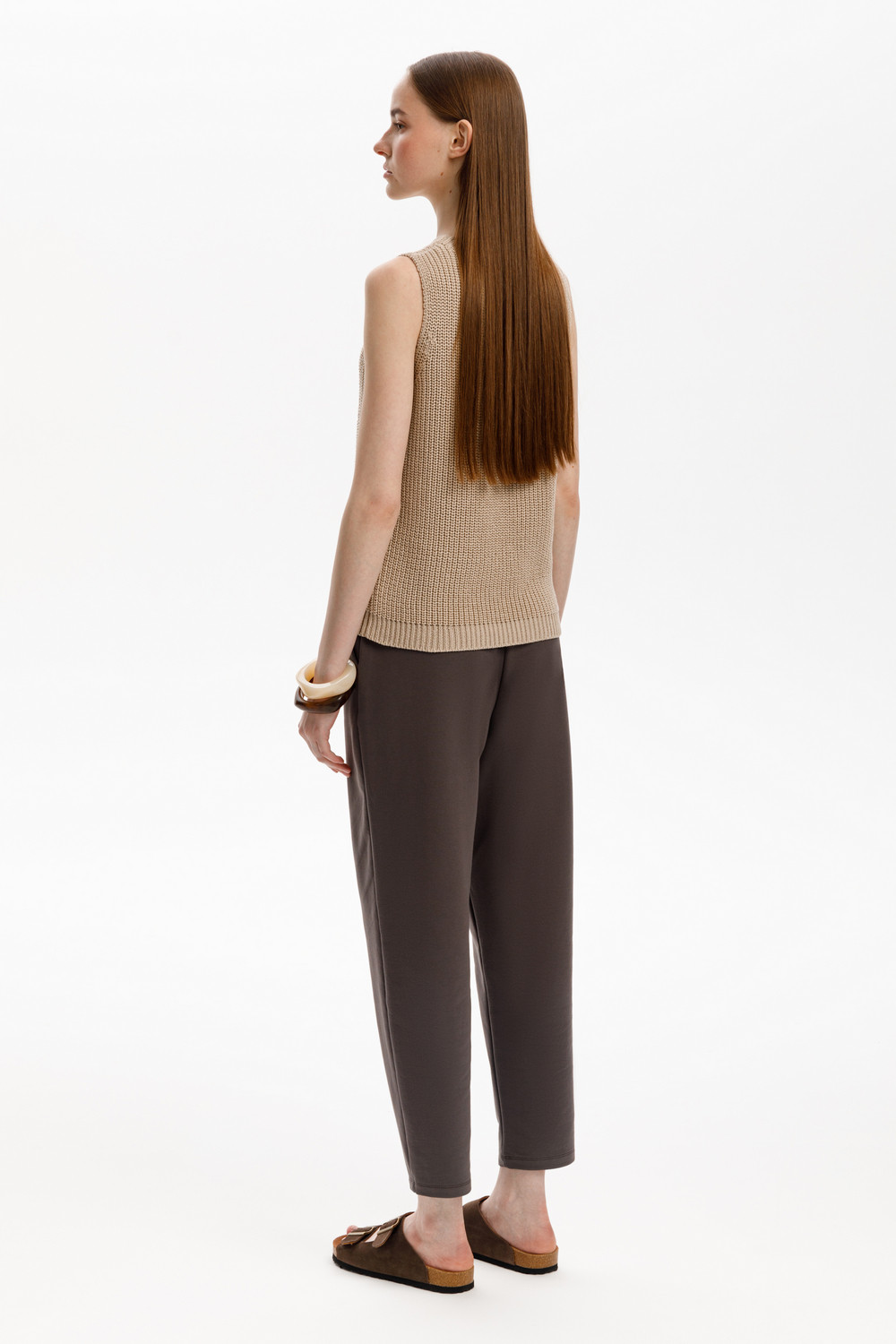 Брюки из мягкого петельчатого футера. Эластичный пояс, наличие боковых карманов, зауженный к низу силуэт делают изделие более удобным и повседневным.