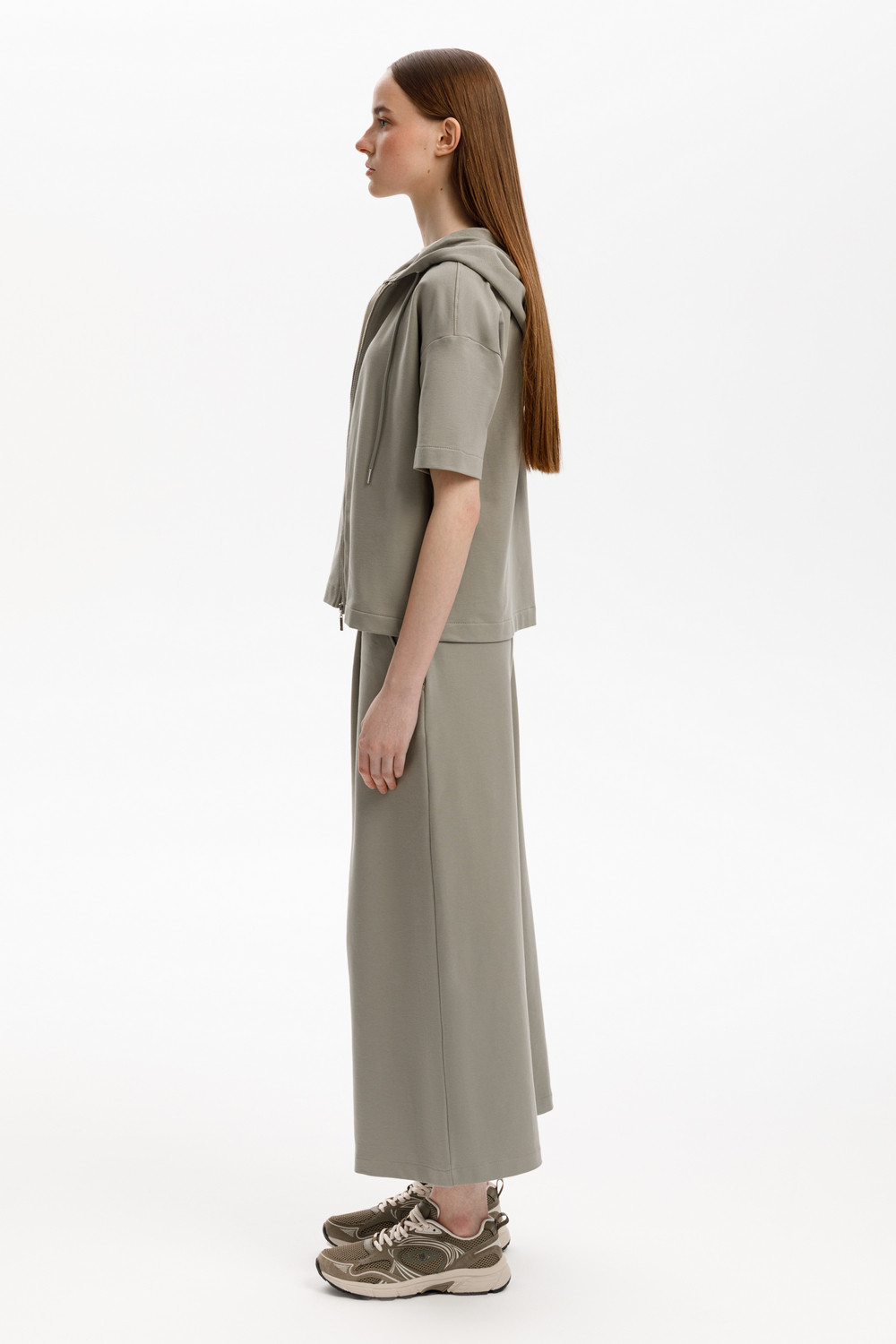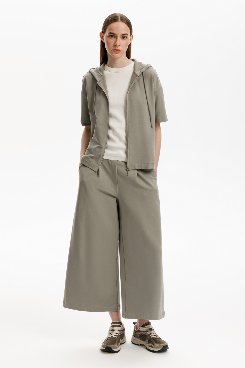 Широкие укороченные брюки из мягкого эластичного футера создают непринужденный образ. Высокий пояс с имитацией застежки и защипы придают брюкам расслабленный стиль. Подарите себе комфорт и свободу с нашим качеством.