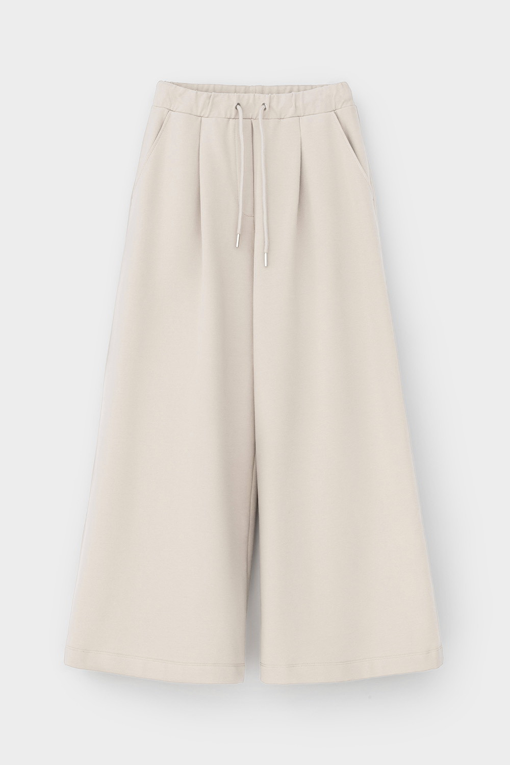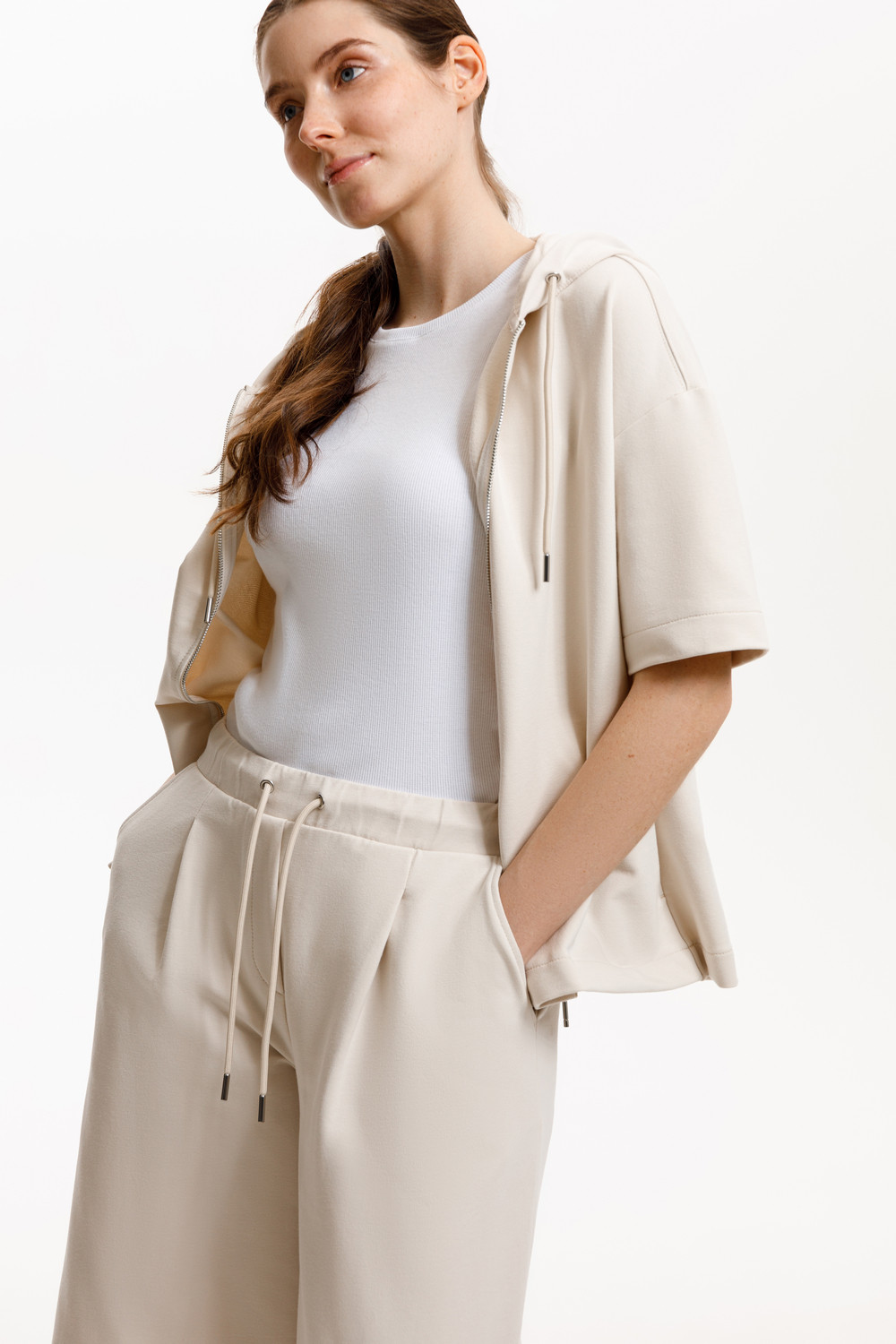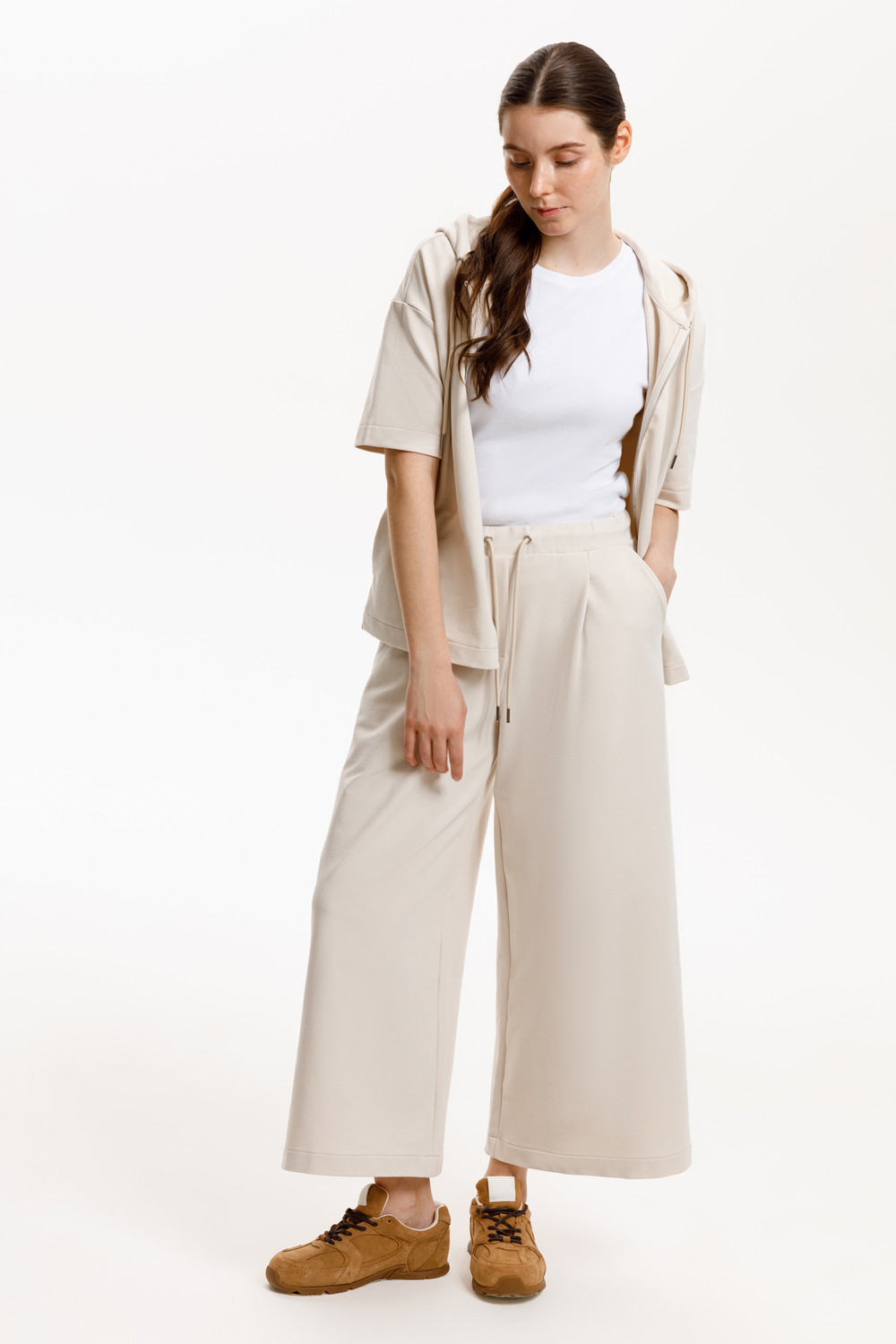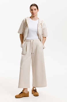 Широкие укороченные брюки из мягкого эластичного футера создают непринужденный образ. Высокий пояс с имитацией застежки и защипы придают брюкам расслабленный стиль. Подарите себе комфорт и свободу с нашим качеством.