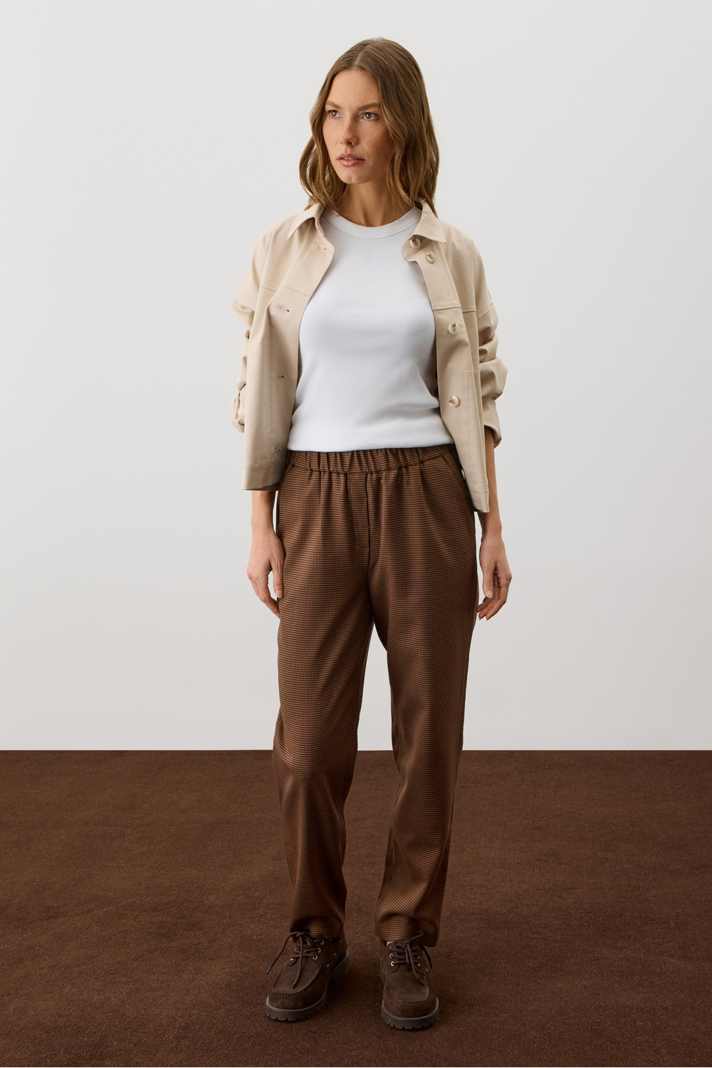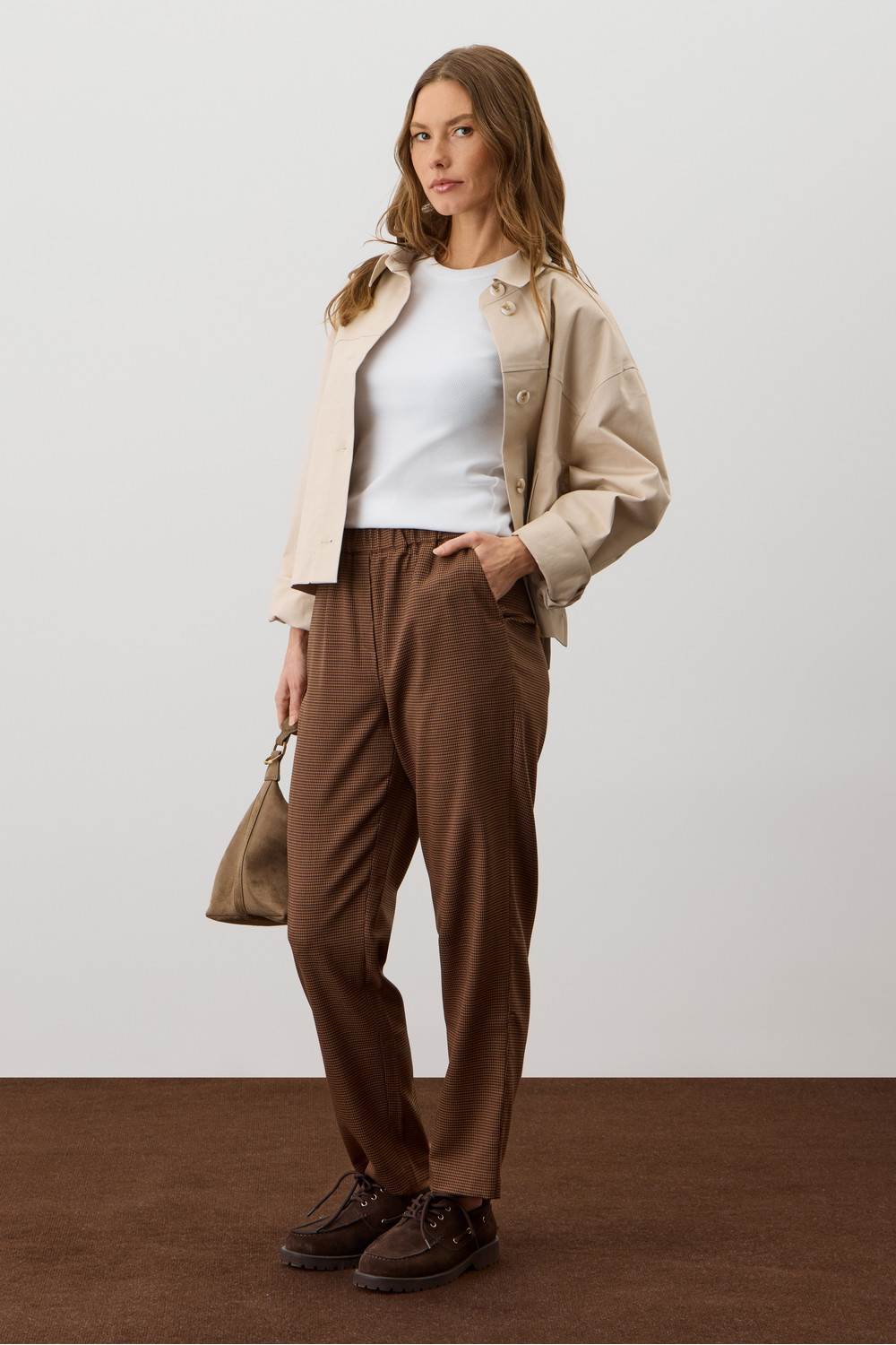 Зауженный силуэт этих брюк помогает визуально удлинить ноги и подчеркивает женственные формы. При этом мягкий и дышащий материал гарантирует свободу движений, а эластичный пояс обеспечивает идеальную посадку.