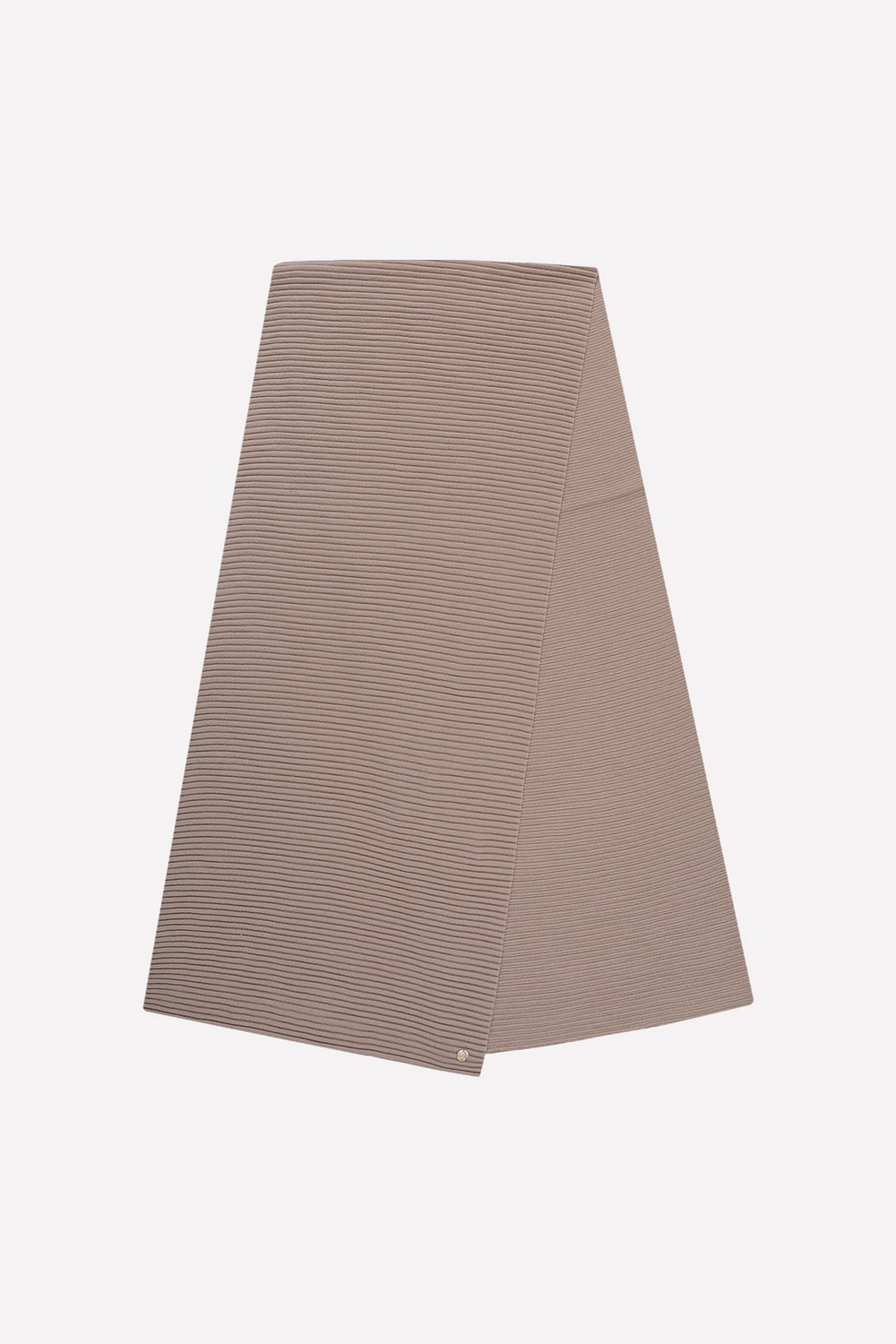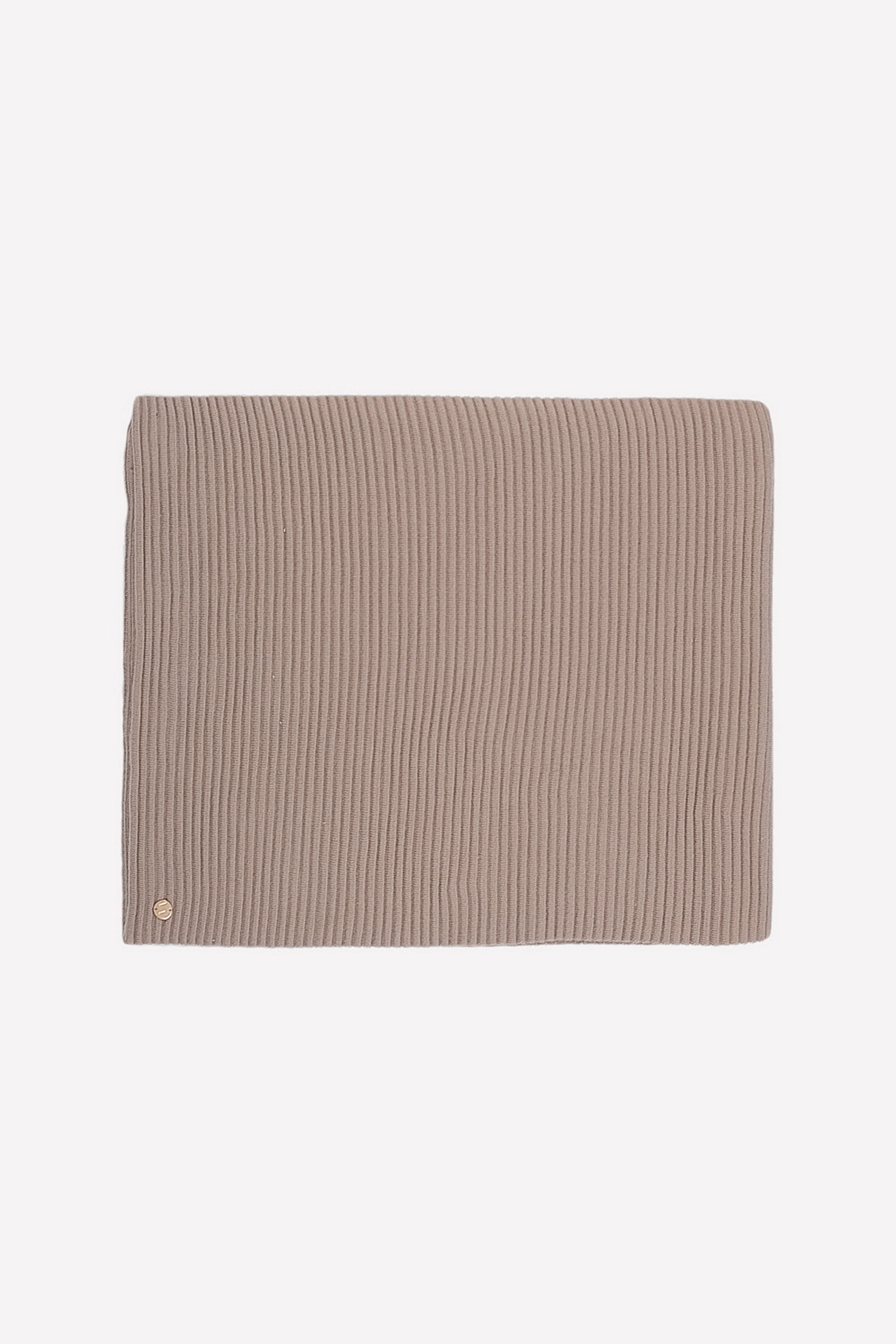 Однотонный вязаный шарф. Связан резинкой. Украшен металлическим значком с тиснёнными буквами VN и фирменной этикеткой.