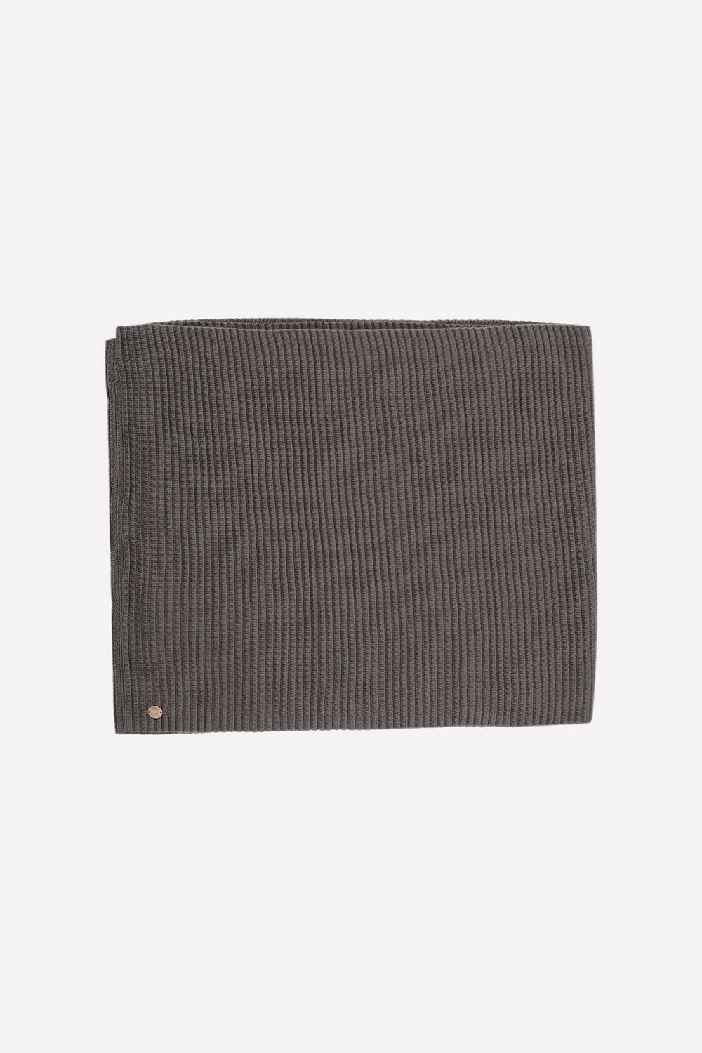 Однотонный вязаный шарф. Связан резинкой. Украшен металлическим значком с тиснёнными буквами VN и фирменной этикеткой.