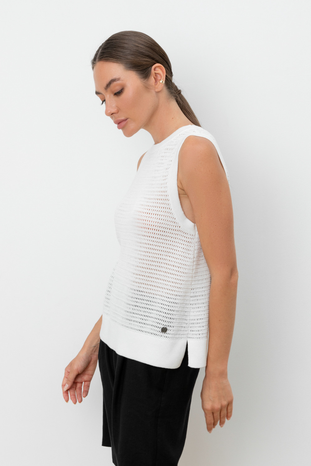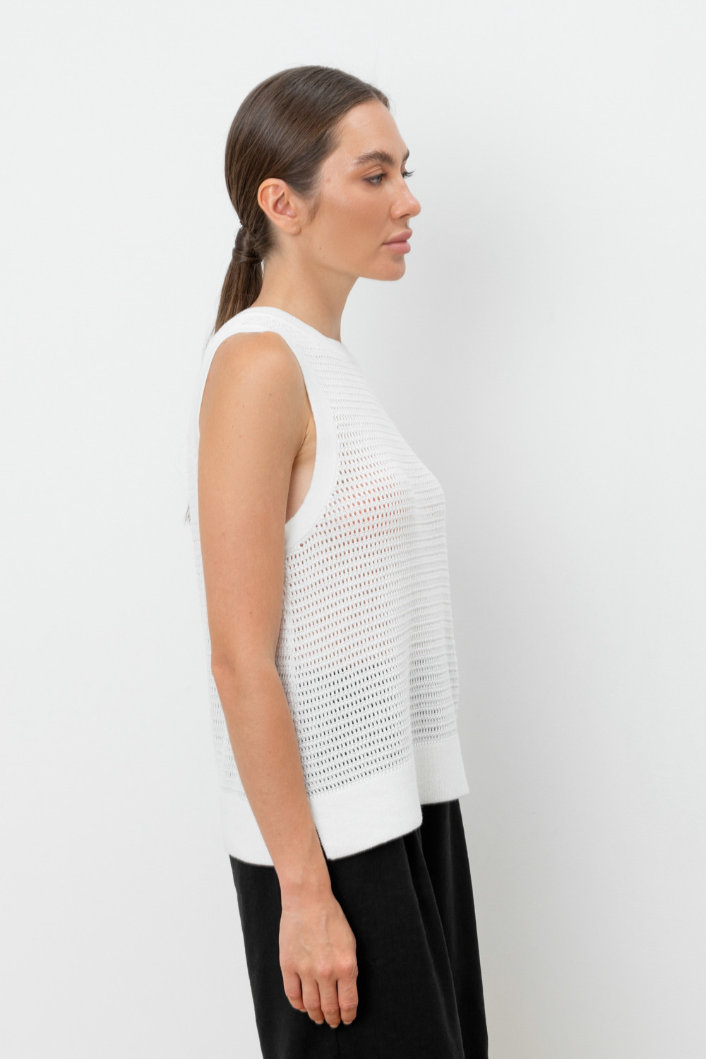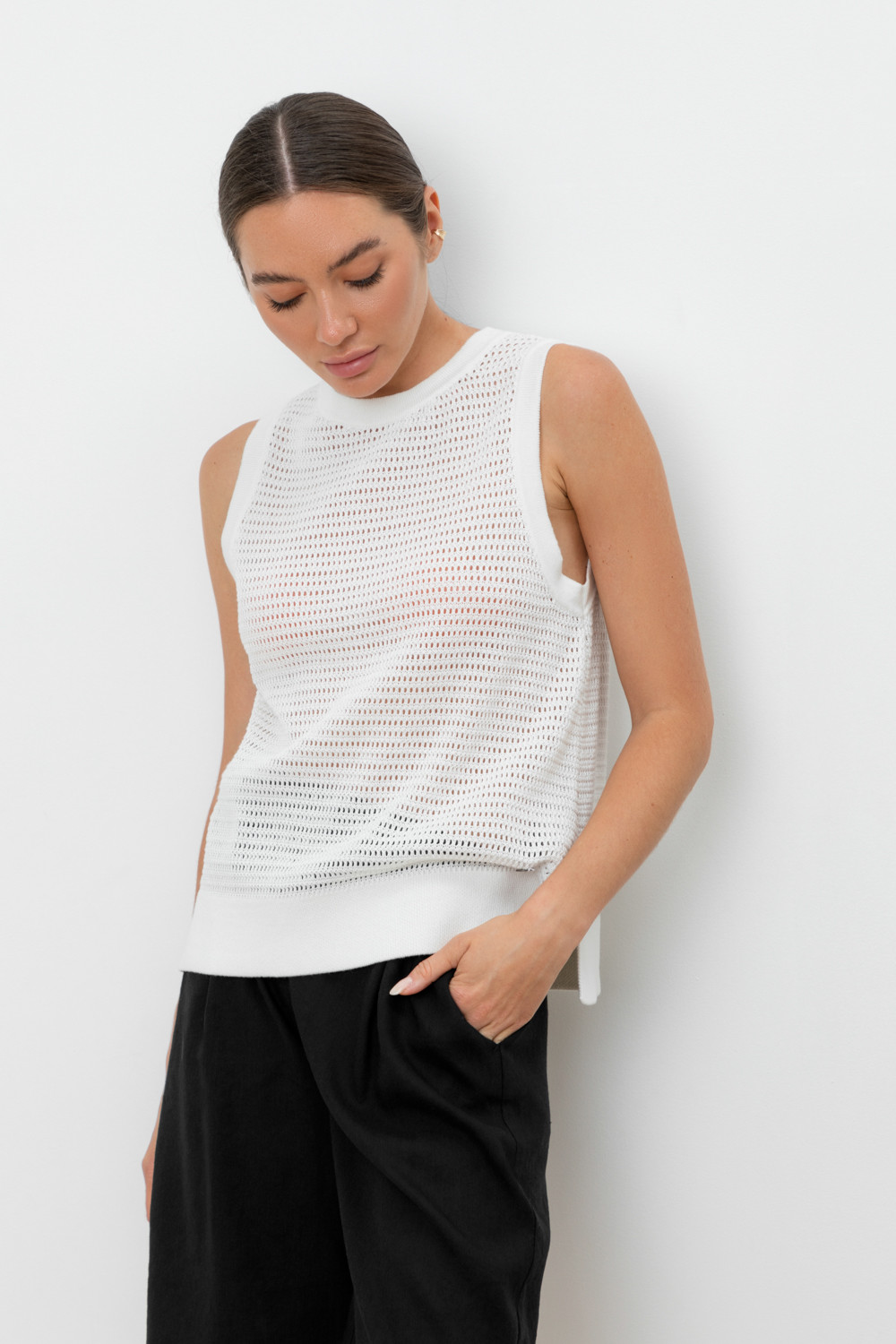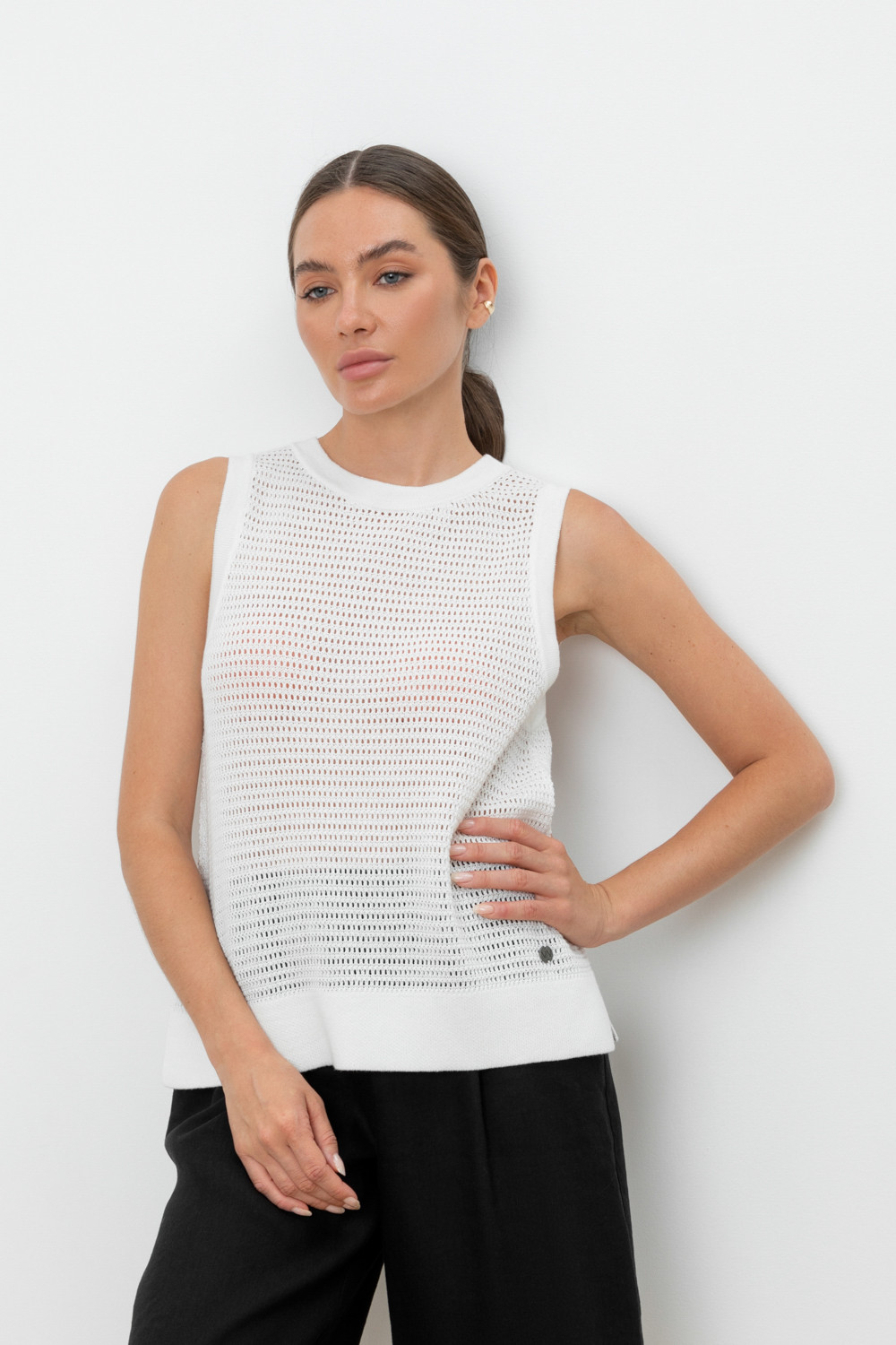 Вязаная ажурная майка. Состав 50% хлопок, 50% акрил. Благодаря акрилу в составе изделие не пилингуется.