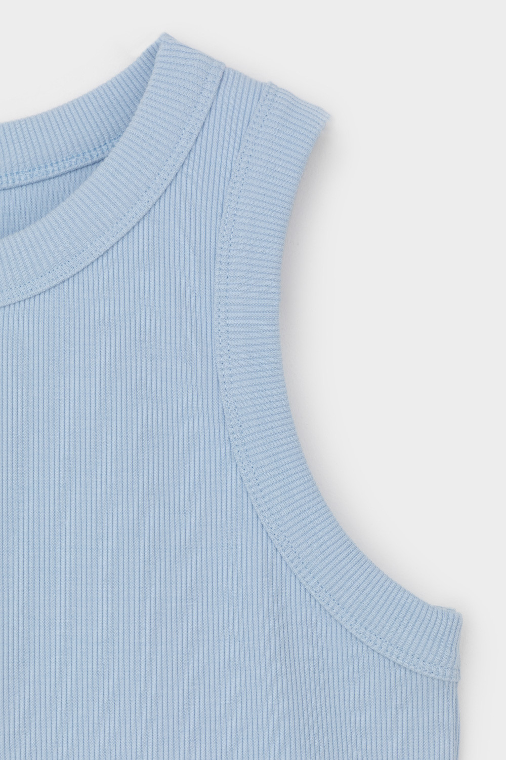 Классическим элементом гардероба является базовый топ в рубчик. Бретели стандартной ширины, круглый вырез и добавление эластана делают изделие комфортным в носке и универсальным в повседневной жизни. Нежно-голубой цвет добавляет женственности и легкости в образ.