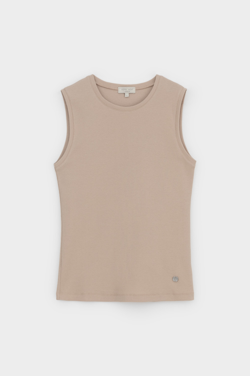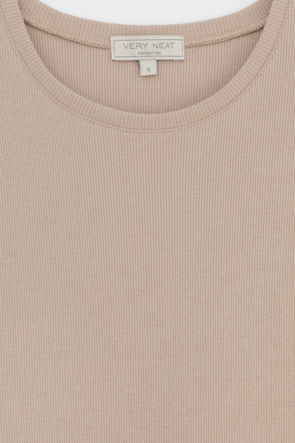 Базовым элементом гардероба является топ из эластичного трикотажа в рубчик. Широкое плечо и высокий вырез делают изделие комфортным и универсальным в носке.