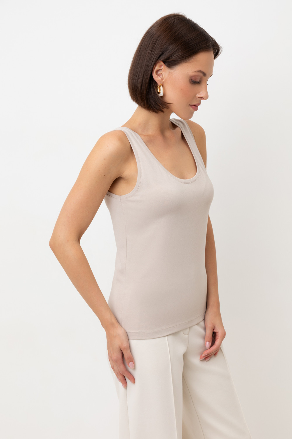 Классическим элементом гардероба является базовый топ из хлопка. Узкие бретели и глубокий вырез делают изделие комфортным в носке и универсальным в повседневной жизни.