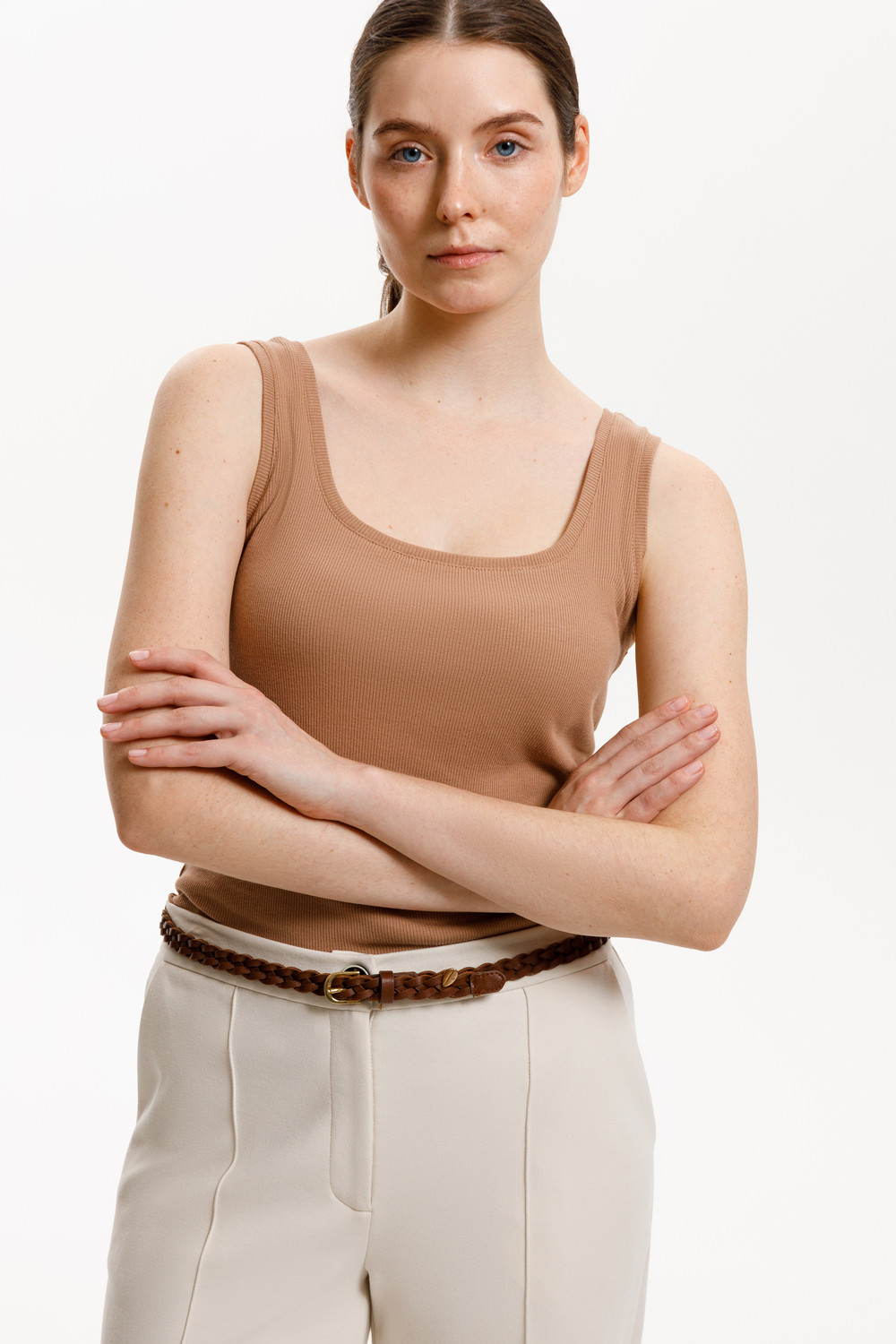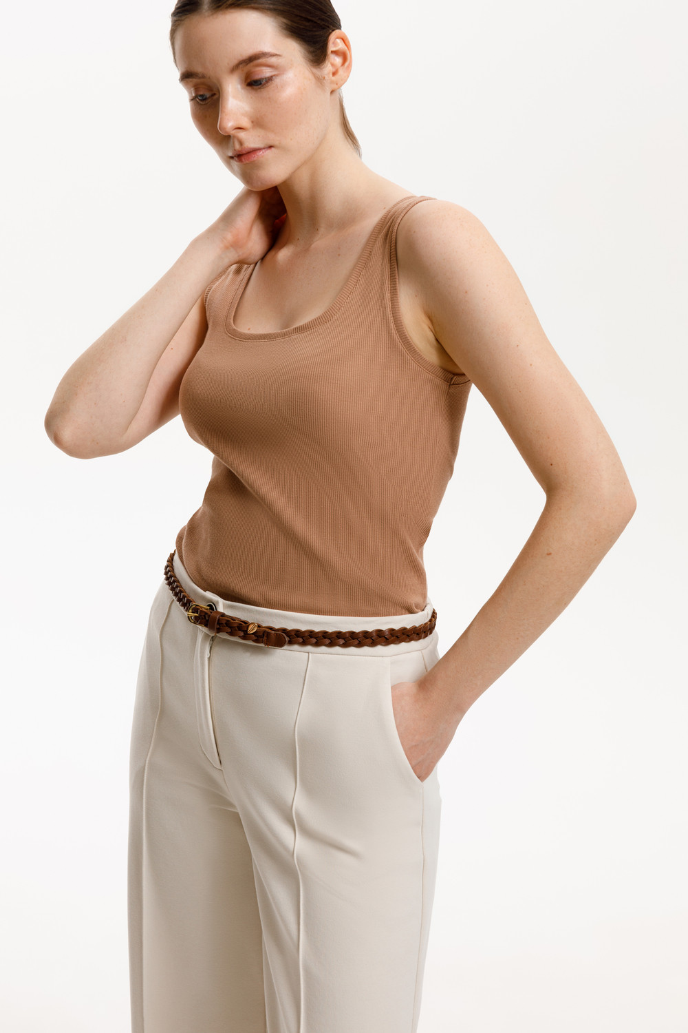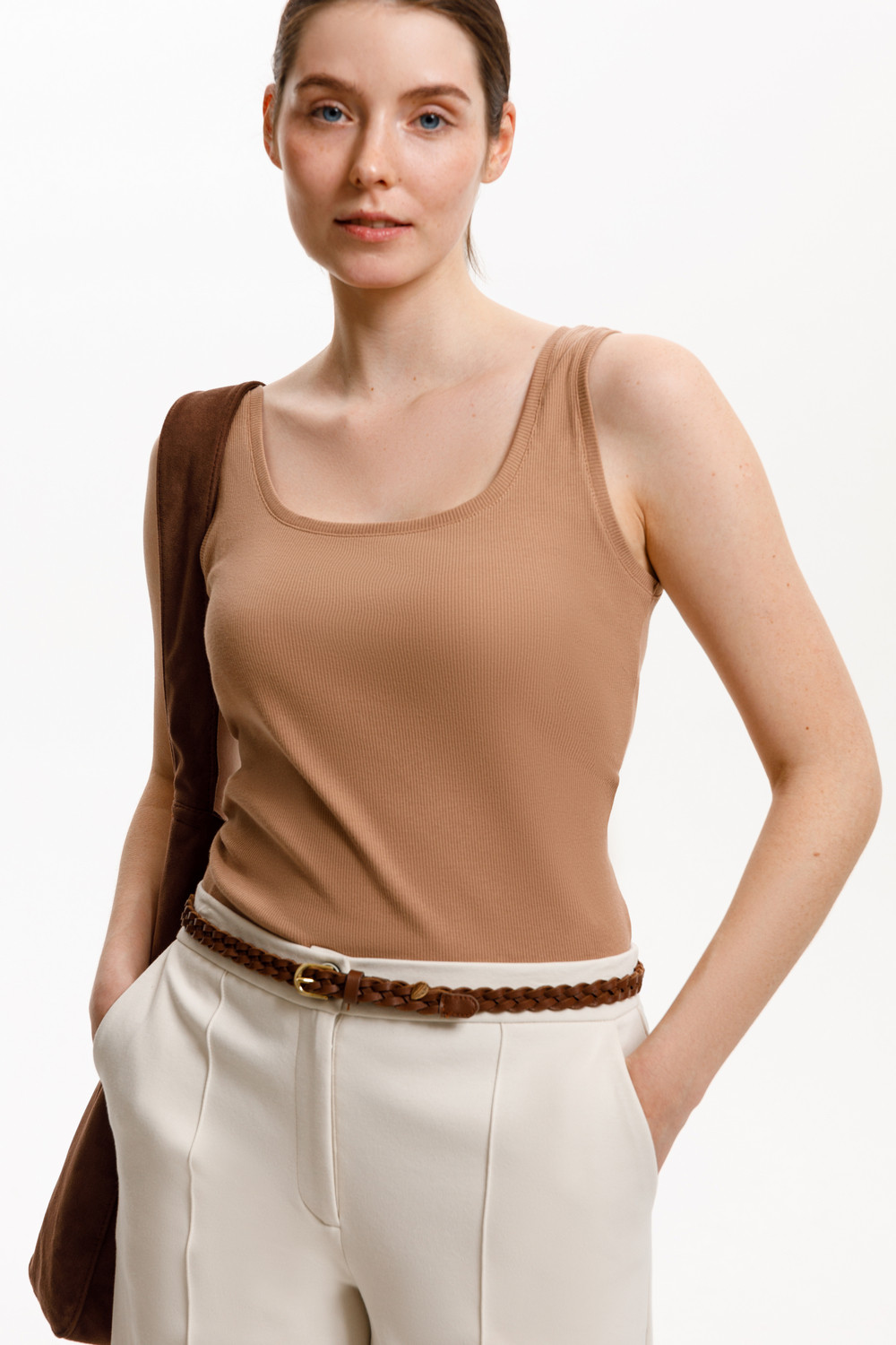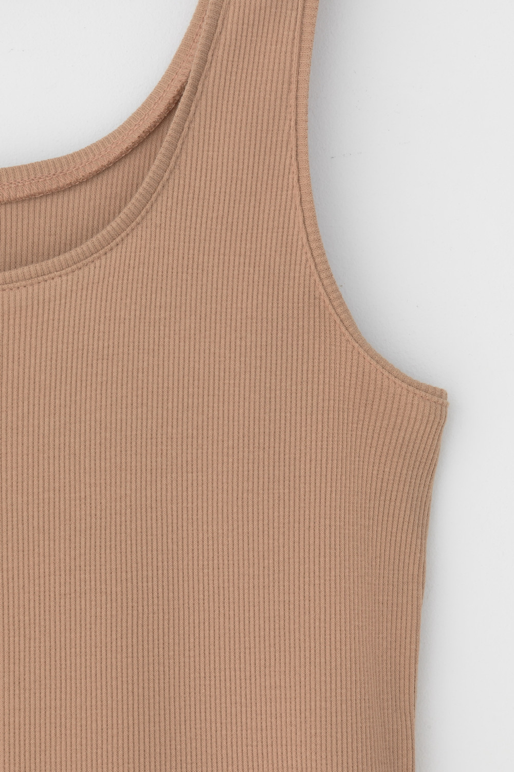 Классическим элементом гардероба является базовый топ в рубчик. Узкие бретели и глубокий вырез делают изделие комфортным в носке и универсальным в повседневной жизни.