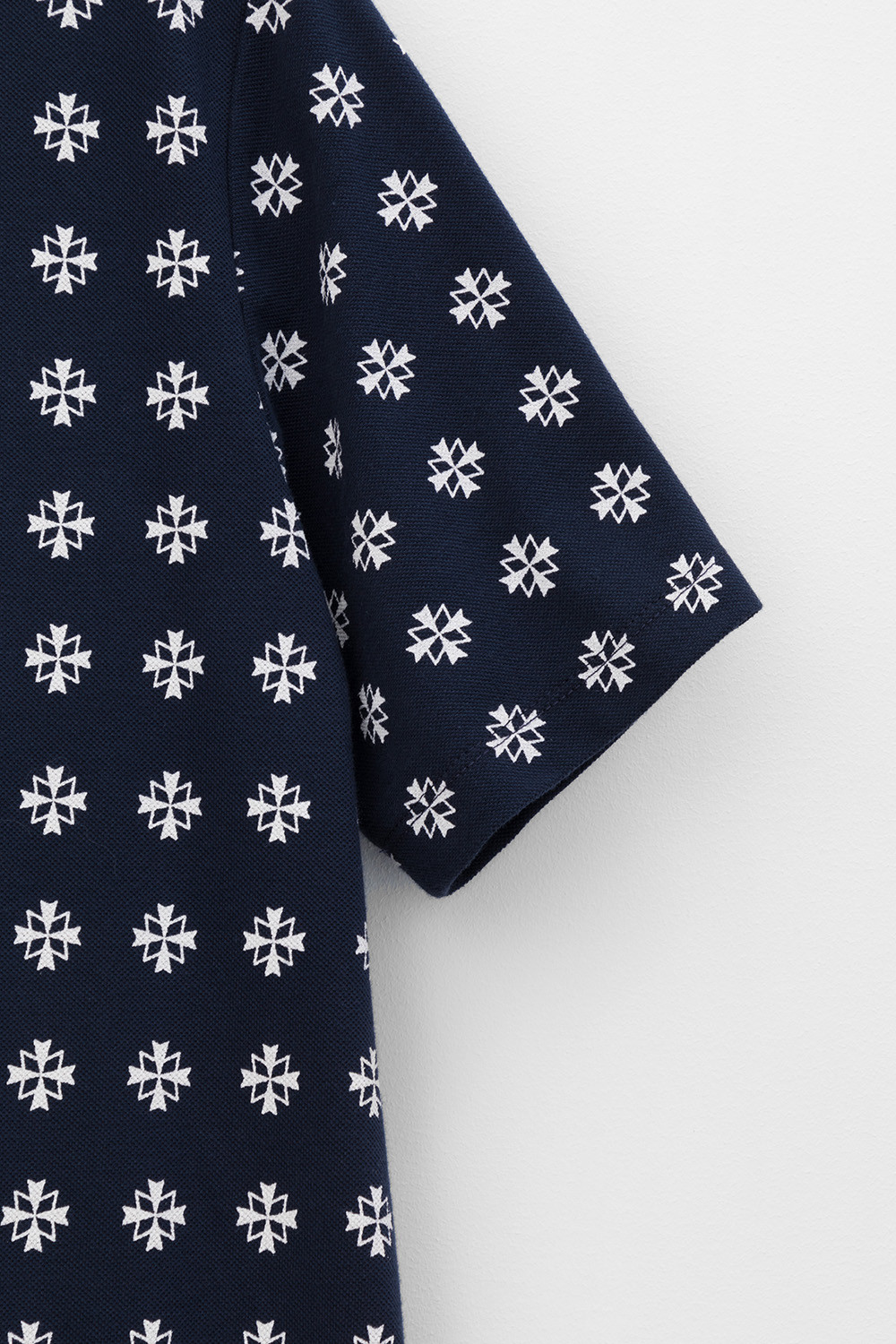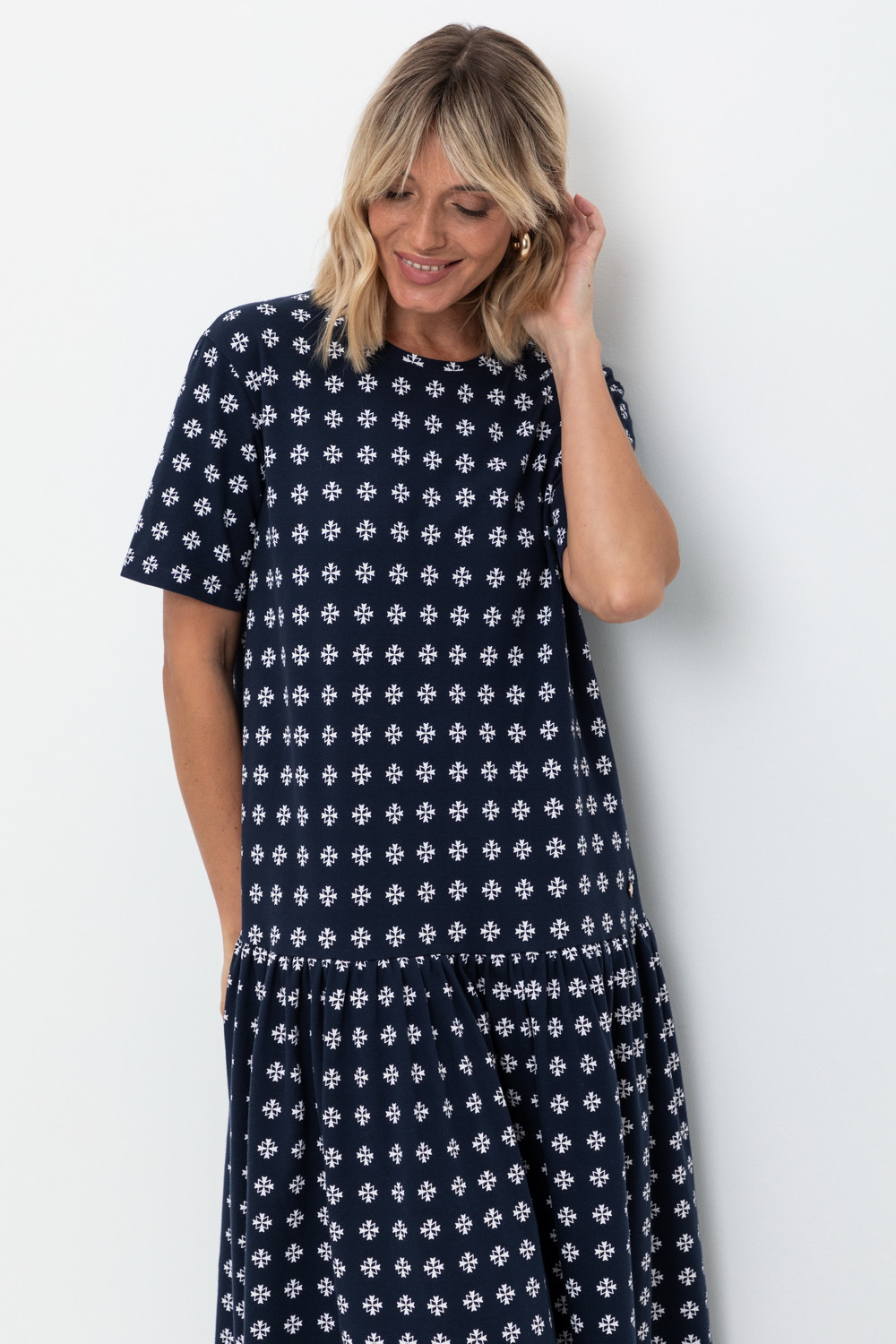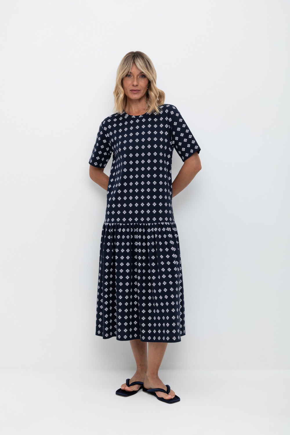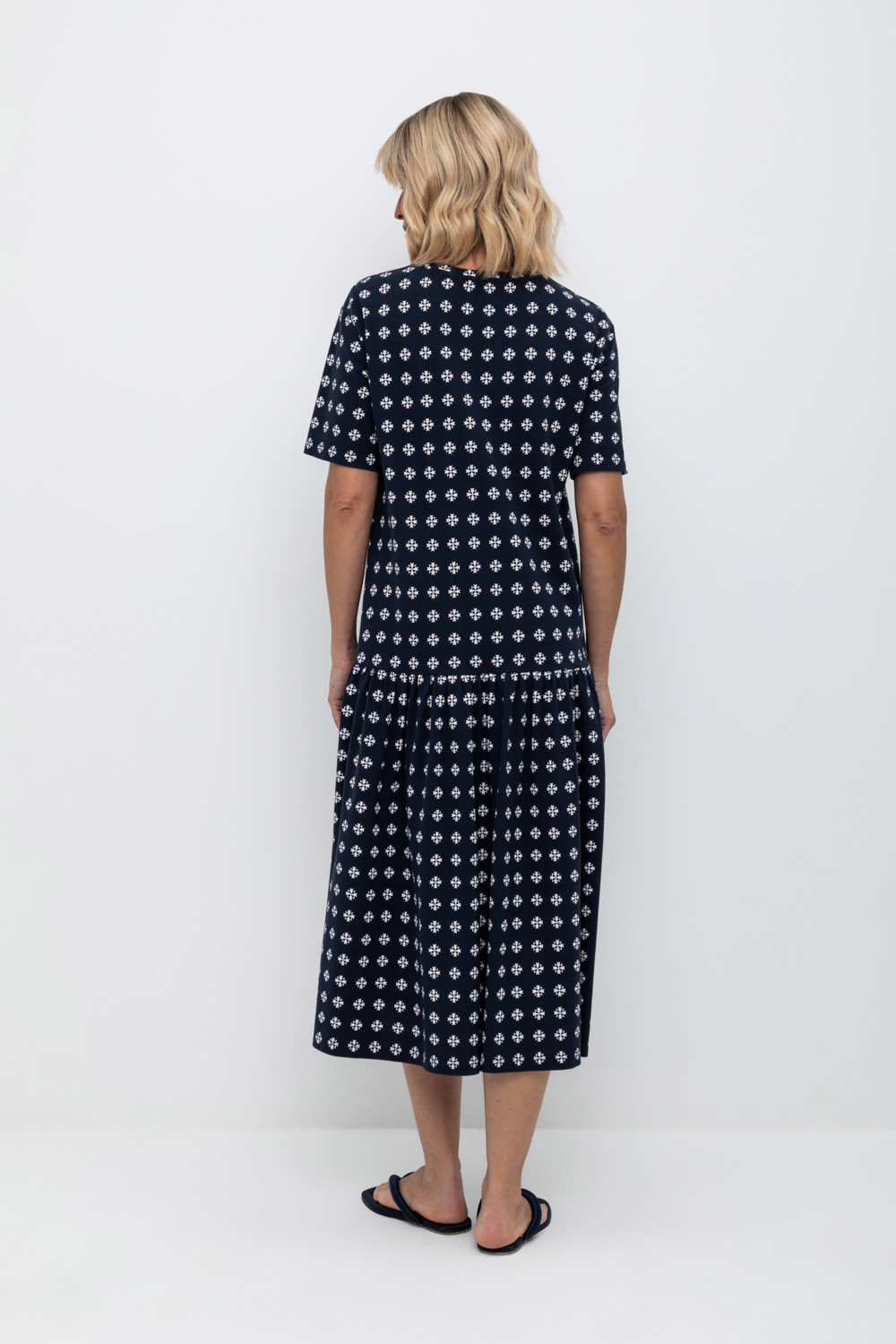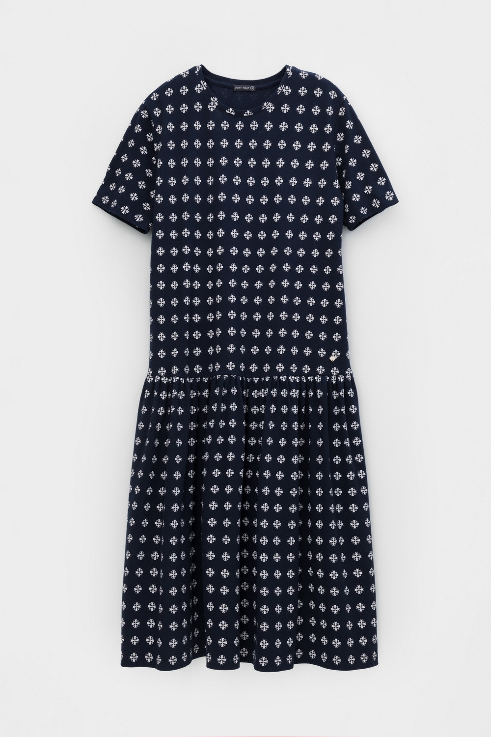 Трикотажное платье с воланом из набивного пике из длинноволокнистого гребенного хлопка. Спущенное плечо придает изделию свободный силуэт.