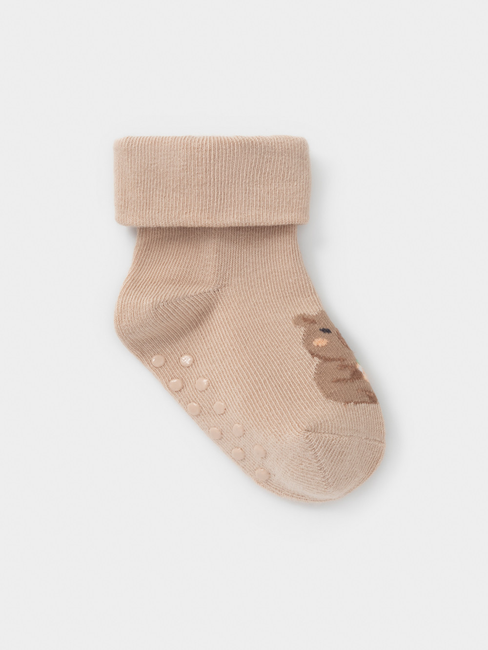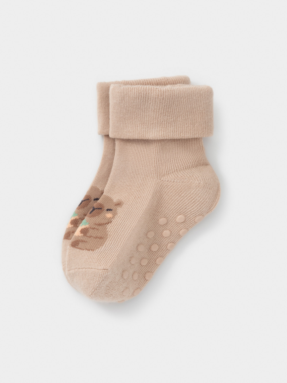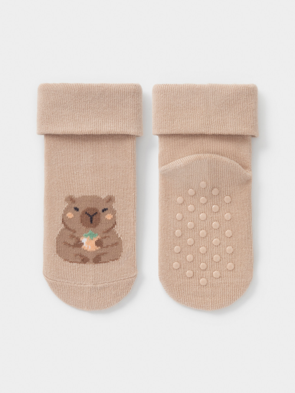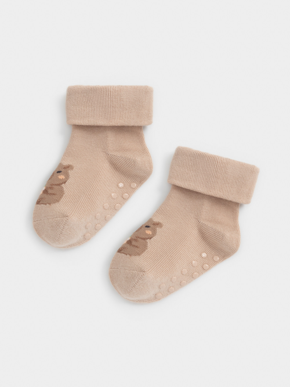 Носки детские с формованной пяткой и отворотом. Украшены рисунком. На стопе противоскользящие стопперы. Изделие сохраняет форму и стойкий цвет после многочисленных стирок.