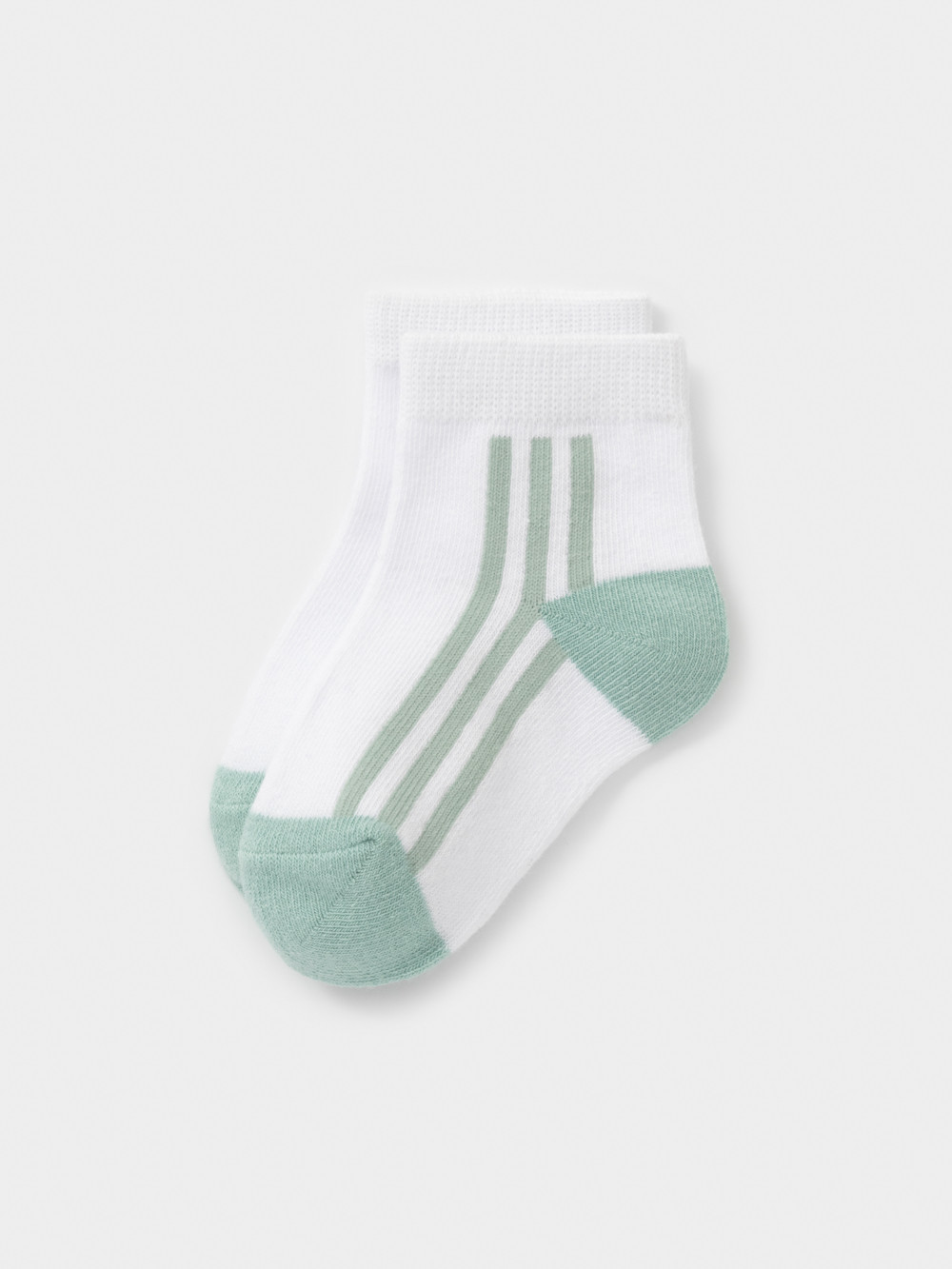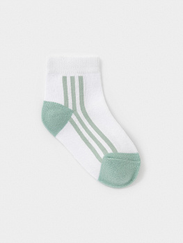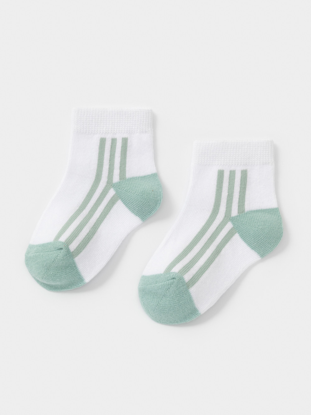 Носки короткие детские с формованной пяткой и эластичной резинкой по краю. Украшены рисунком с полосками. Изделие сохраняет форму и стойкий цвет после многочисленных стирок.