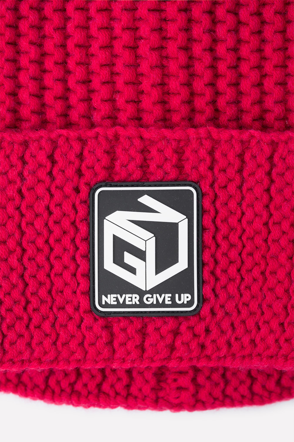 Тёплая вязаная шапка красного цвета для мальчика. На отвороте прикреплена нашивка с надписью и оригинальным рисунком.