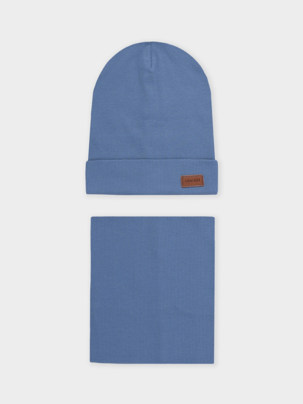 Комплект для мальчика: шапка и снуд. Изготовлен из хлопкового трикотажа в рубчик с добавлением спандекса. Комфортно прилегает, обеспечивая защиту от холода и хороший теплообмен.  Изделия хорошо тянутся, после многократных стирок сохраняют цвет и форму.