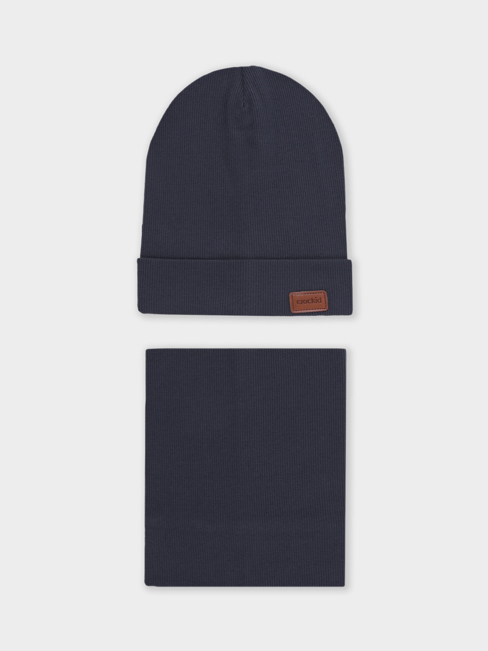 Комплект для мальчика: шапка и снуд. Изготовлен из хлопкового трикотажа в рубчик с добавлением спандекса. Комфортно прилегает, обеспечивая защиту от холода и хороший теплообмен.  Изделия хорошо тянутся, после многократных стирок сохраняют цвет и форму.