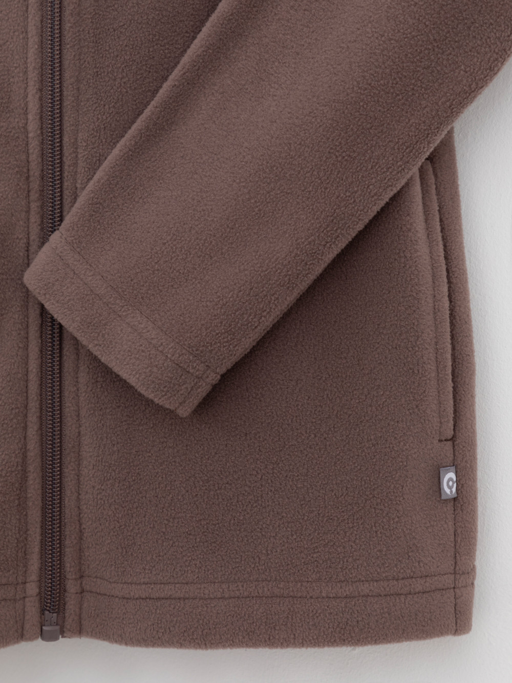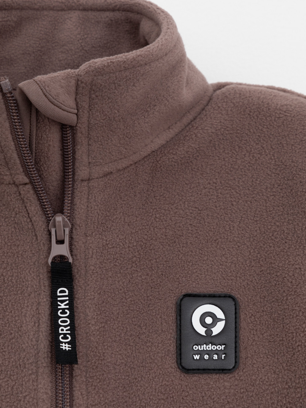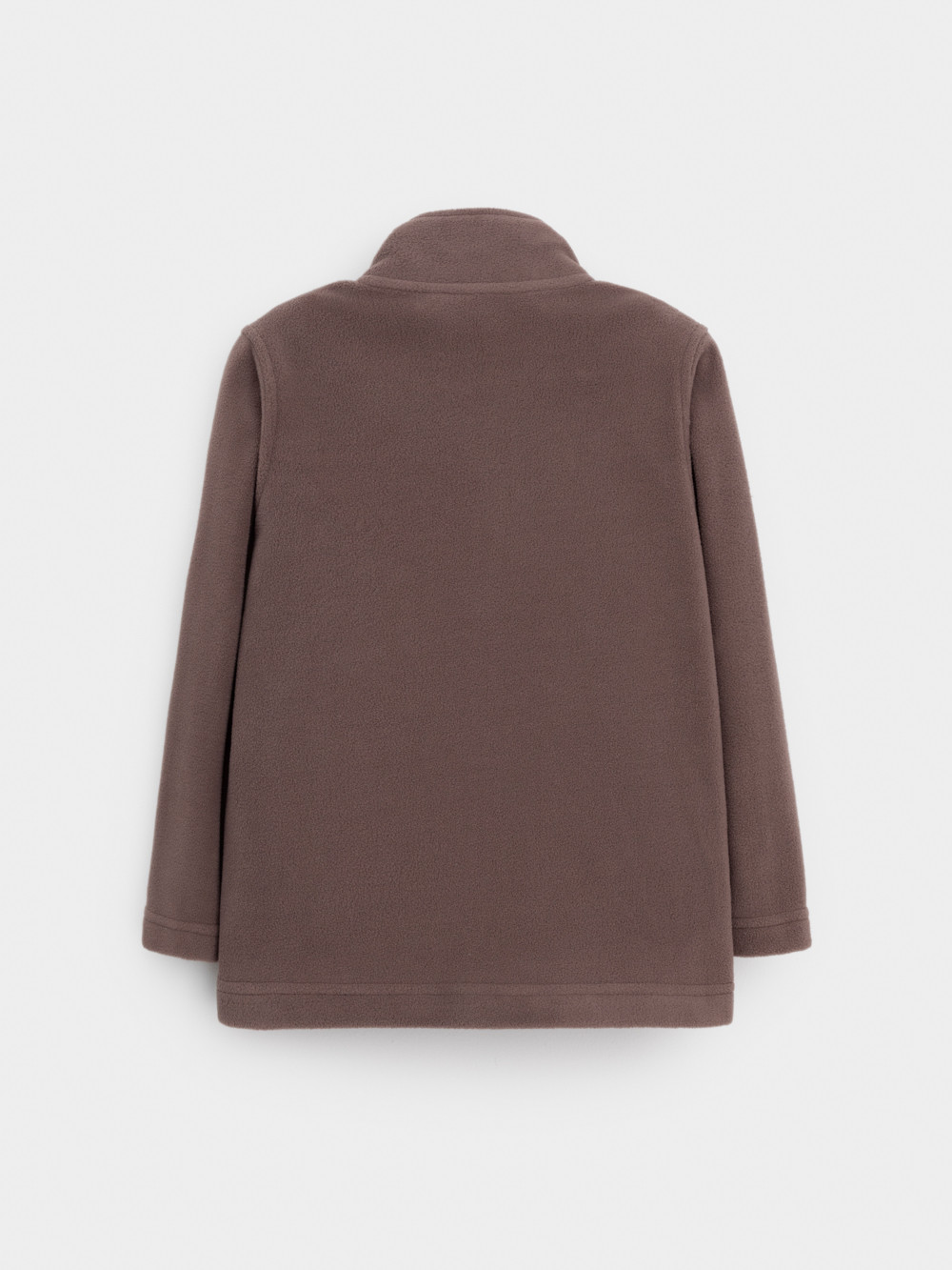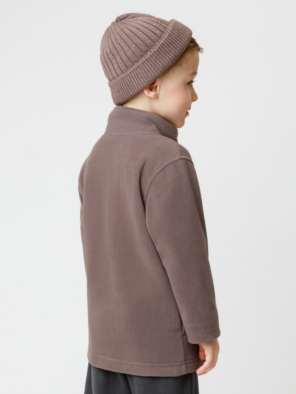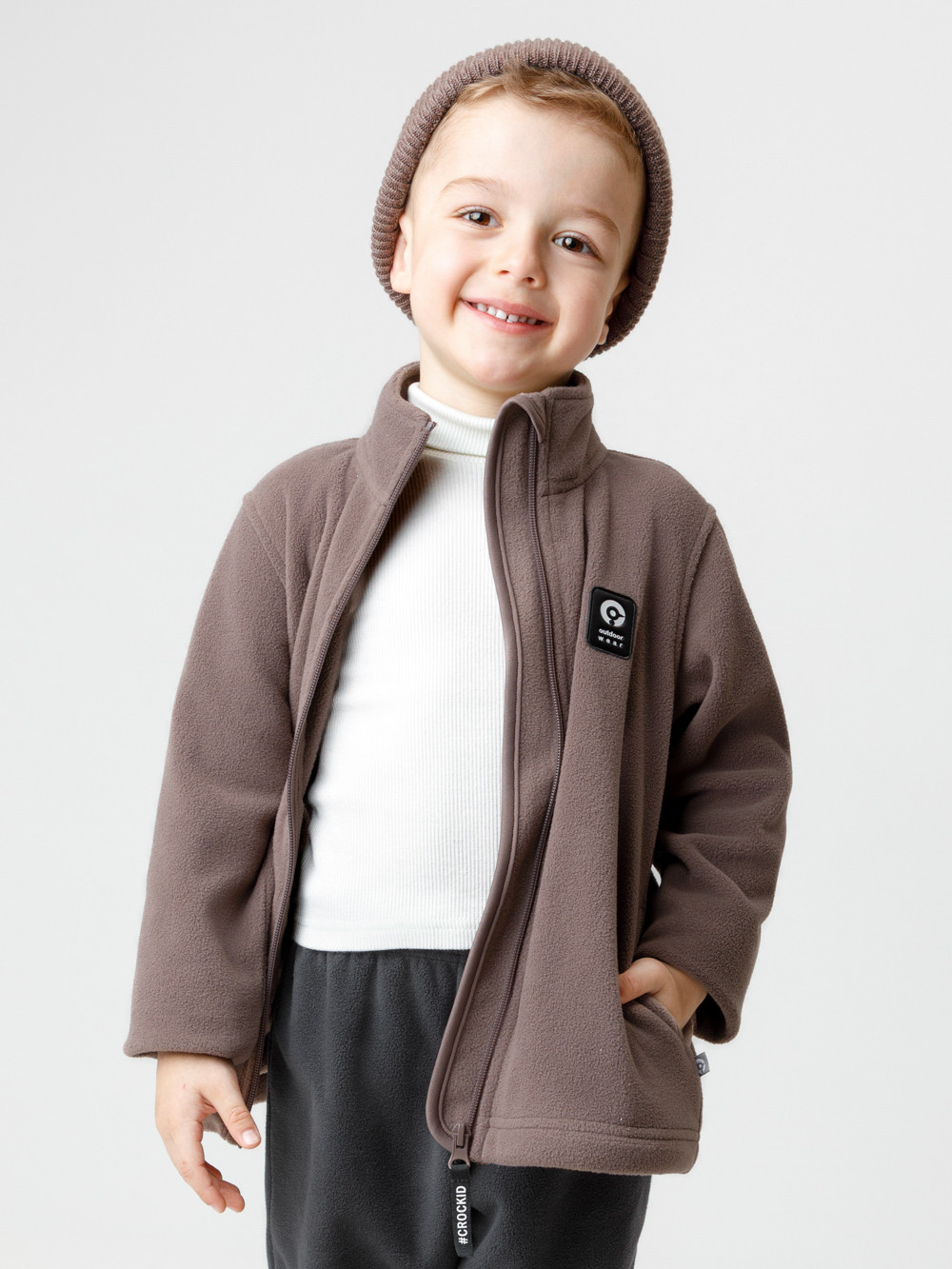 Флисовая куртка для мальчика. У изделия высокий воротник и застёжка на молнию с мягкой защитой шеи и подбородка. По бокам два кармана. Куртка сохраняет цвет и форму после многократных стирок.