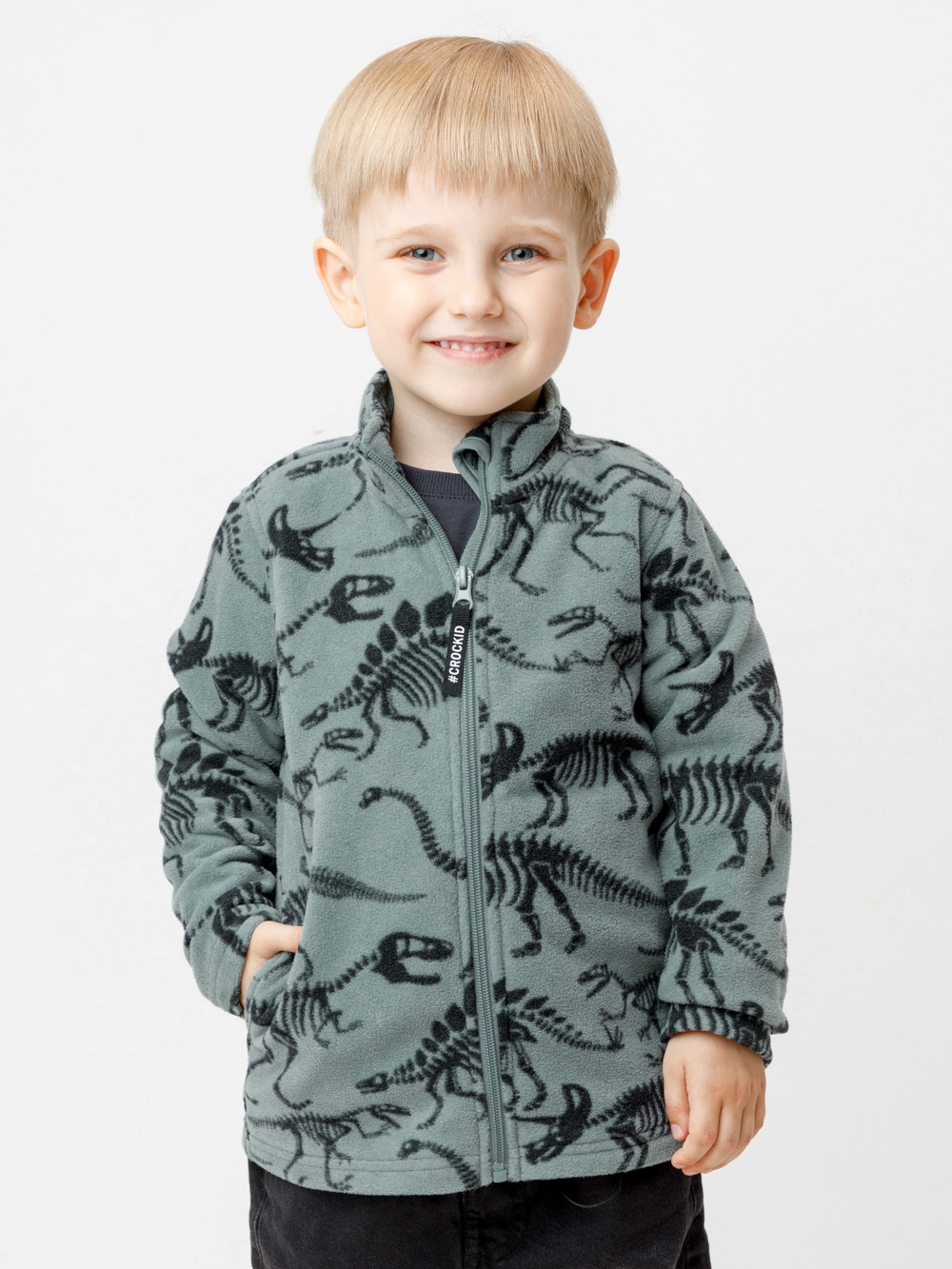 Флисовая куртка для мальчика. У изделия высокий воротник и застёжка на молнию с мягкой защитой шеи и подбородка. По бокам два кармана. Оригинальная набивка выполнена из стойких гипоаллергенных текстильных красителей. Куртка сохраняет цвет и форму после многократных стирок.
