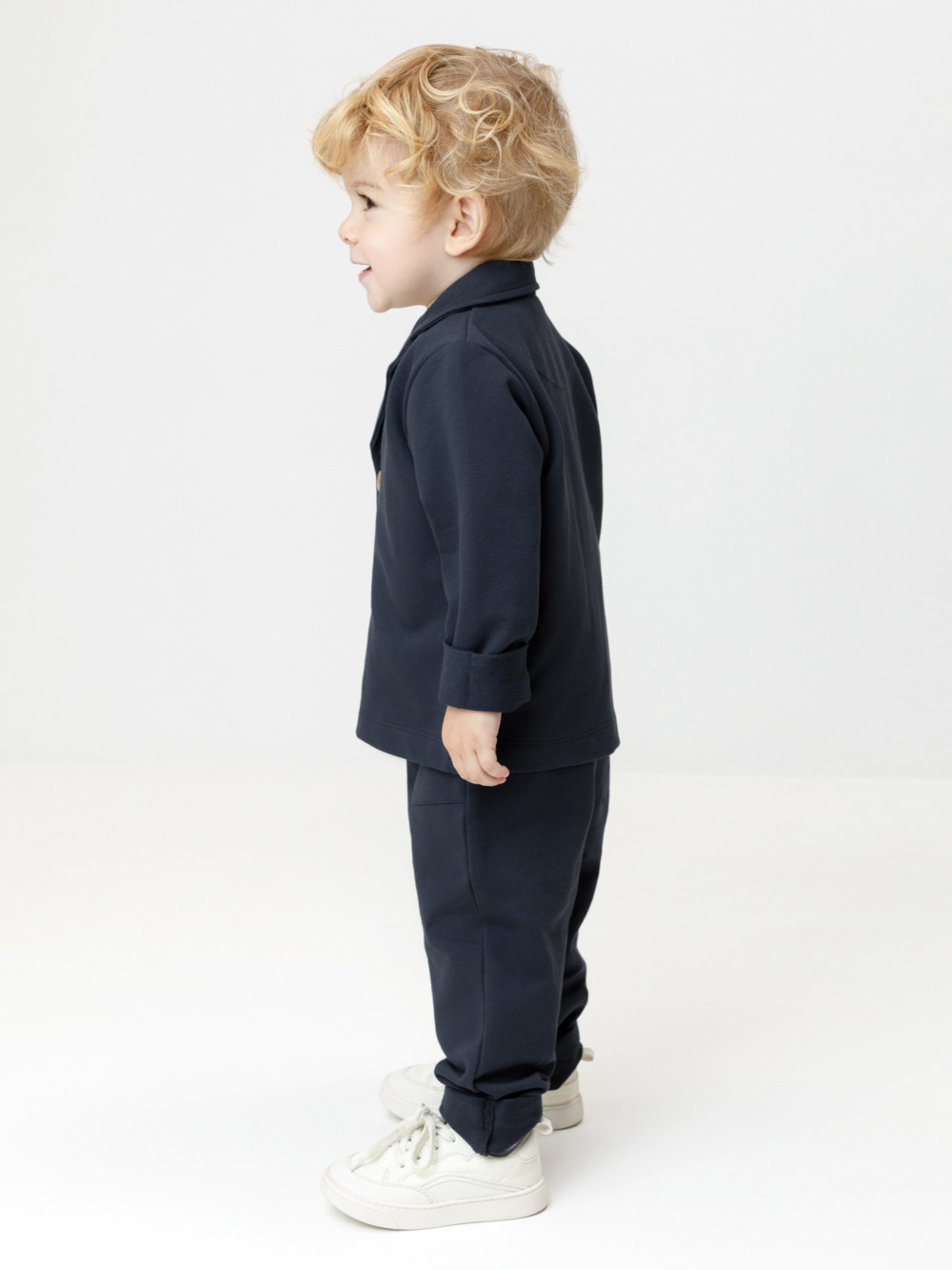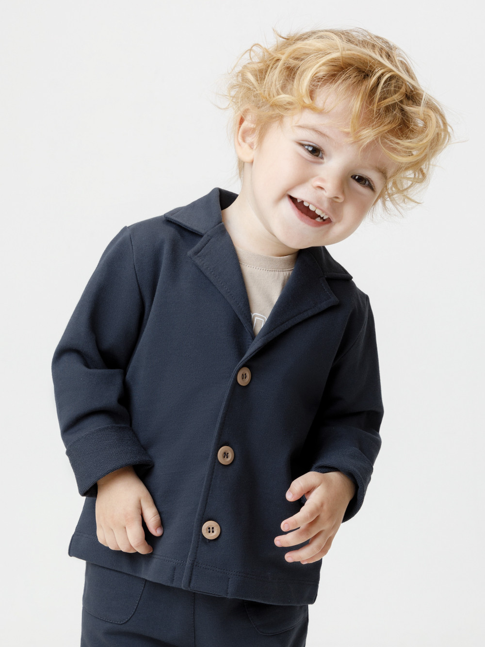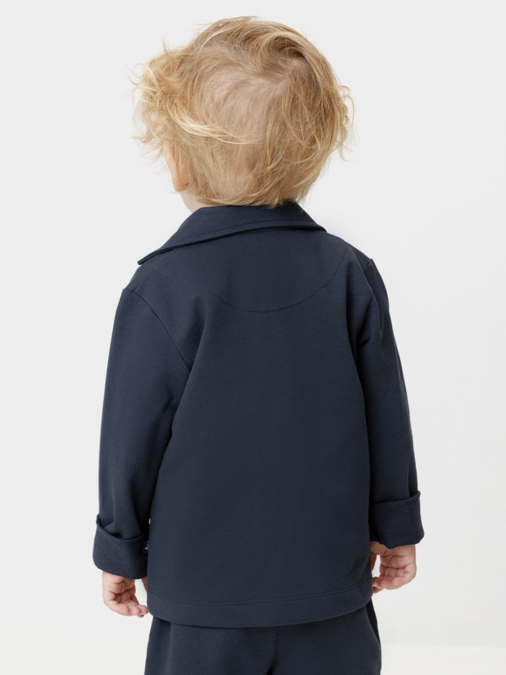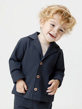 Трикотажный пиджак для мальчика из однотонного петельчатого футера. Спереди удобная застёжка на пуговицы. Изделие сохраняет цвет и форму после многократных стирок. Все трикотажные полотна производятся в соответствии с нормами швейцарского сертификата ЭкоТекс.