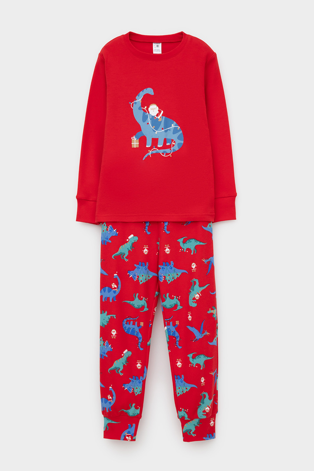 Трикотажный пижамный комплект из натурального хлопка. У джемпера длинные втачные рукава с мягкими манжетами. Брюки с удобным поясом на резинке и эластичными манжетами. Оригинальная набивка и принт выполнены из стойких, гипоаллергенных текстильных красителей. Все трикотажные полотна производятся в соответствии с нормами Швейцарского сертификата ЭкоТекс.