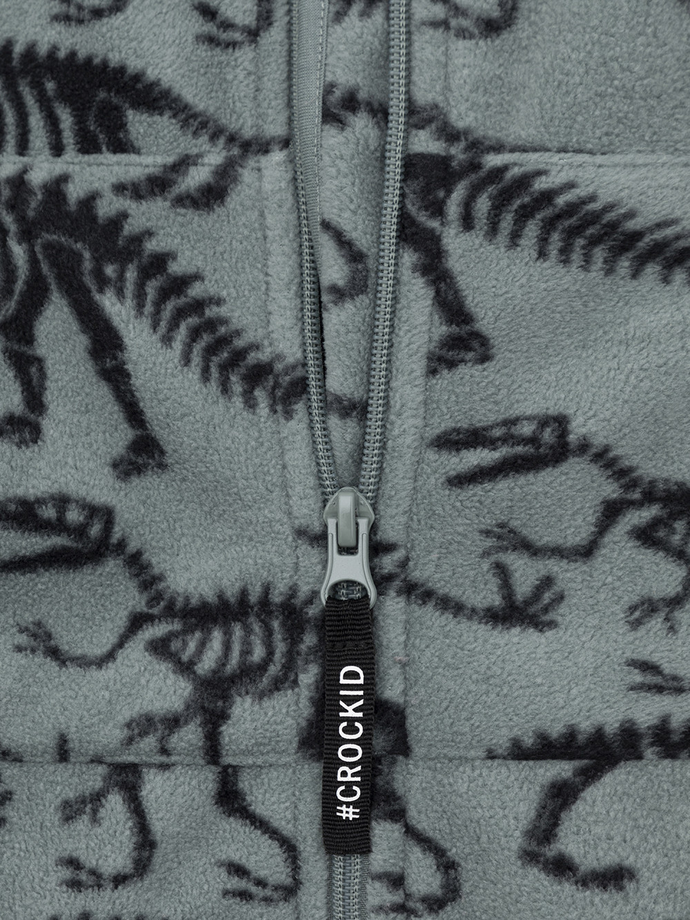 Флисовый комбинезон для мальчика с высоким воротником. Застёгивается на удлинённую молнию с мягкой защитой шеи и подбородка. Рукава и низ изделия на манжетах из  трикотажа в рубчик. Эластичная резинка по спинке обеспечивает идеальную посадку. Спереди удобный карман-кенгуру. Оригинальная набивка выполнена из стойких гипоаллергенных текстильных красителей. Комбинезон сохраняет цвет и форму после многократных стирок.