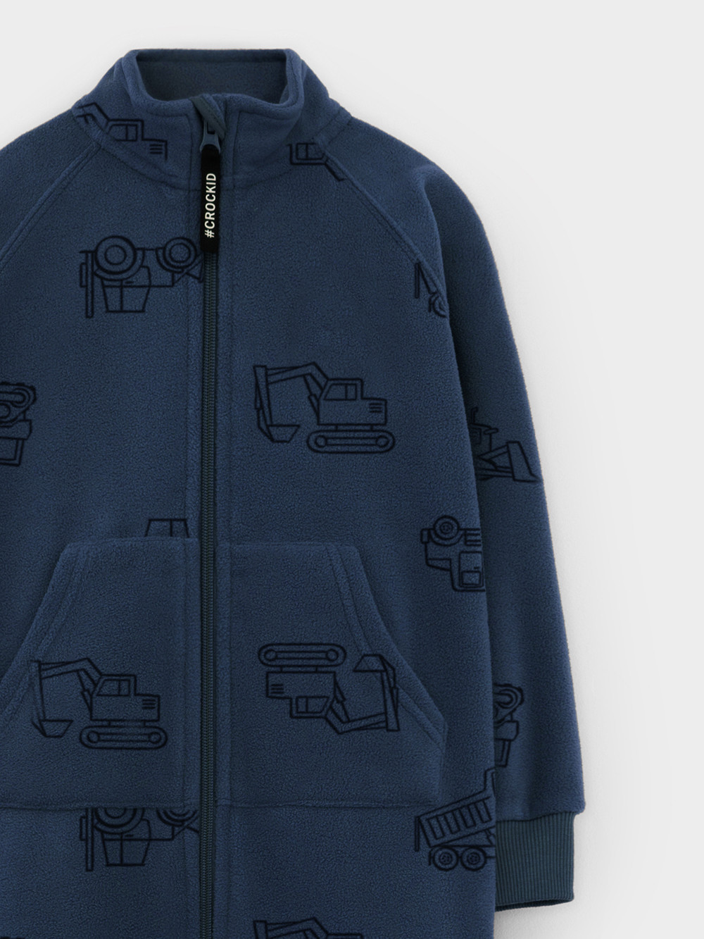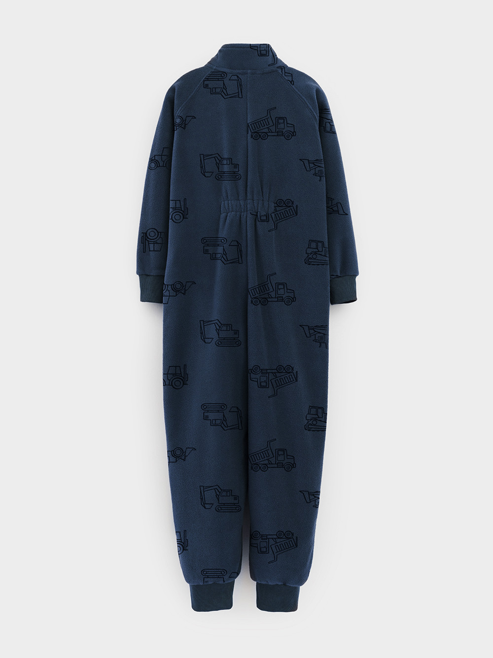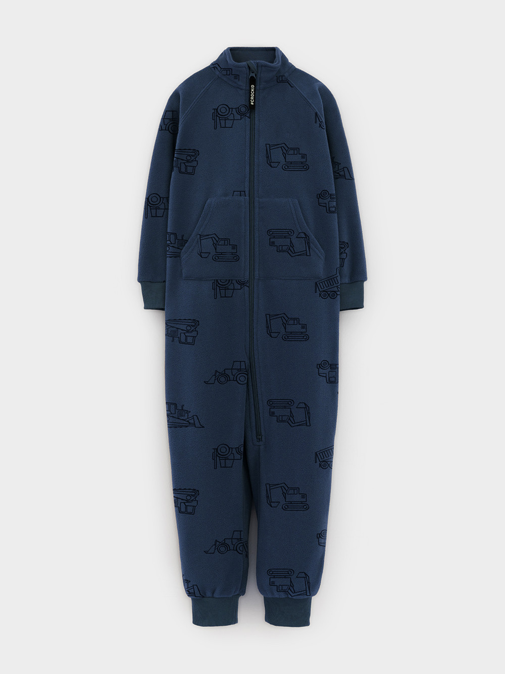 Флисовый комбинезон для мальчика с высоким воротником. Застёгивается на удлинённую молнию с мягкой защитой шеи и подбородка. Рукава и низ изделия на манжетах из  трикотажа в рубчик. Эластичная резинка по спинке обеспечивает идеальную посадку. Спереди удобный карман-кенгуру. Оригинальная набивка выполнена из стойких гипоаллергенных текстильных красителей. Комбинезон сохраняет цвет и форму после многократных стирок.