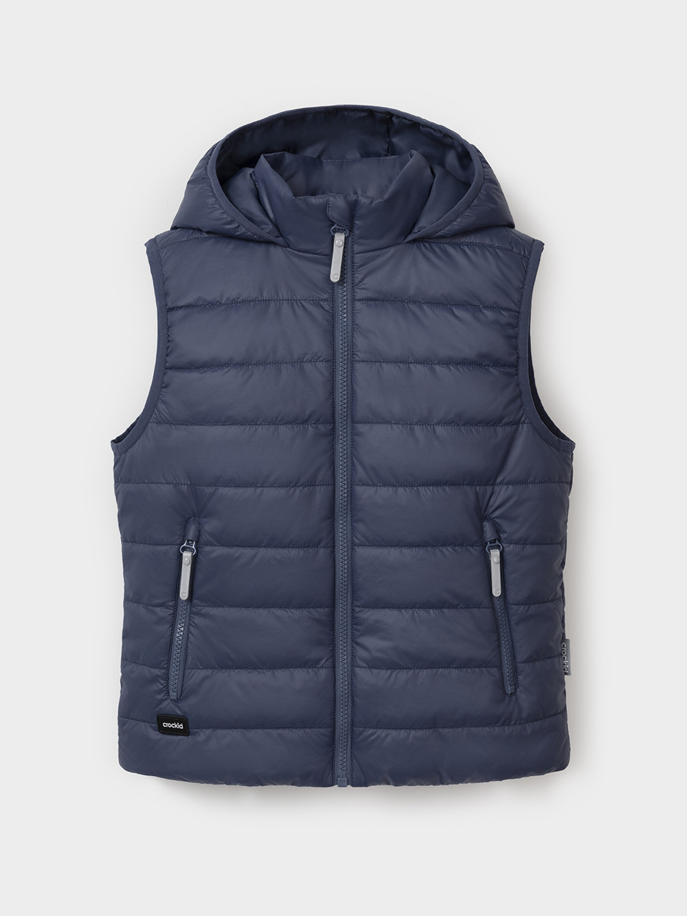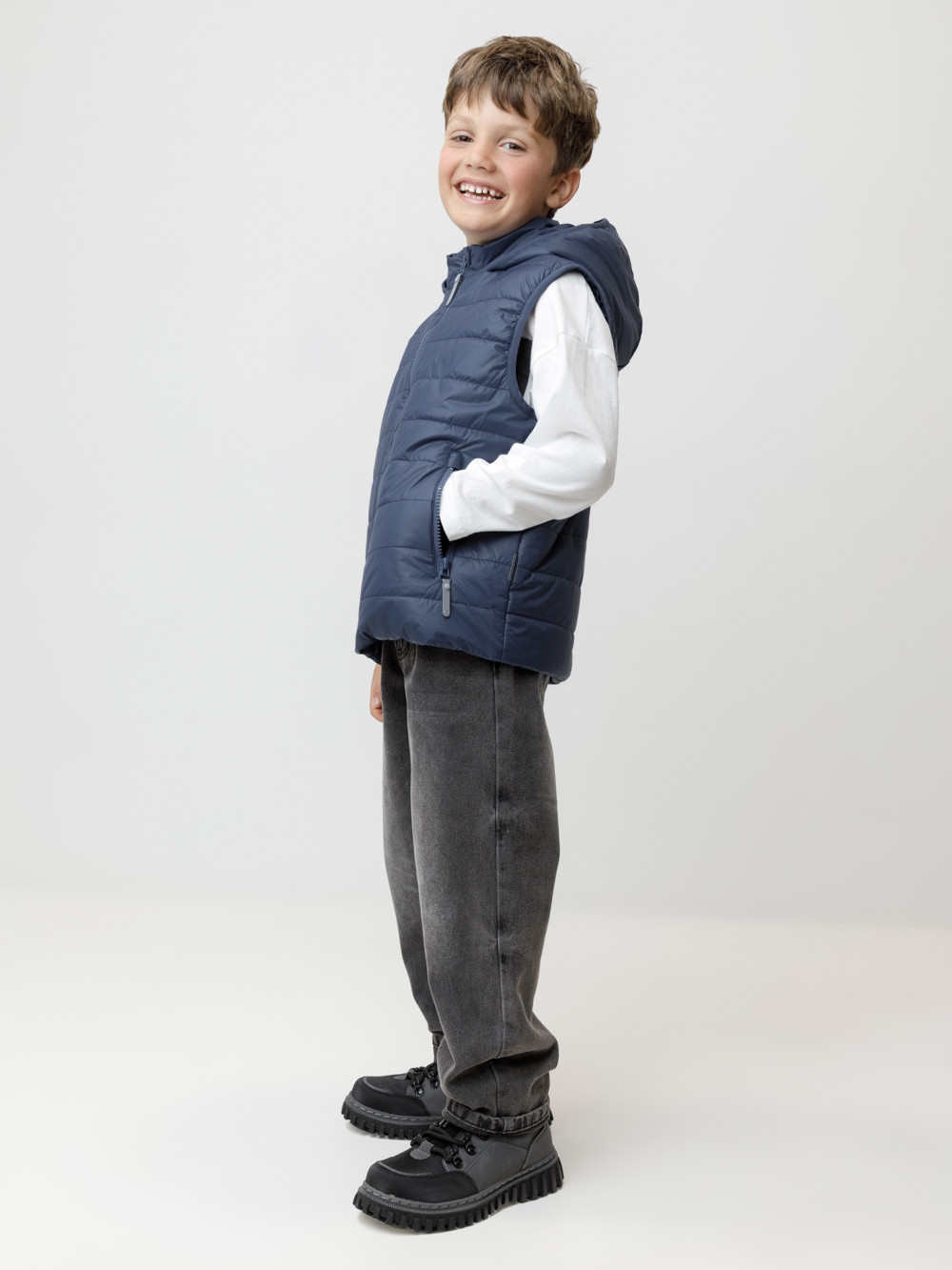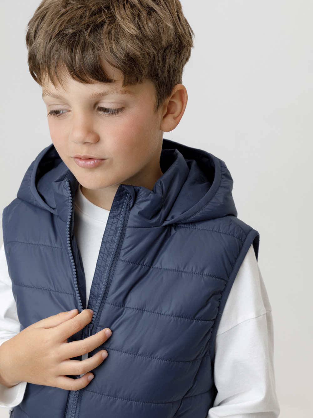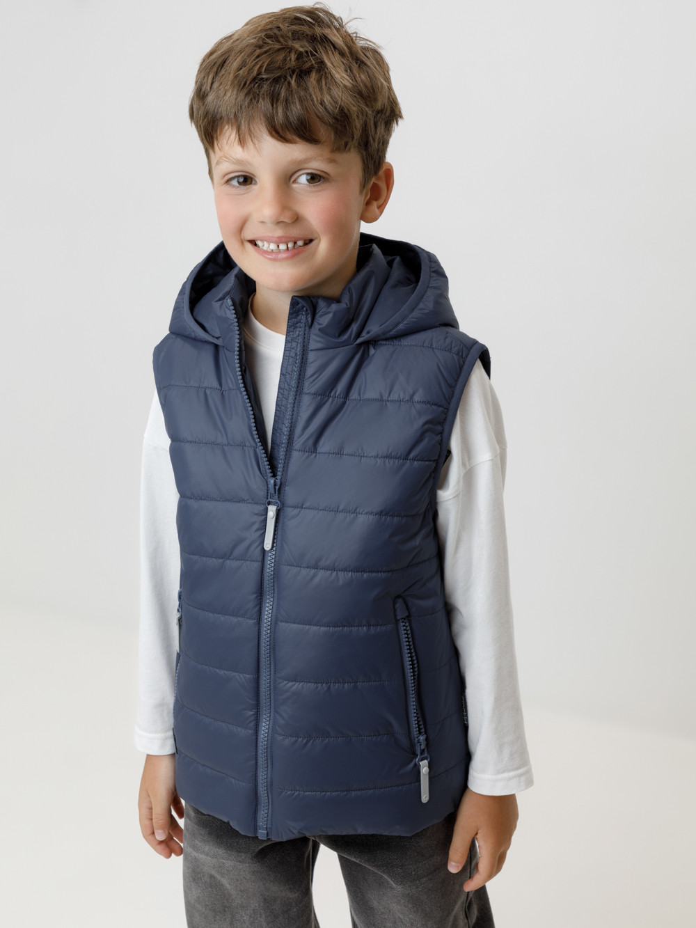 Стёганый жилет с капюшоном для мальчика с утеплителем Fellex®, 120 г/м2. Выполнен из мембранной ткани с дополнительной тефлоновой обработкой. Данный вид обработки предохраняет изделие от загрязнения и лучше отводит влагу. Подклад из хлопка в размерах 86-92 и 92-98 и из полиэстера в размерах от 98-104 до 122-128. Капюшон не снимается. По краю капюшона и проймам обработка эластичным кантом для лучшего прилегания. Изделие застёгивается на молнию, предусмотрена защита подбородка. Два кармана по бокам на молниях. Во всех изделиях верхнего ассортимента для безопасности ребёнка предусмотрены светоотражающие элементы.