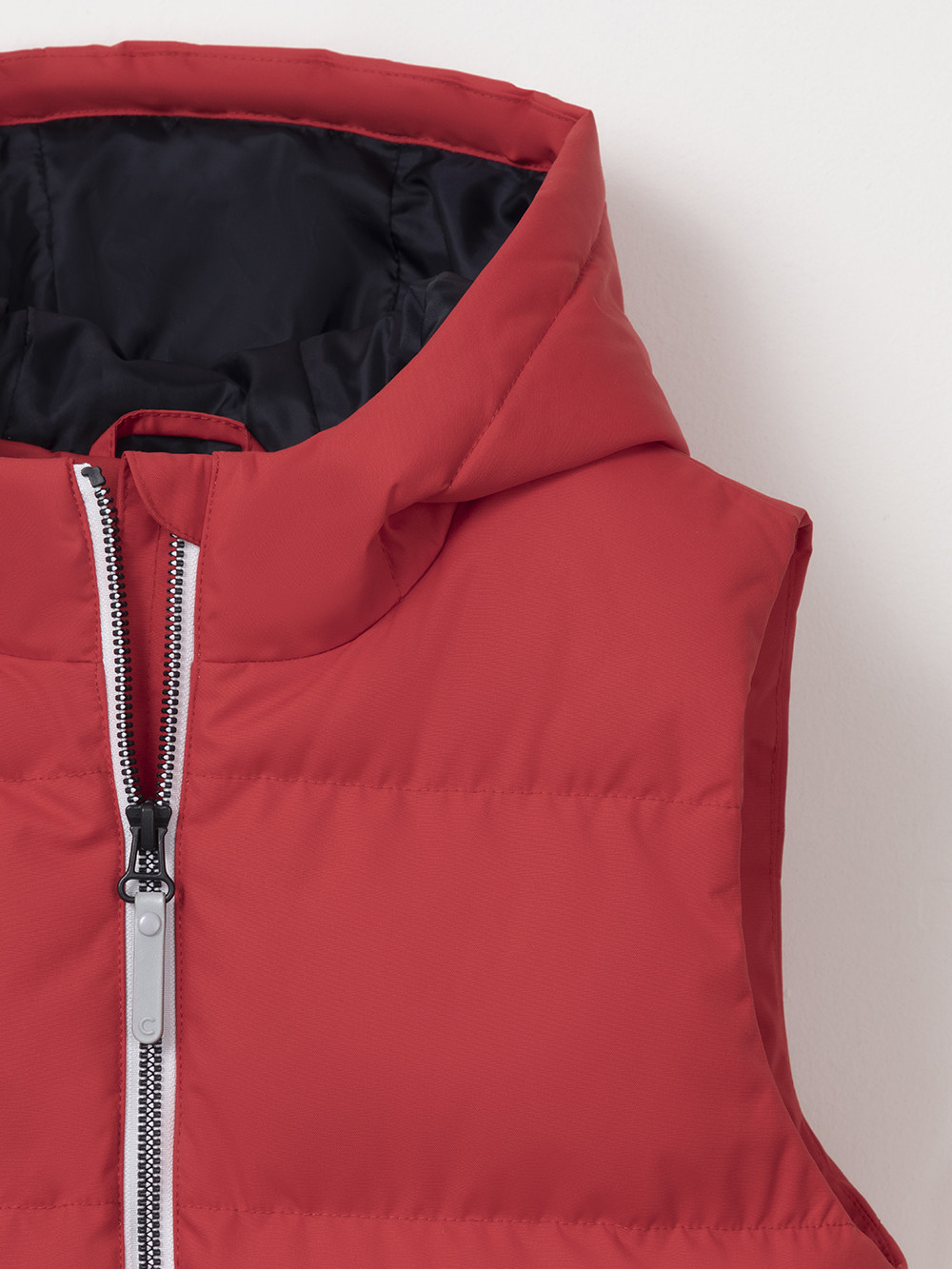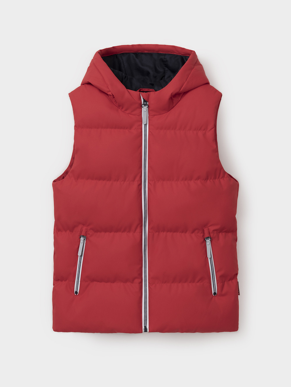Стёганый жилет с капюшоном для мальчика с утеплителем, 120 г/м2. Выполнен из мембранной ткани с дополнительной тефлоновой обработкой. Данный вид обработки предохраняет изделие от загрязнения и лучше отводит влагу. Подклад из 100% полиэстра. Капюшон не снимается. Изделие застёгивается на молнию, предусмотрена защита подбородка. Два кармана по бокам застёгиваются на молнии. Во всех изделиях верхнего ассортимента для безопасности ребёнка предусмотрены светоотражающие элементы.