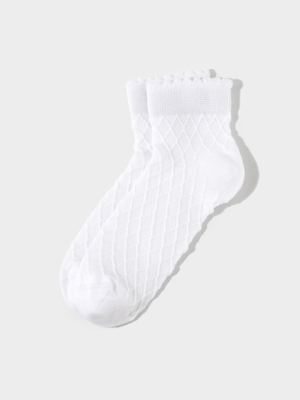 Носки короткие для девочки с формованной пяткой и эластичной резинкой по краю. Связаны ажурным геометрическим узором.