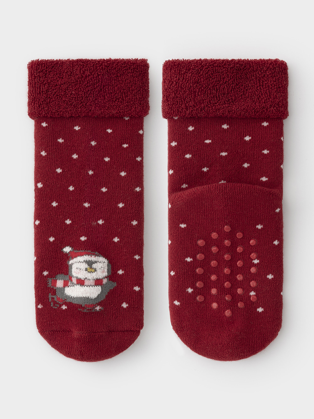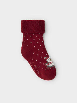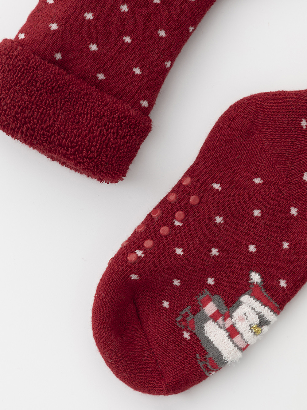 Тёплые махровые носки с формованной пяткой и отворотом по краю. На подошве резиновые стопперы. Украшены рисунком. Отлично подойдут для создания праздничных образов или как дополнение к подарку на Новый год и Рождество. Изделие сохраняет форму и стойкий цвет после многочисленных стирок.