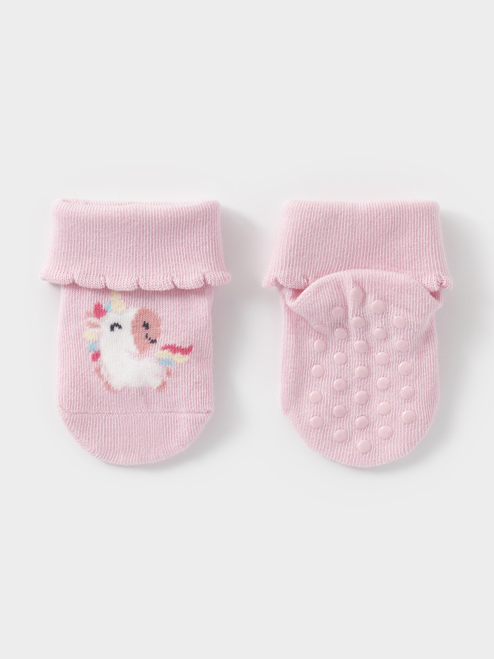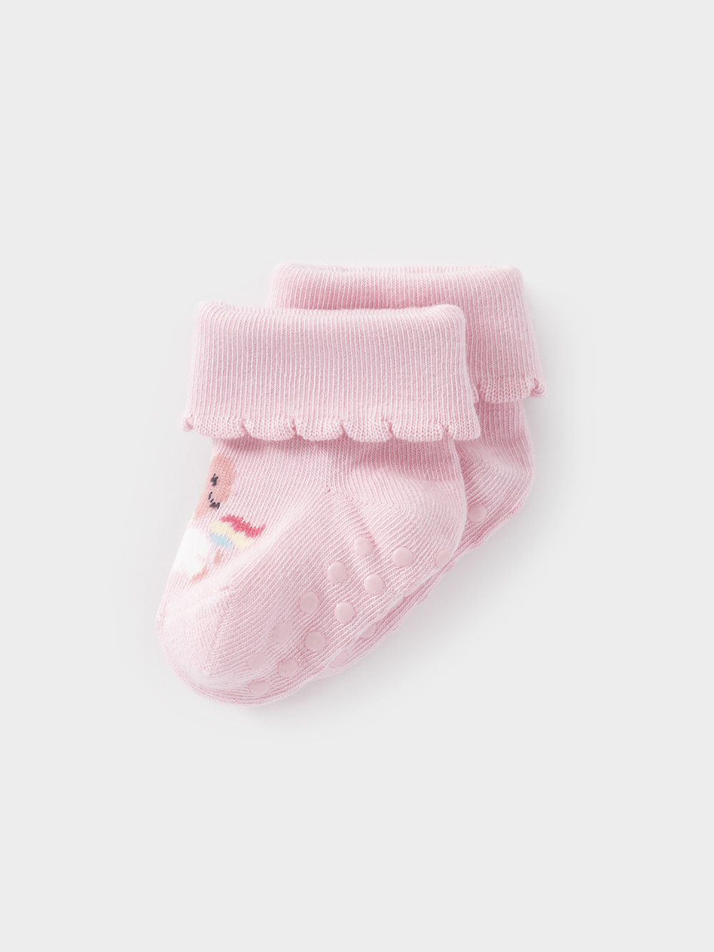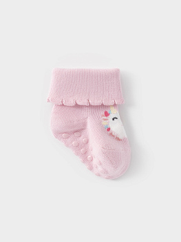 Носки детские с формованной пяткой и отворотом. Украшены рисунком. На стопе противоскользящие стопперы. Изделие сохраняет форму и стойкий цвет после многочисленных стирок.