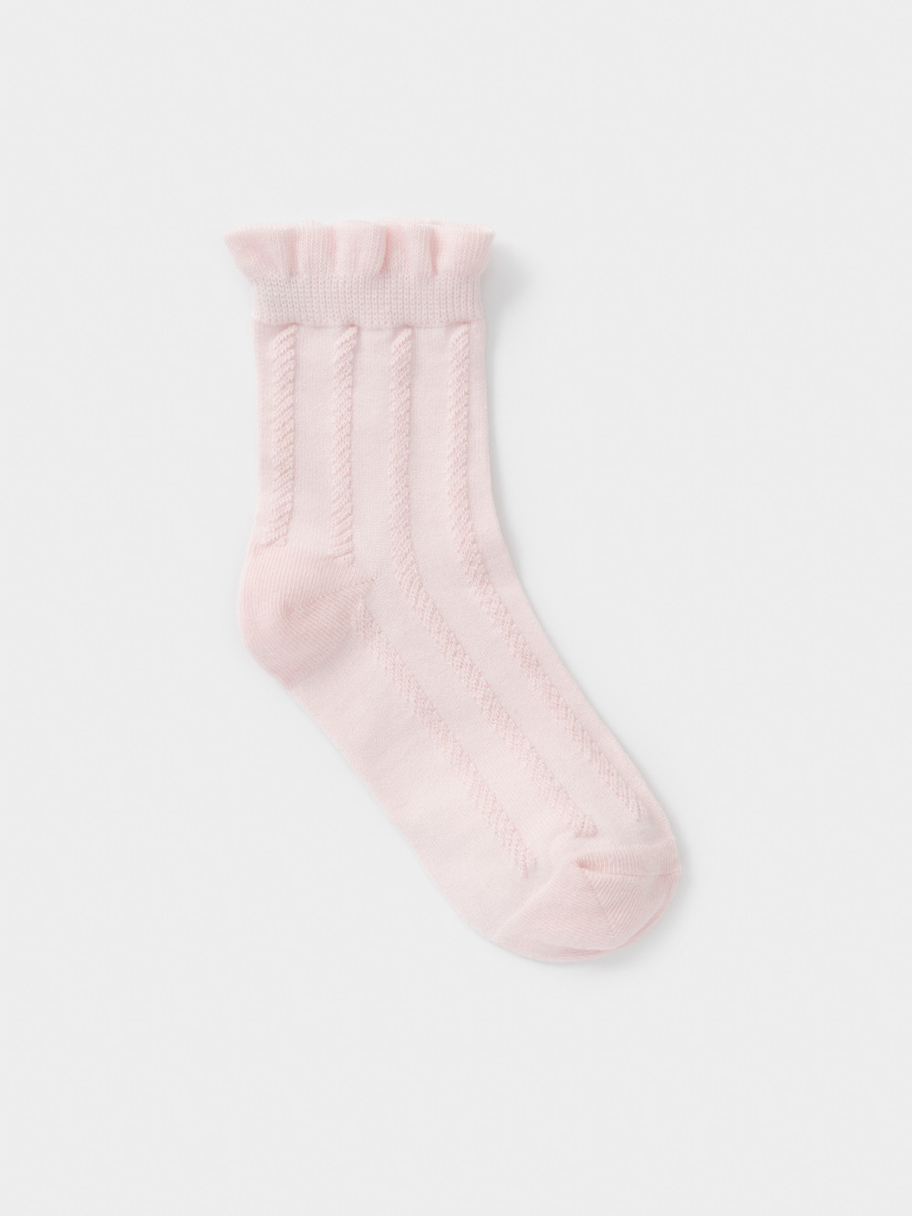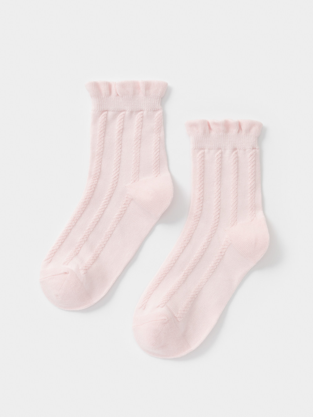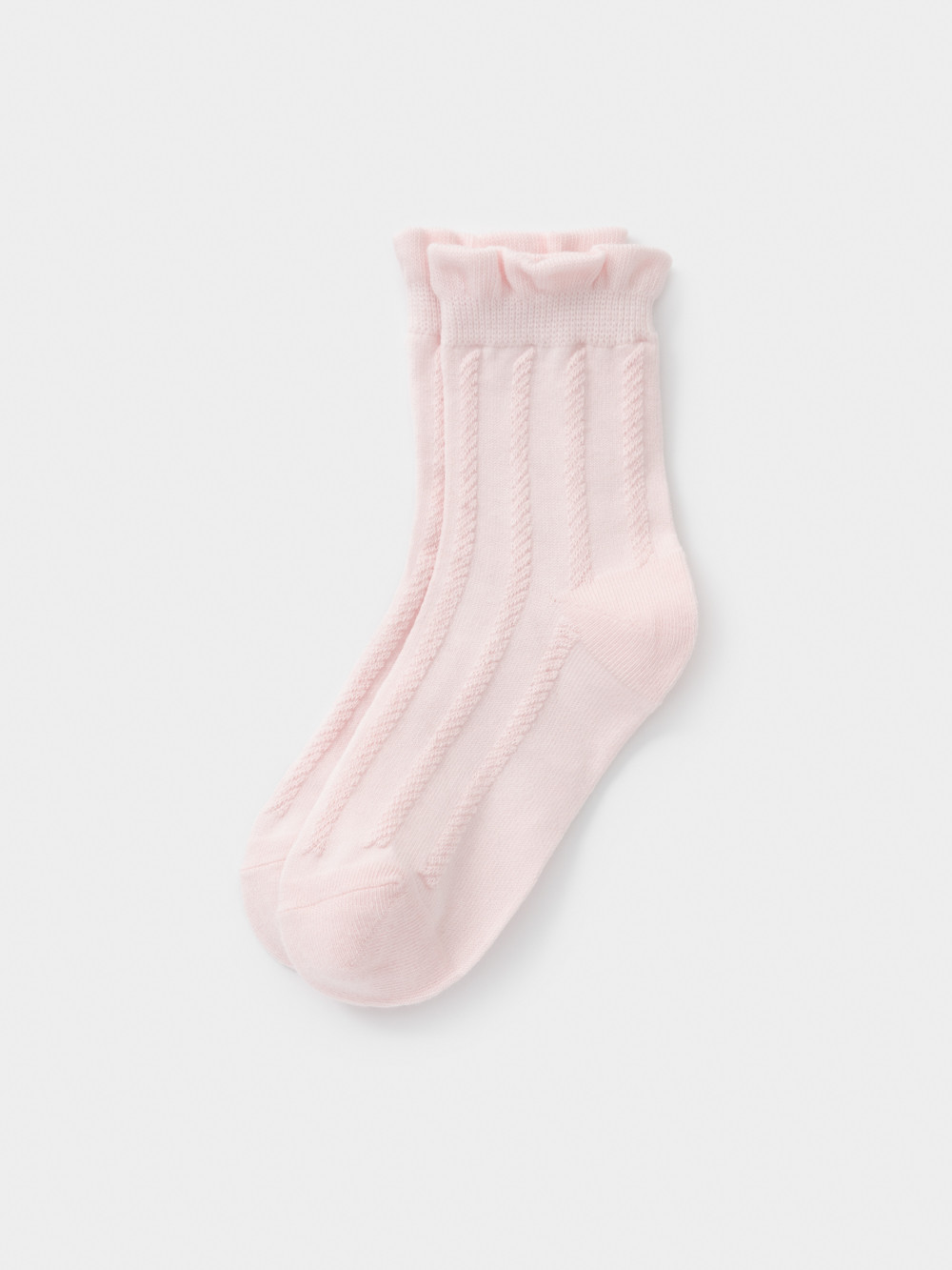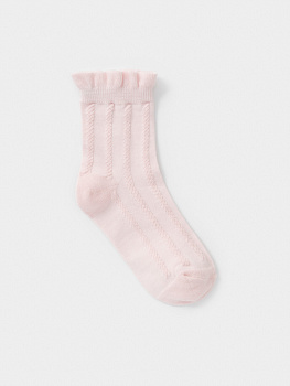 Носки длинные детские с формованной пяткой и эластичной резинкой с рюшей по краю. Украшены рельефным узором. Изделие сохраняет форму и стойкий цвет после многочисленных стирок.
