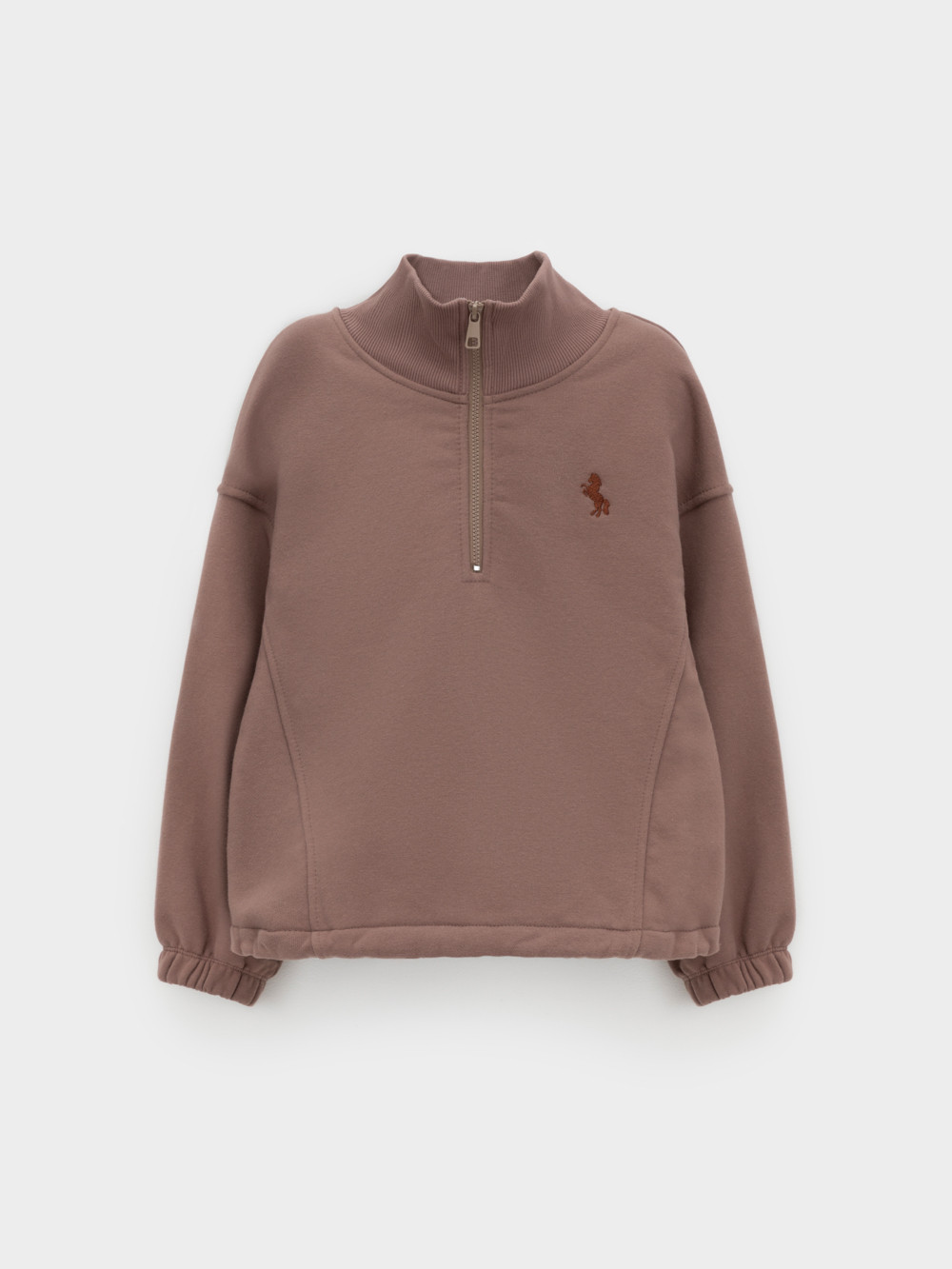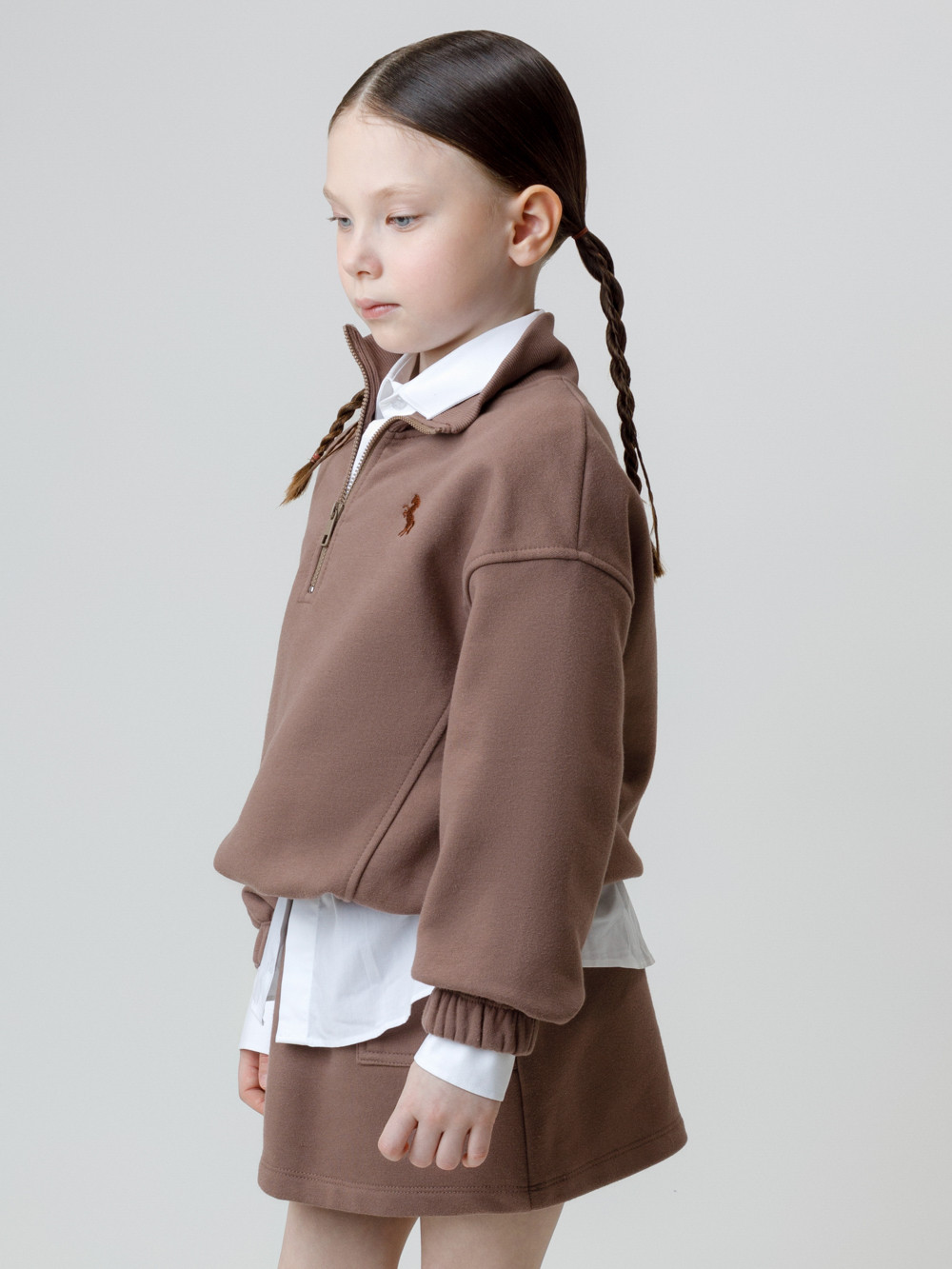 Мягкий свитшот с вышивкой для девочки. Изготовлен из высококачественного футера петли трёхнитки. Спереди застёгивается на короткую металлическую молнию. Воротник выполнен из эластичного полотна в рубчик. Рукава со спущенными плечами и низ изделия собраны на резинку. Свитшот сохраняет форму и стойкий цвет после многочисленных стирок и идеально подходит на каждый день. Все трикотажные полотна производятся в соответствии с нормами швейцарского сертификата ЭкоТекс.