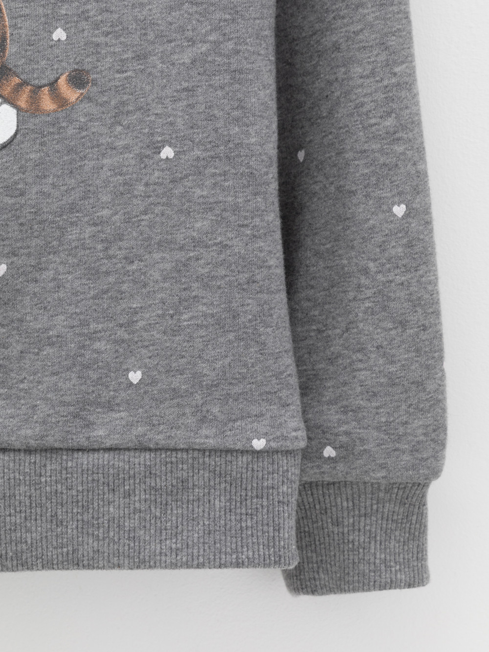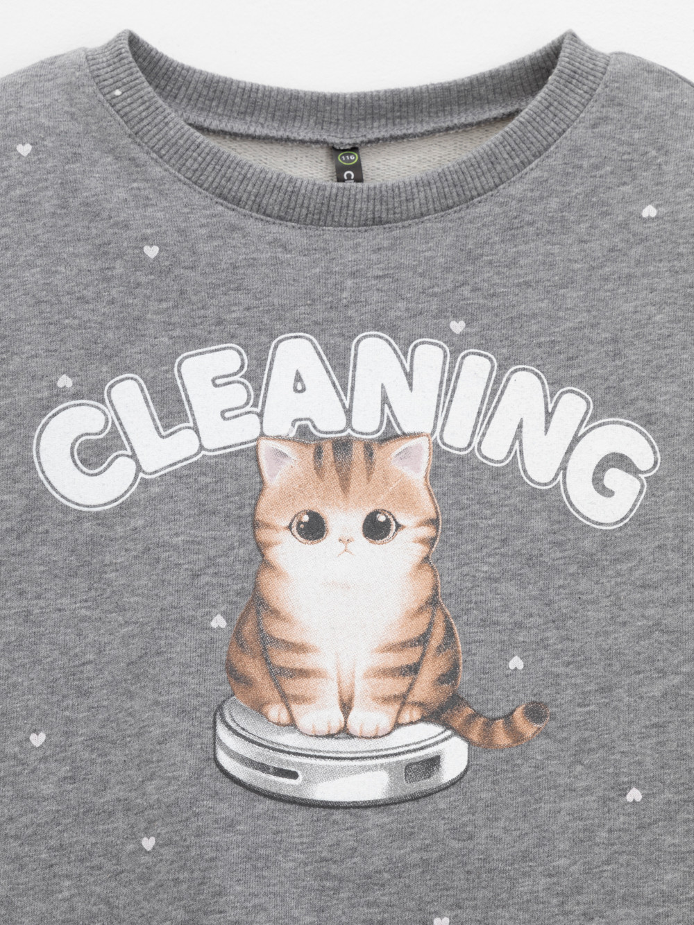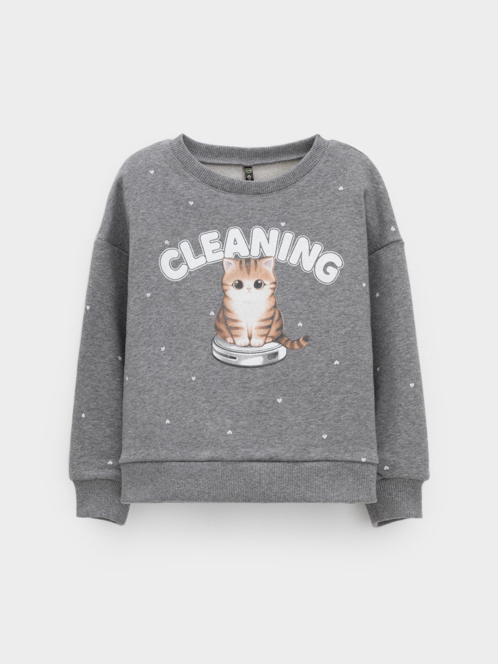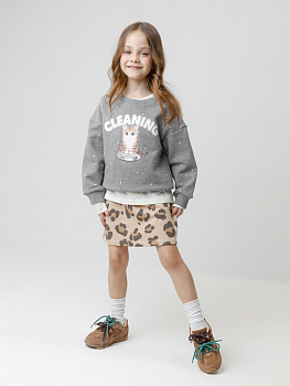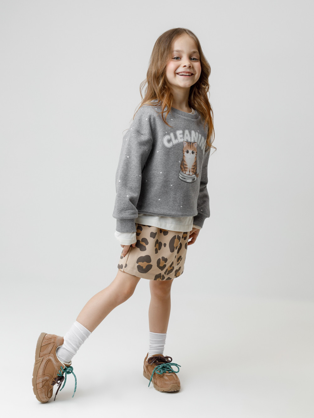 Свитшот для девочки из мягкого петельчатого трикотажа. В составе 80% натурального хлопка и 20% полиэстера, при этом полиэстер ввязан внутрь по особой технологии и не соприкасается с кожей. В размерах 92 и 98 застёгивается на спине на кнопки. Манжеты и пояс выполнены из эластичного полотна. Оригинальный принт выполнен из стойких текстильных гипоаллергенных красителей. Изделие сохраняет цвет и форму после многократных стирок. Все трикотажные полотна производятся в соответствии с нормами швейцарского сертификата ЭкоТекс.