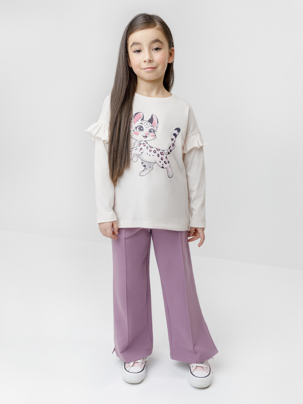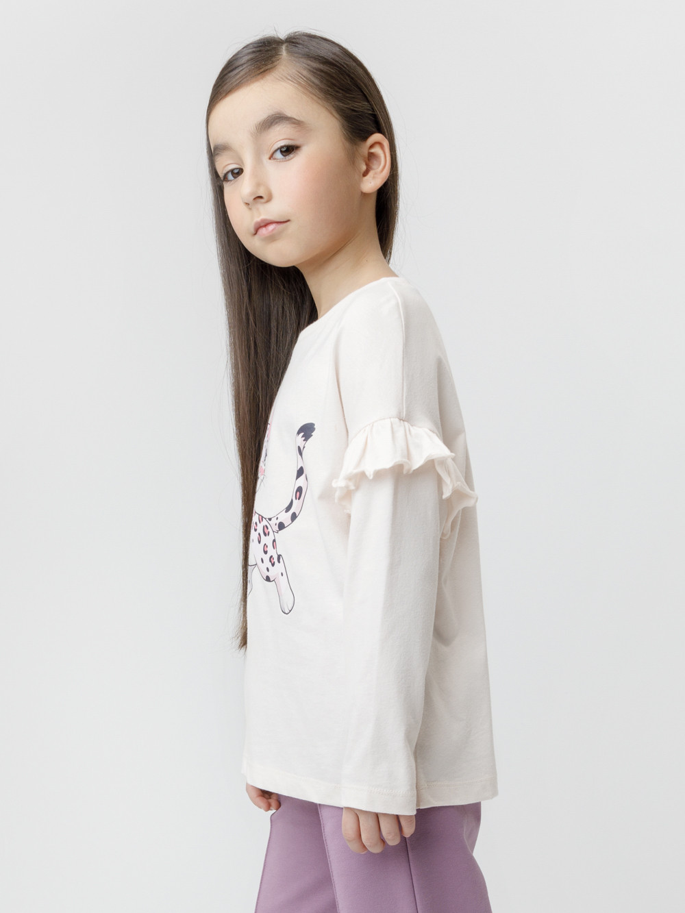Лонгслив для девочки с нарядными рюшами из высококачественного трикотажного полотна, изготовленного из натурального хлопка. Изделие сохраняет цвет и форму после многократных стирок. Все трикотажные полотна производятся в соответствии с нормами швейцарского сертификата ЭкоТекс.